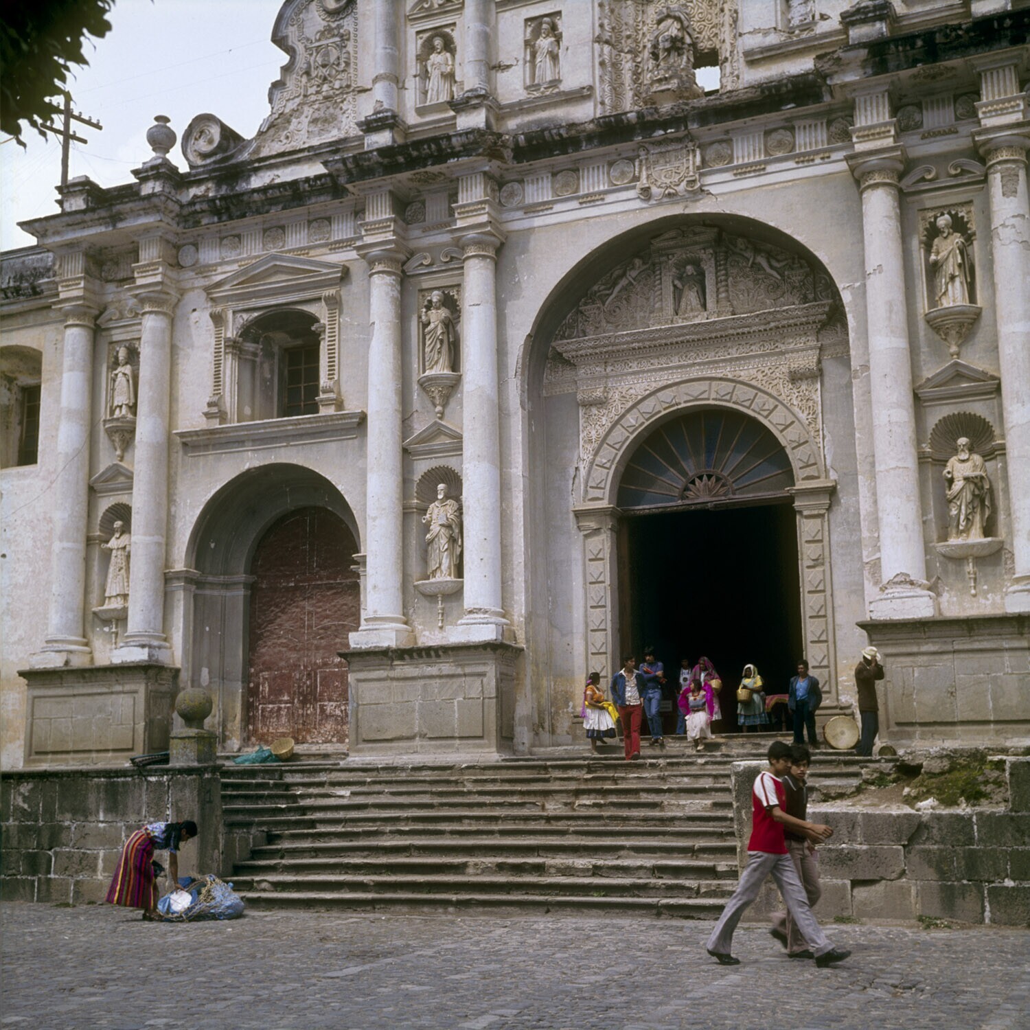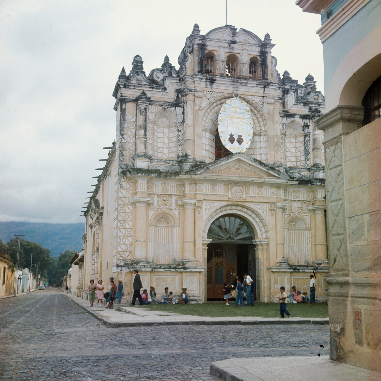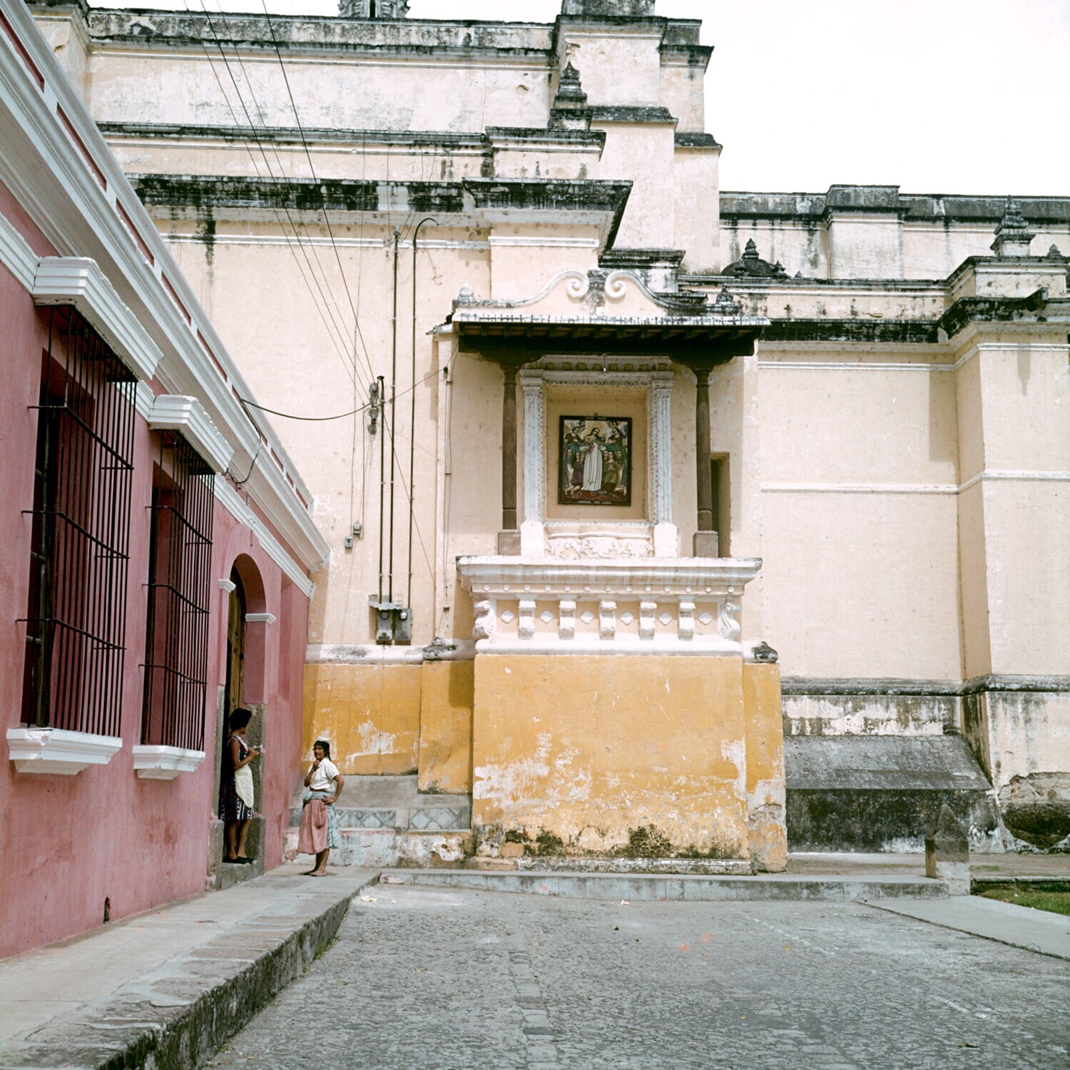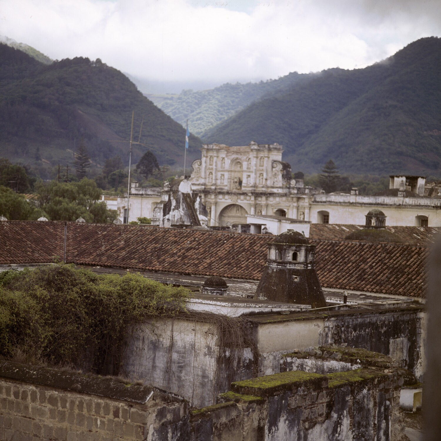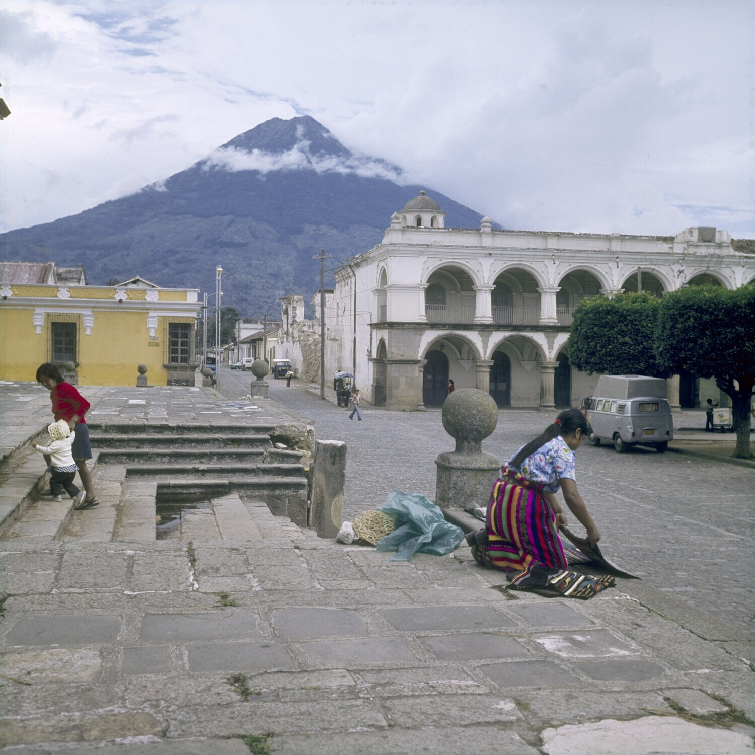 Straatbeeld Antigua, op de achtergrond de vulkaan Agua.
