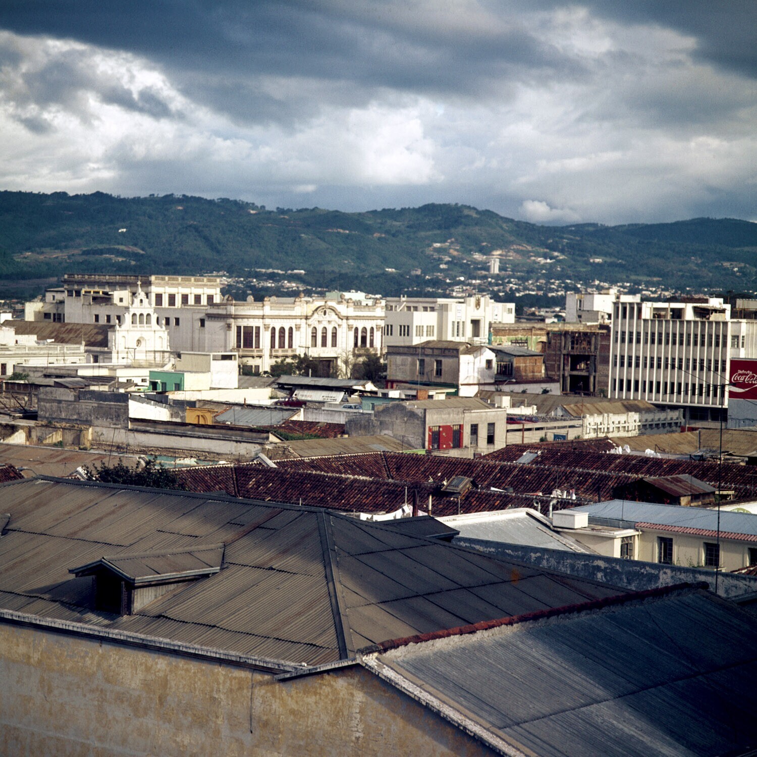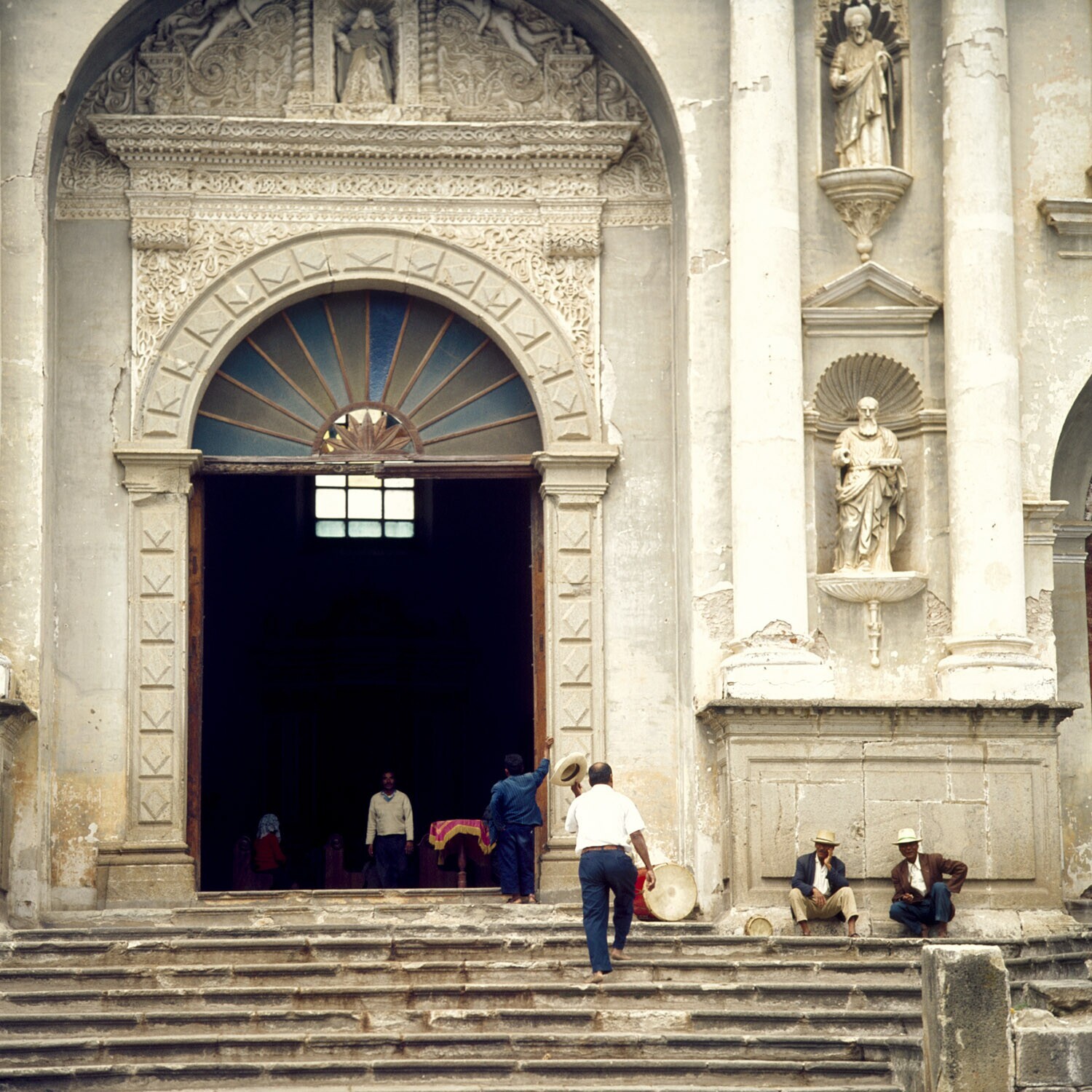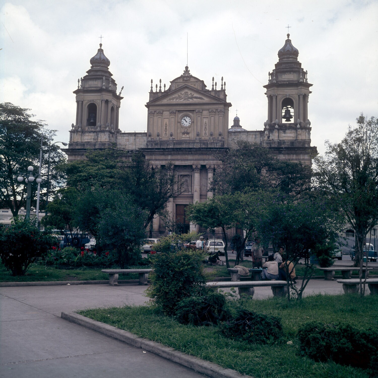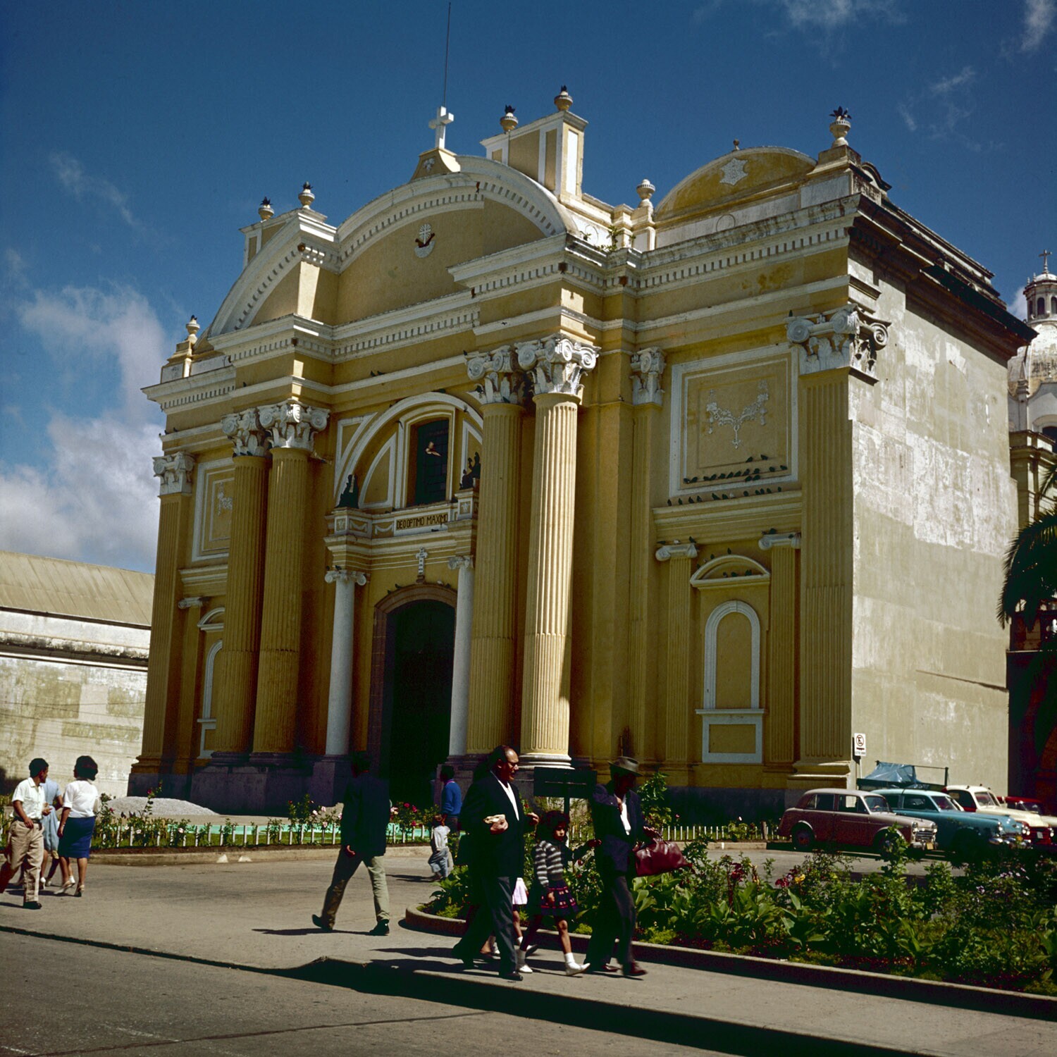 Straatbeeld Antigua, op de achtergrond de vulkaan Agua.