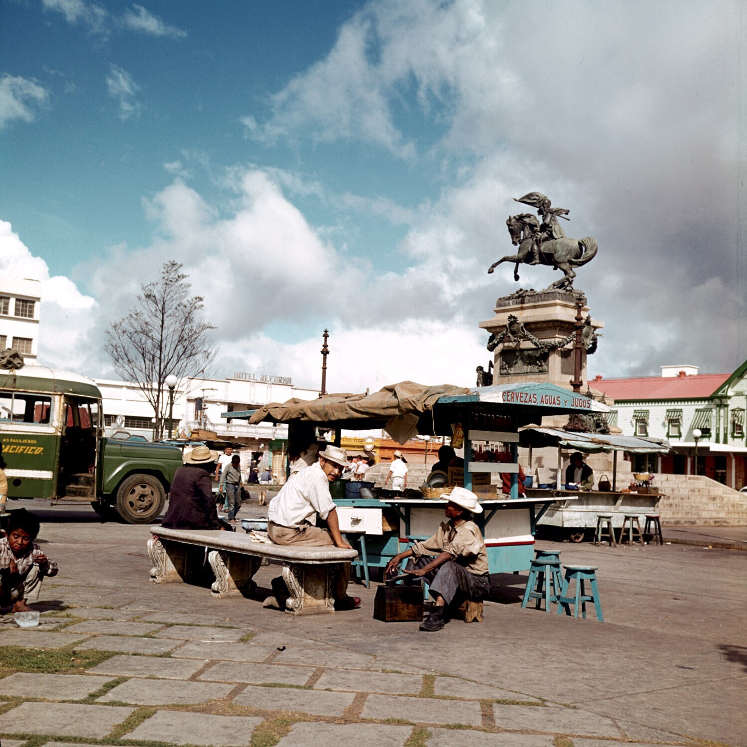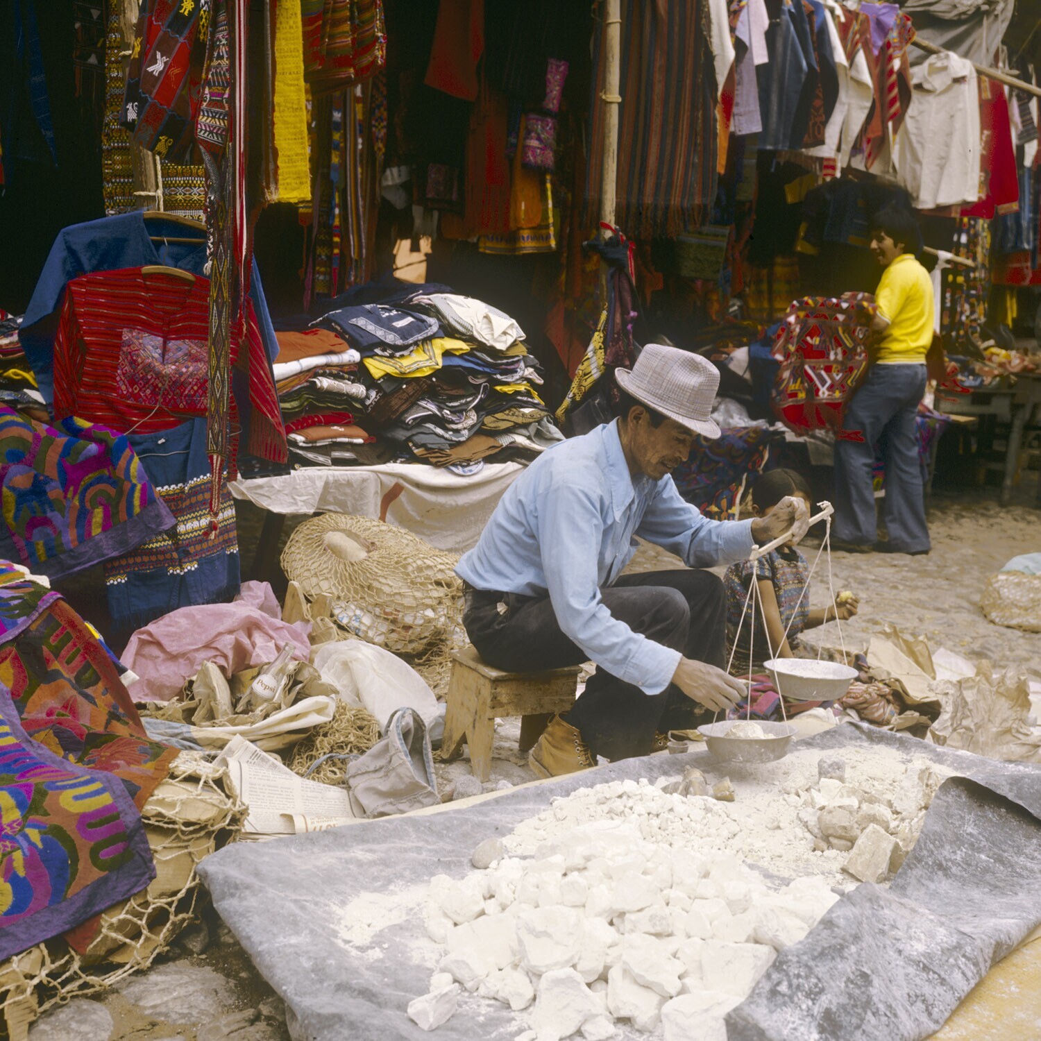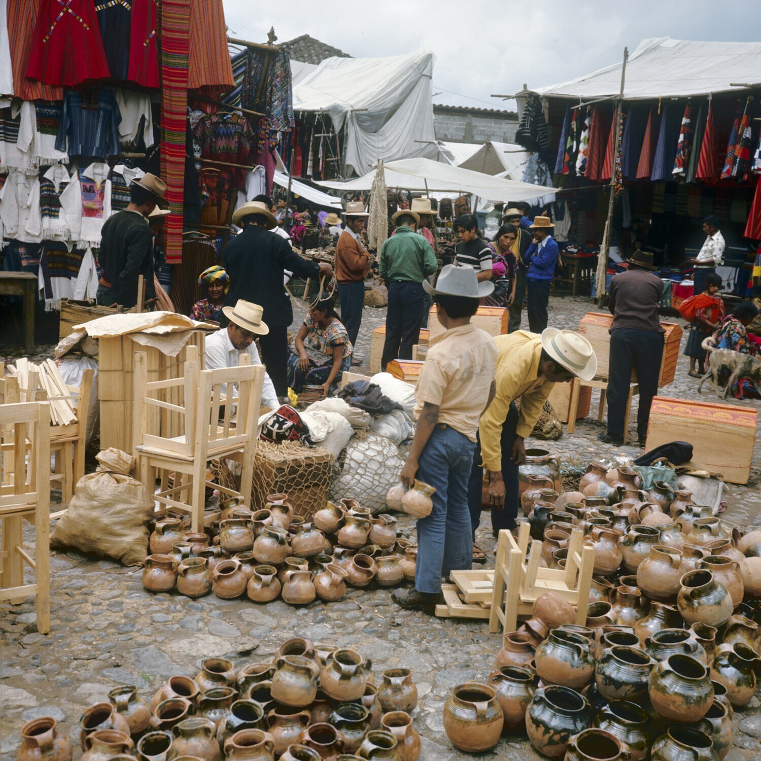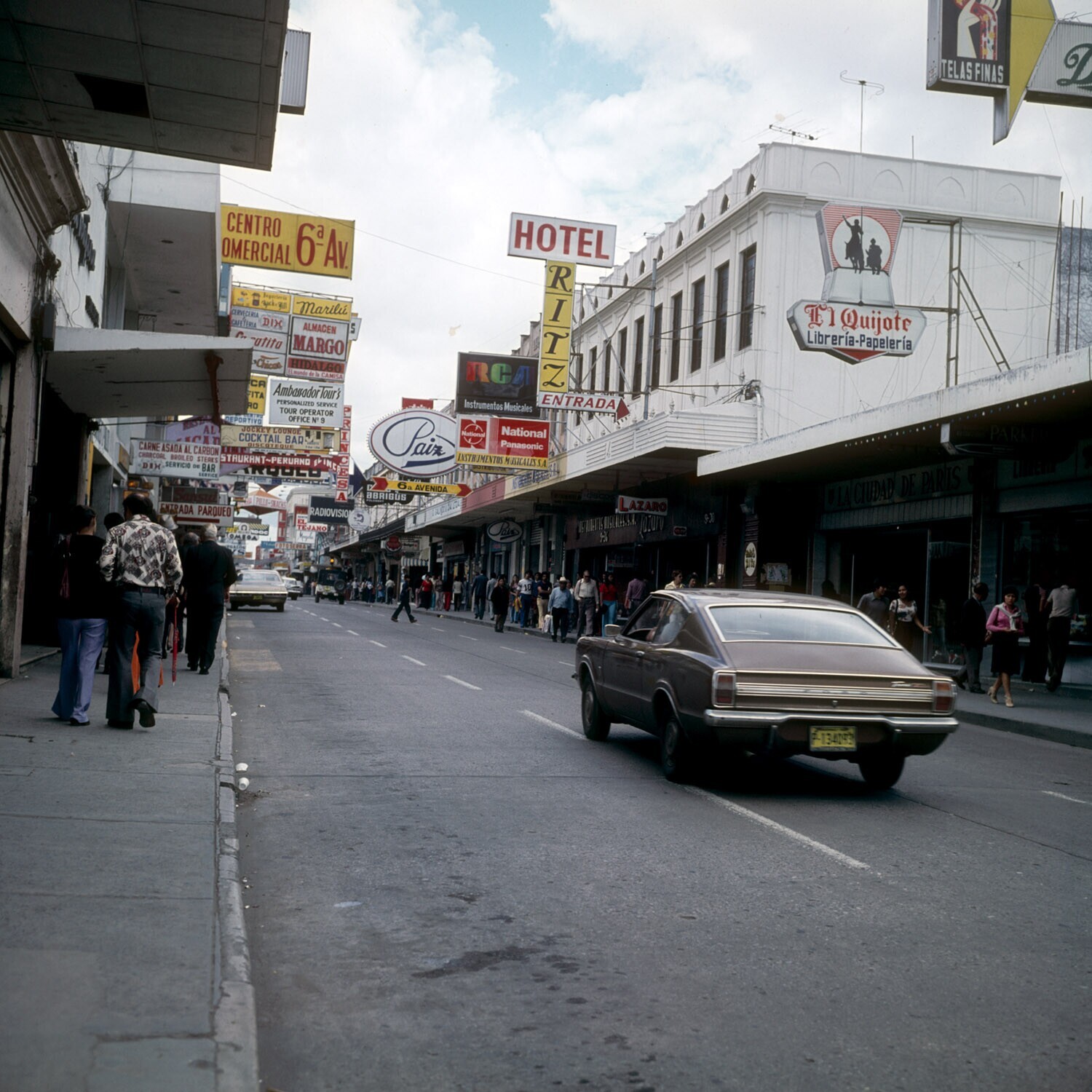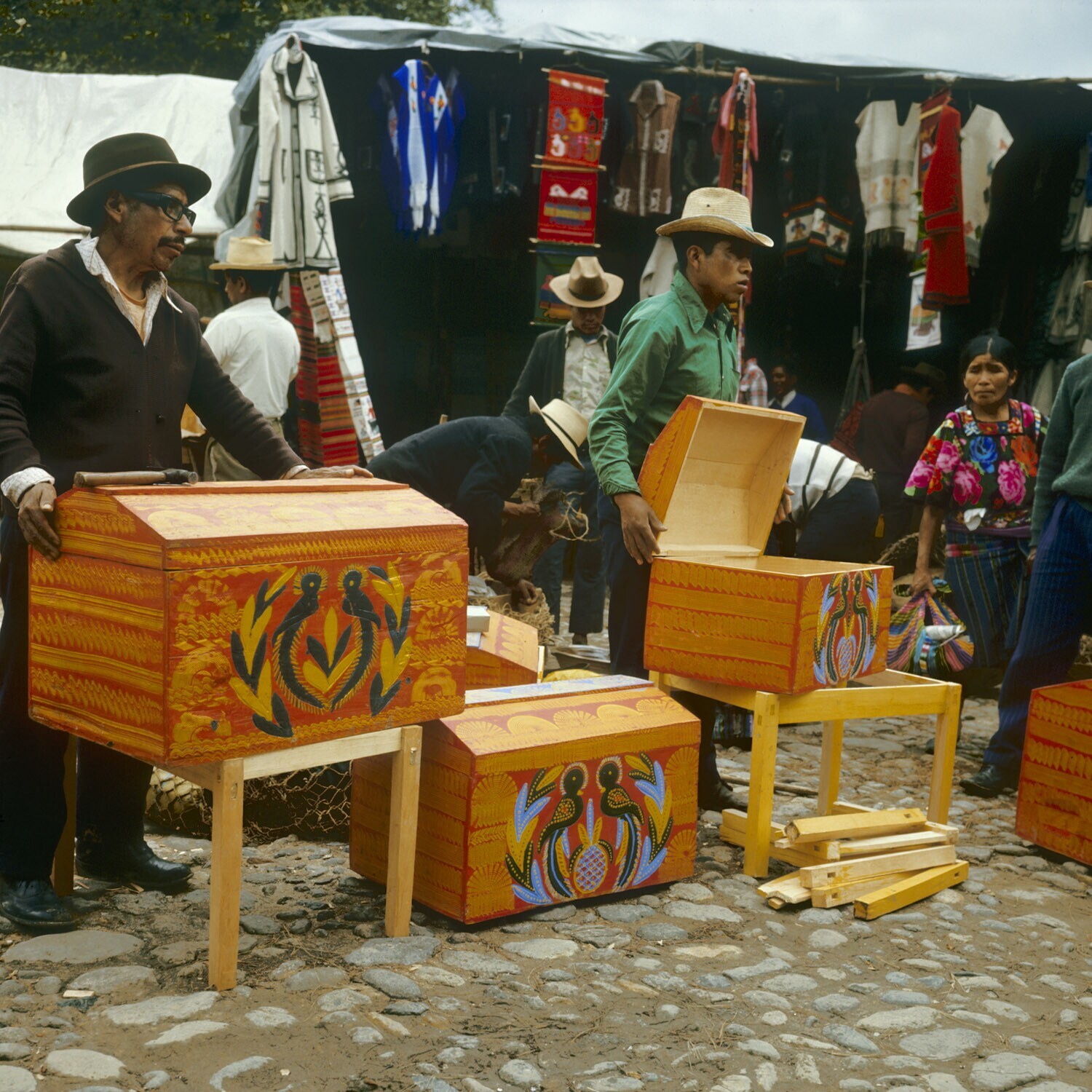 Straatbeeld Antigua, op de achtergrond de vulkaan Agua.