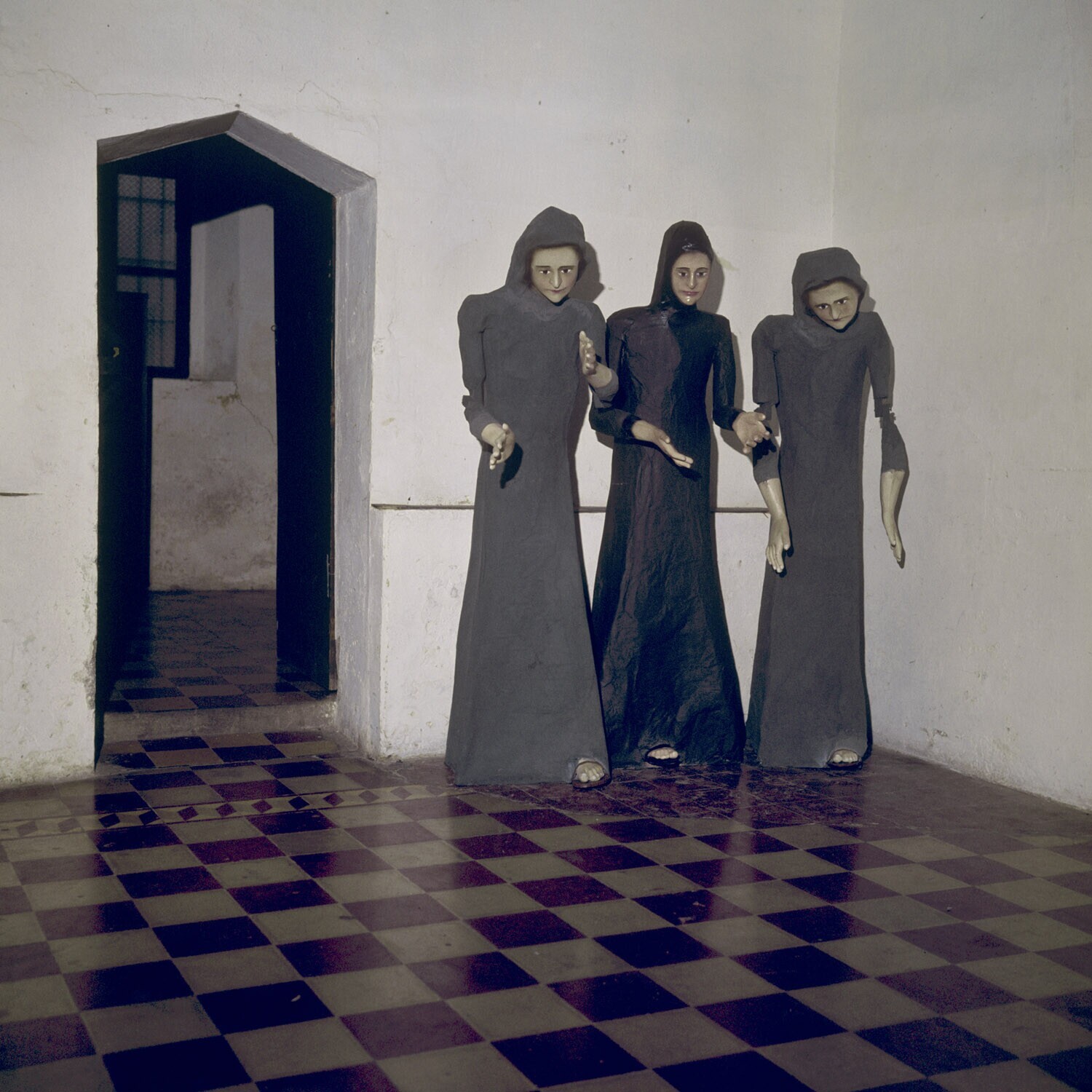 Drie poppen, voorstellende de nonnen van het vroeger...