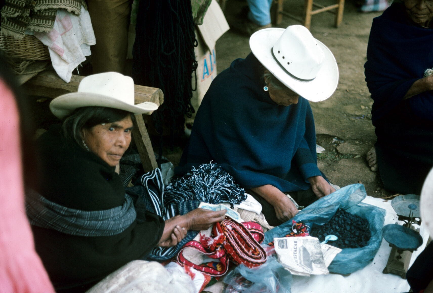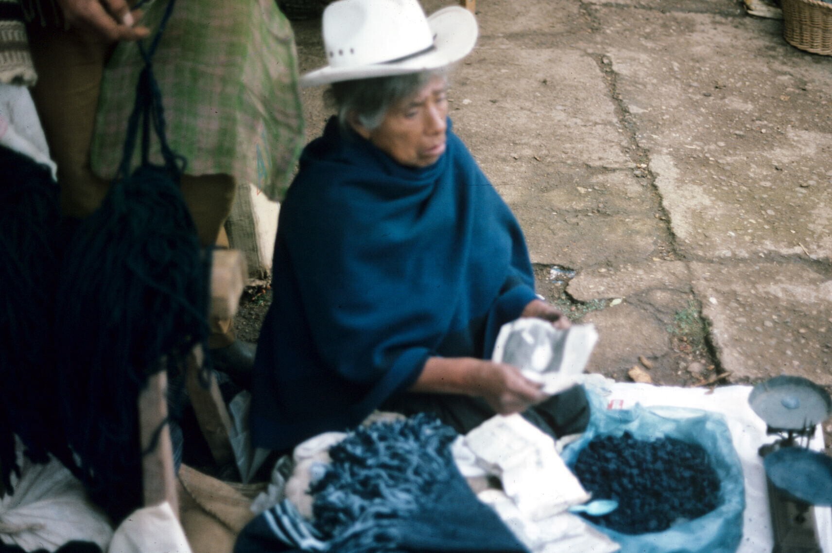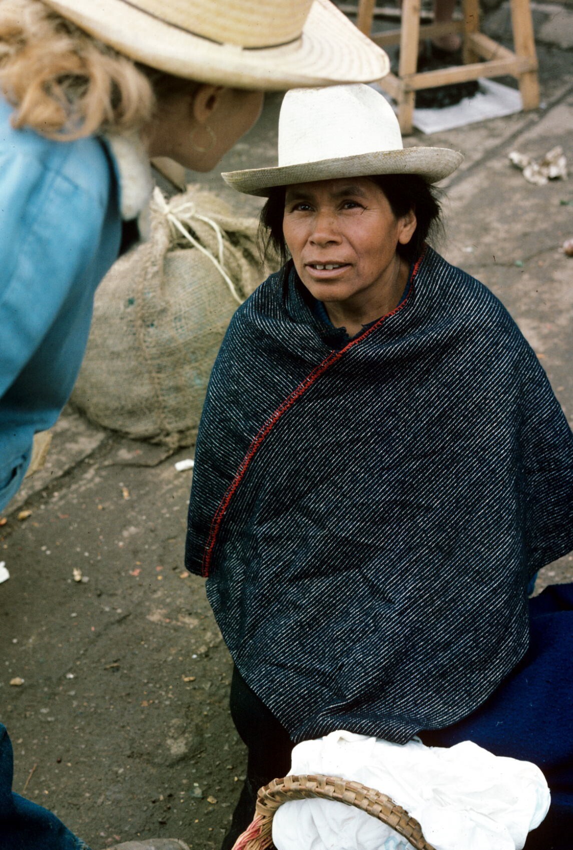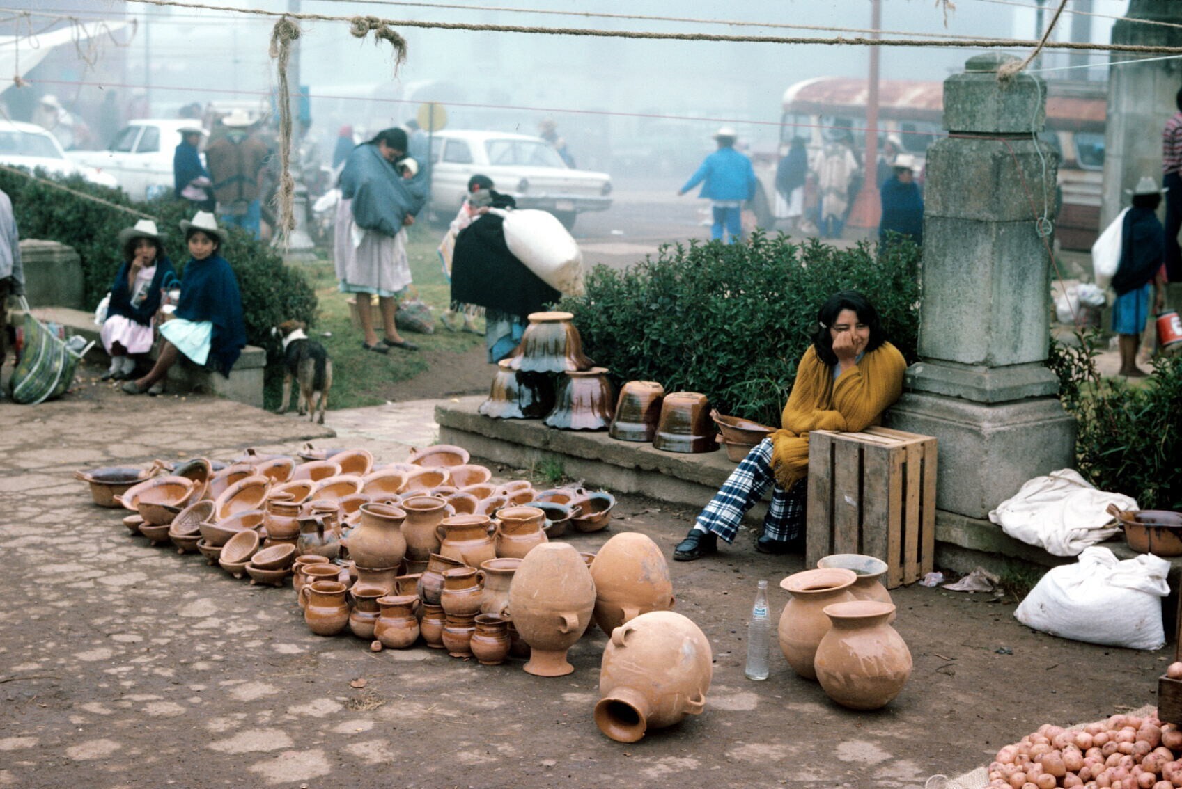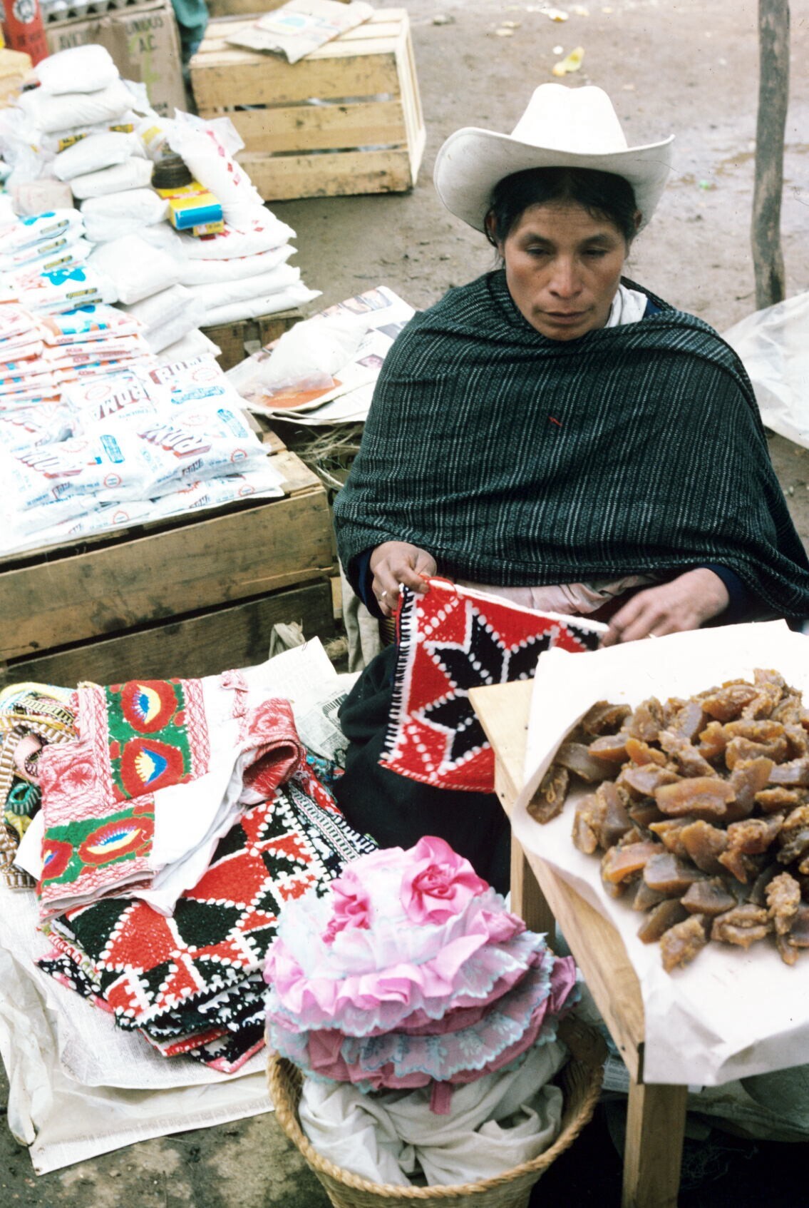 vrouw op markt, kindje op rug dragend in "mamal" (dr...