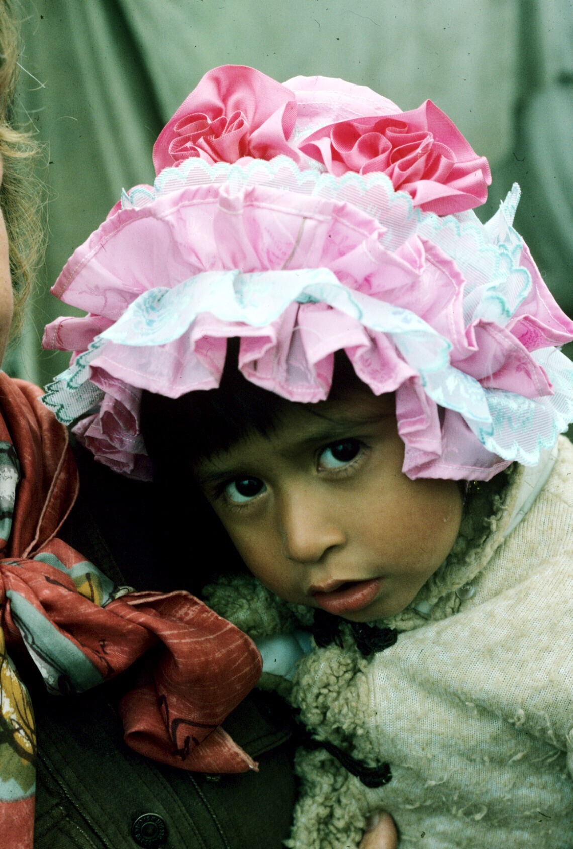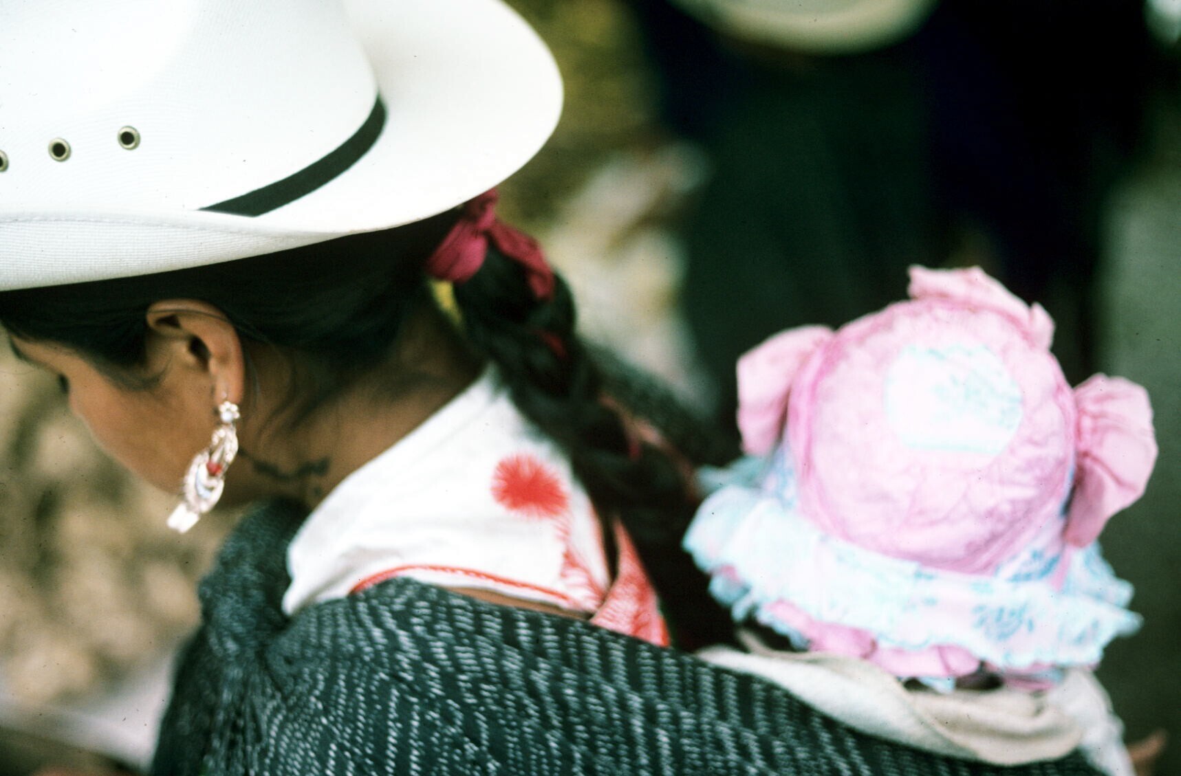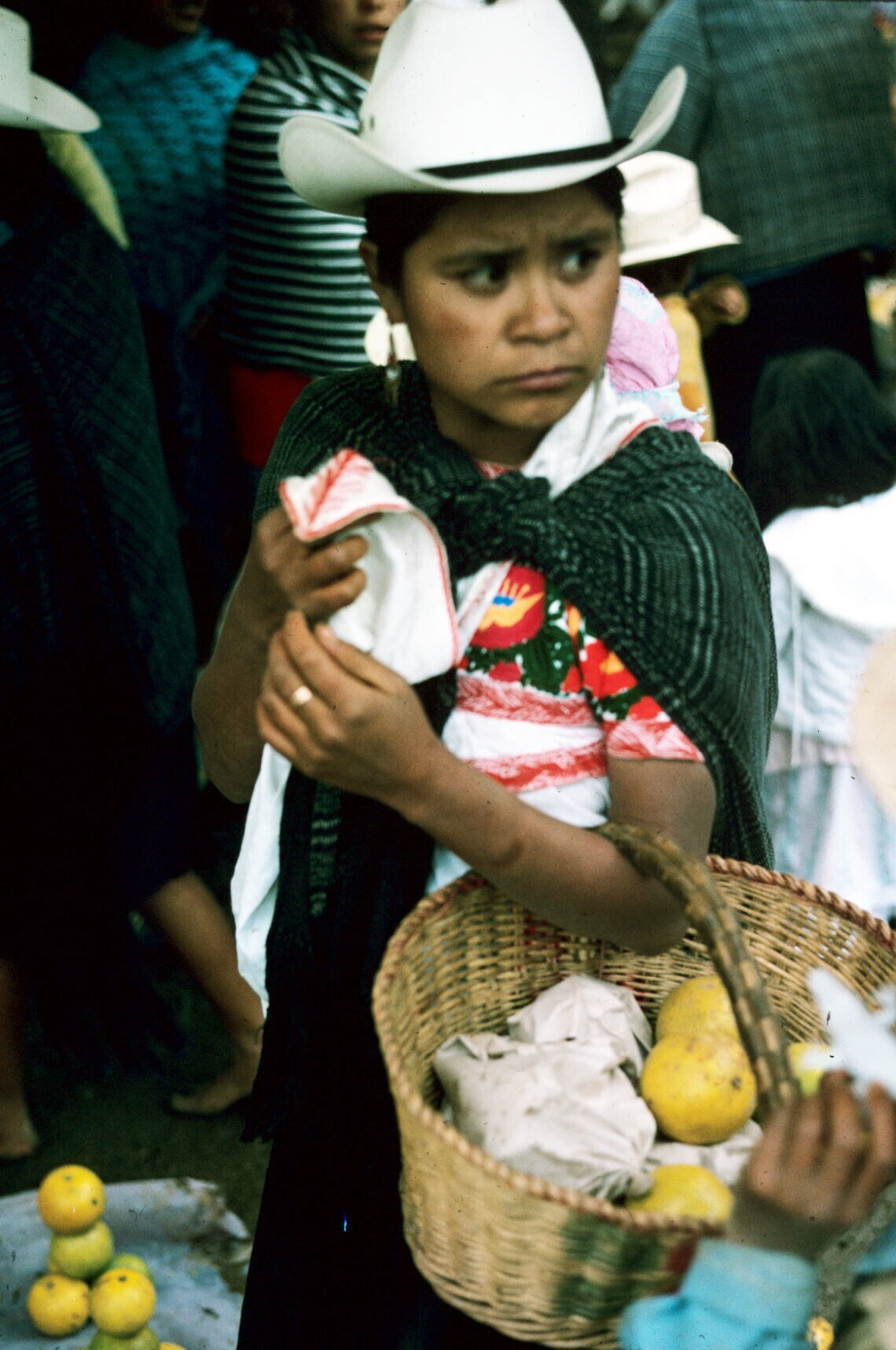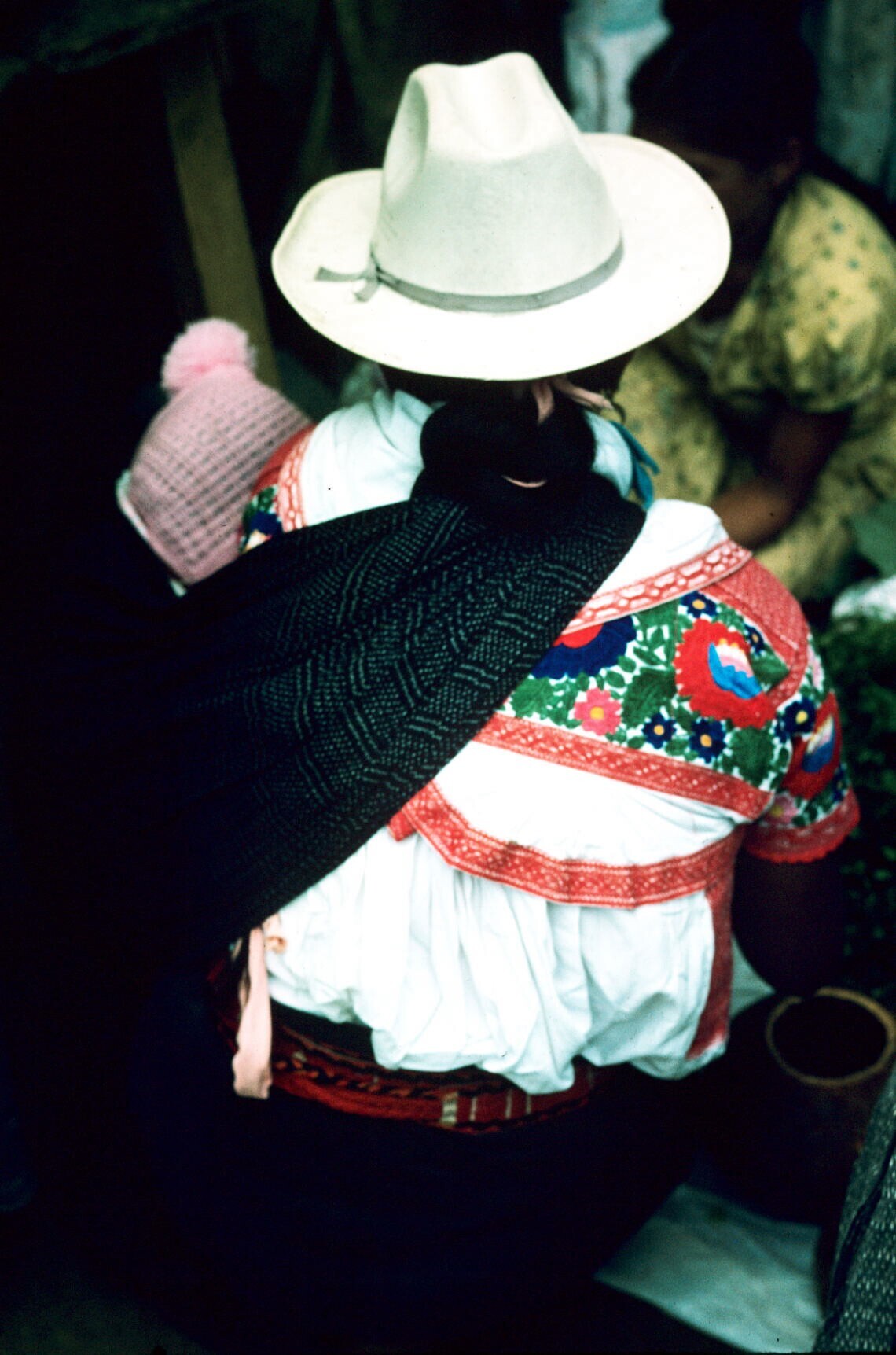vrouw op markt, kindje dragend in "mamal" (draagdoek...