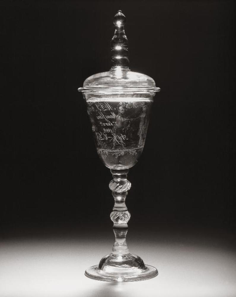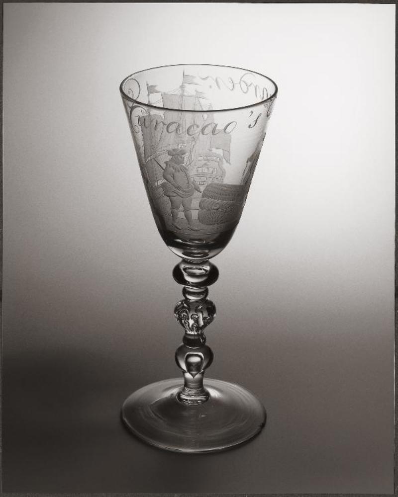 Kelkglas met deksel en tekst: ‘De Curaçao’s Vaarder’