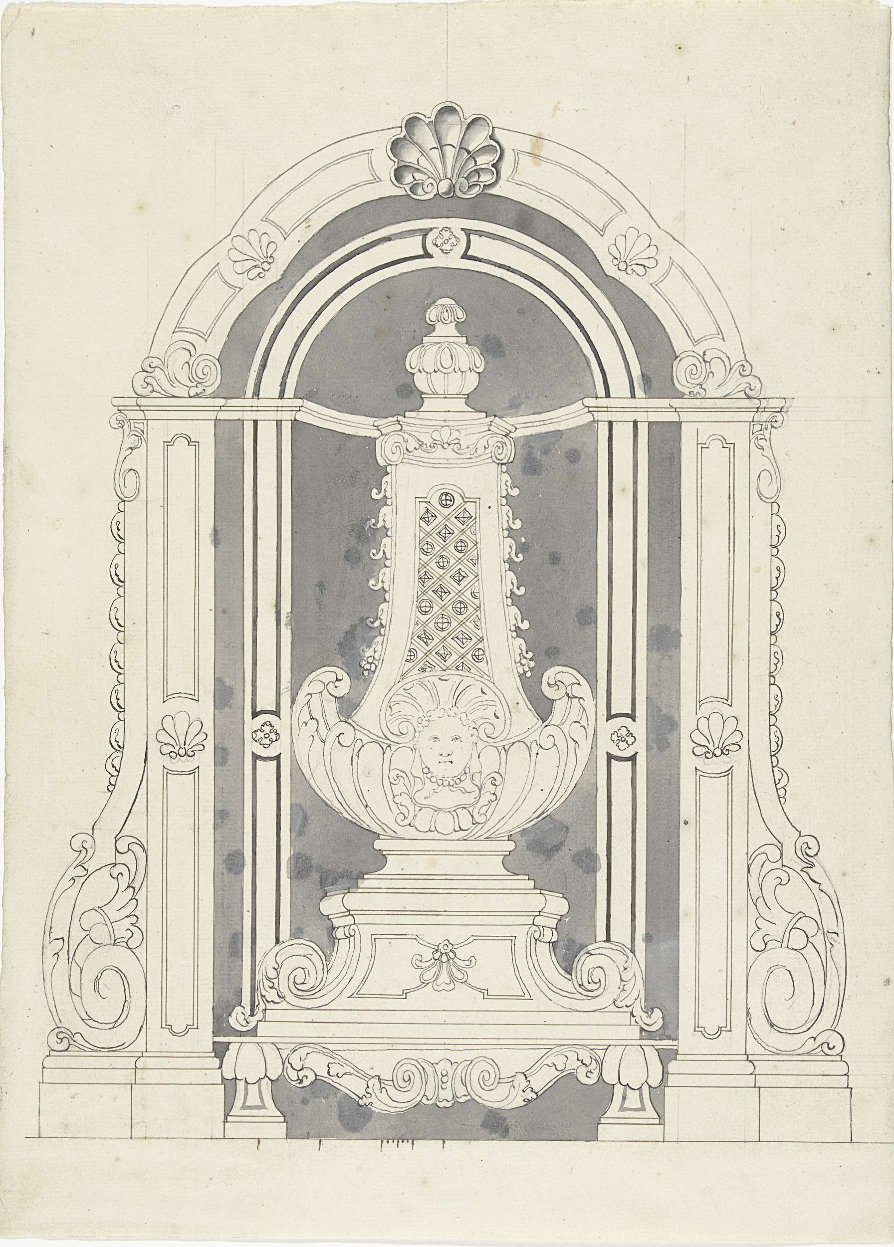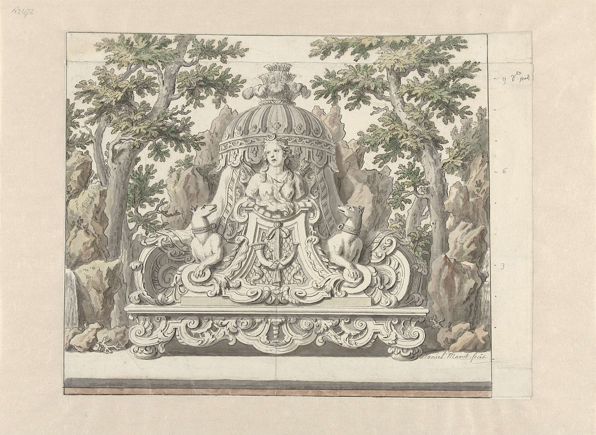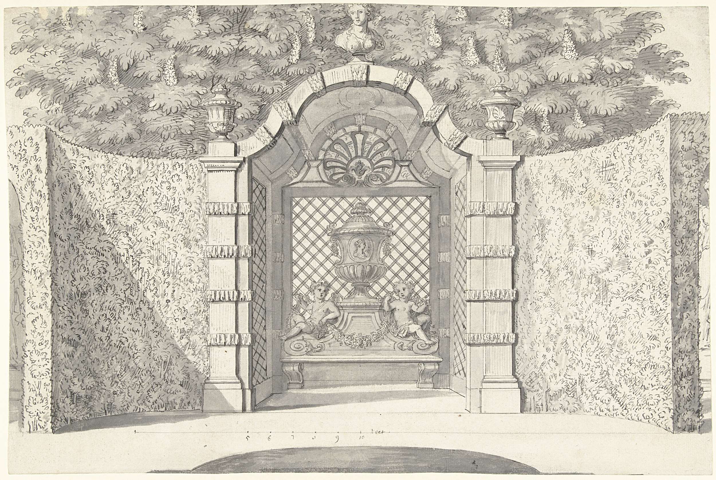 Ontwerp voor een tuinsierraad met buste van Diana en...