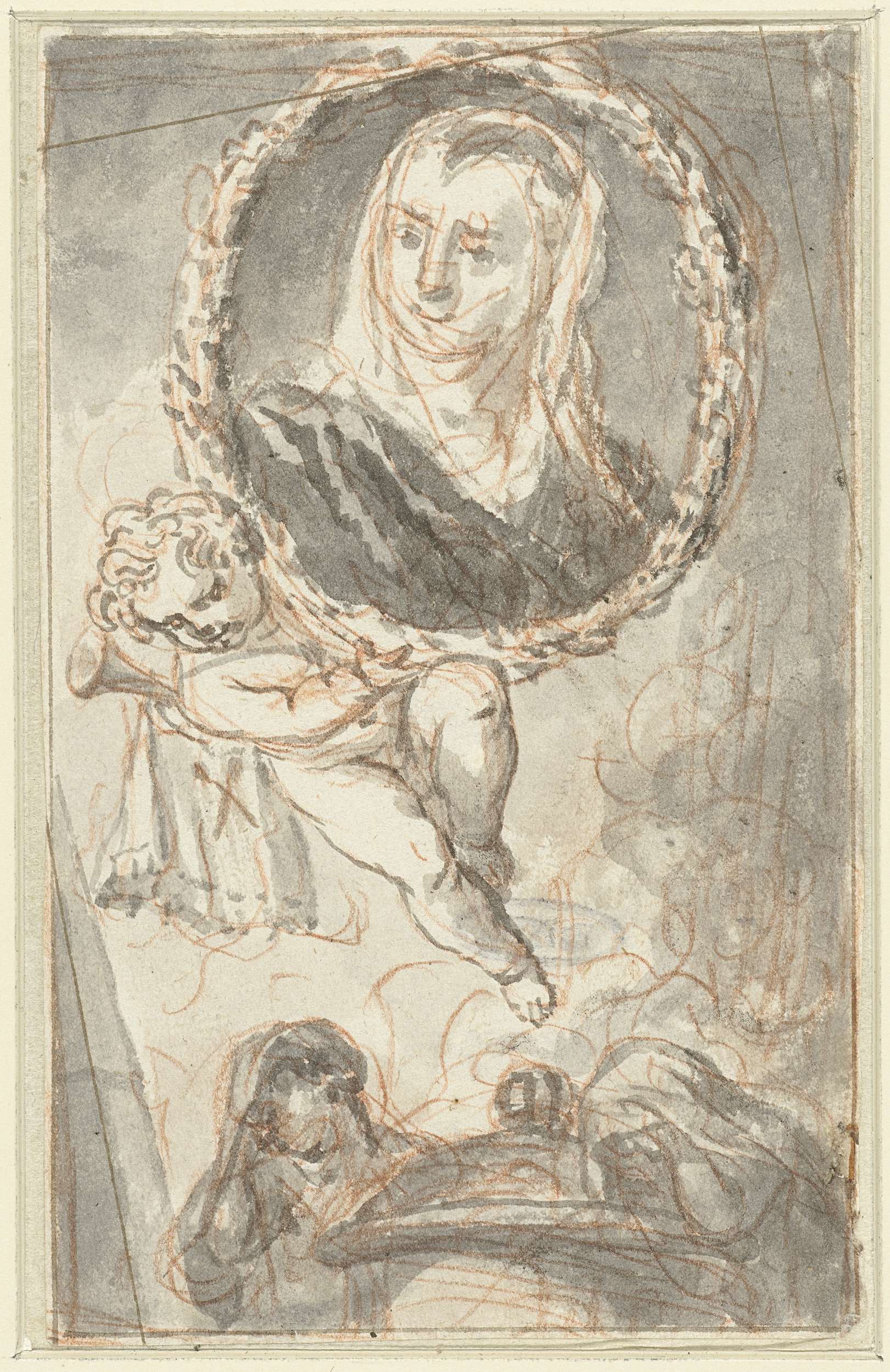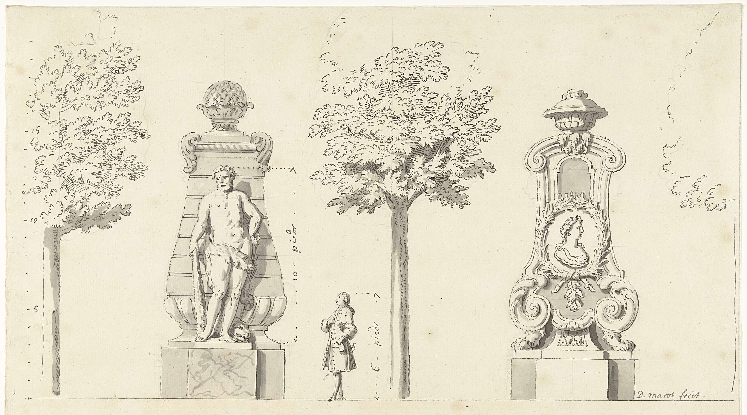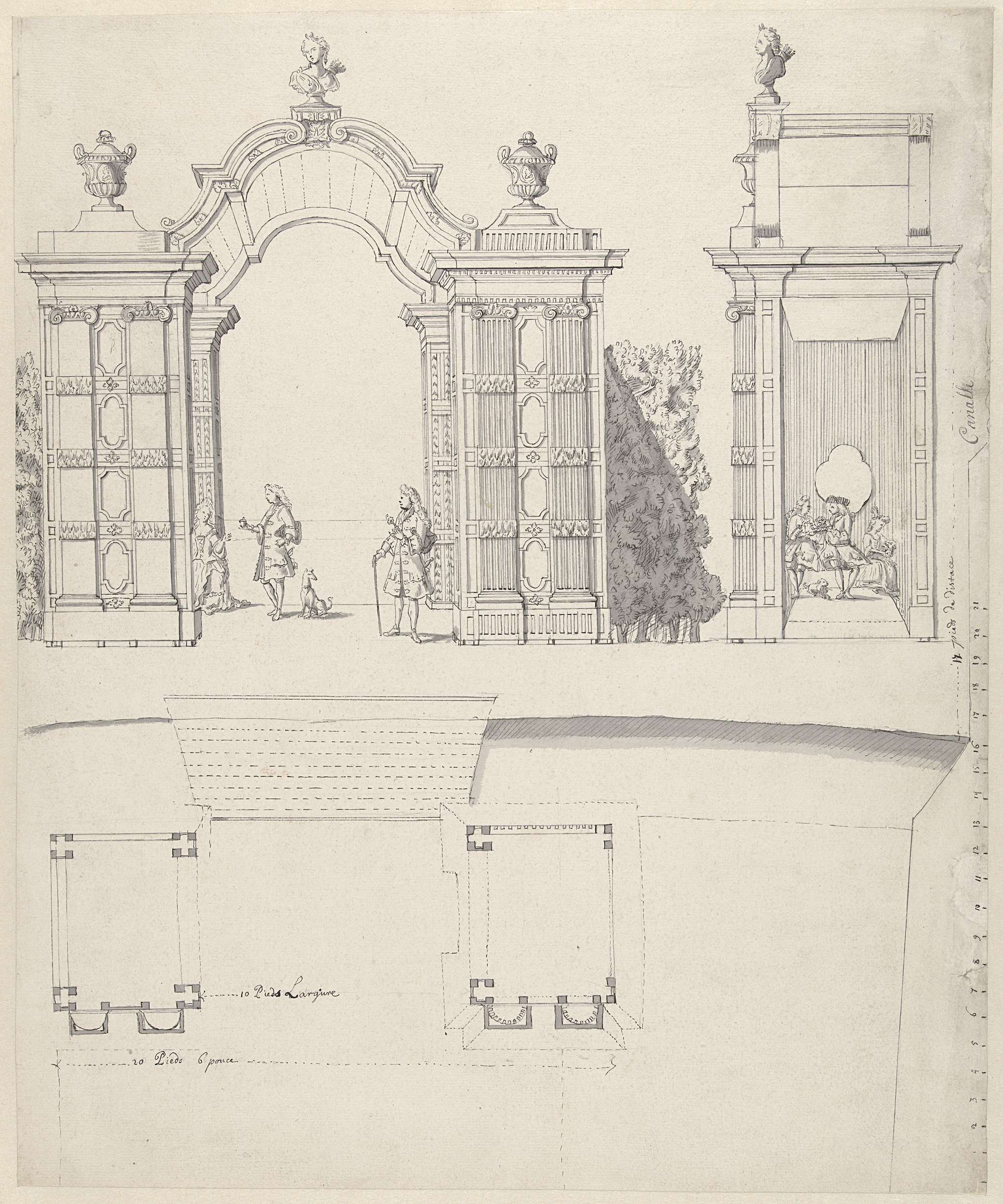 Ontwerp voor een tuinsierraad met buste van Diana en...