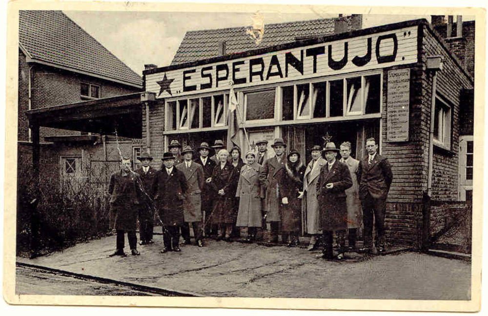Groepsfoto Edese Esperantisten voor het gebouwtje Es...