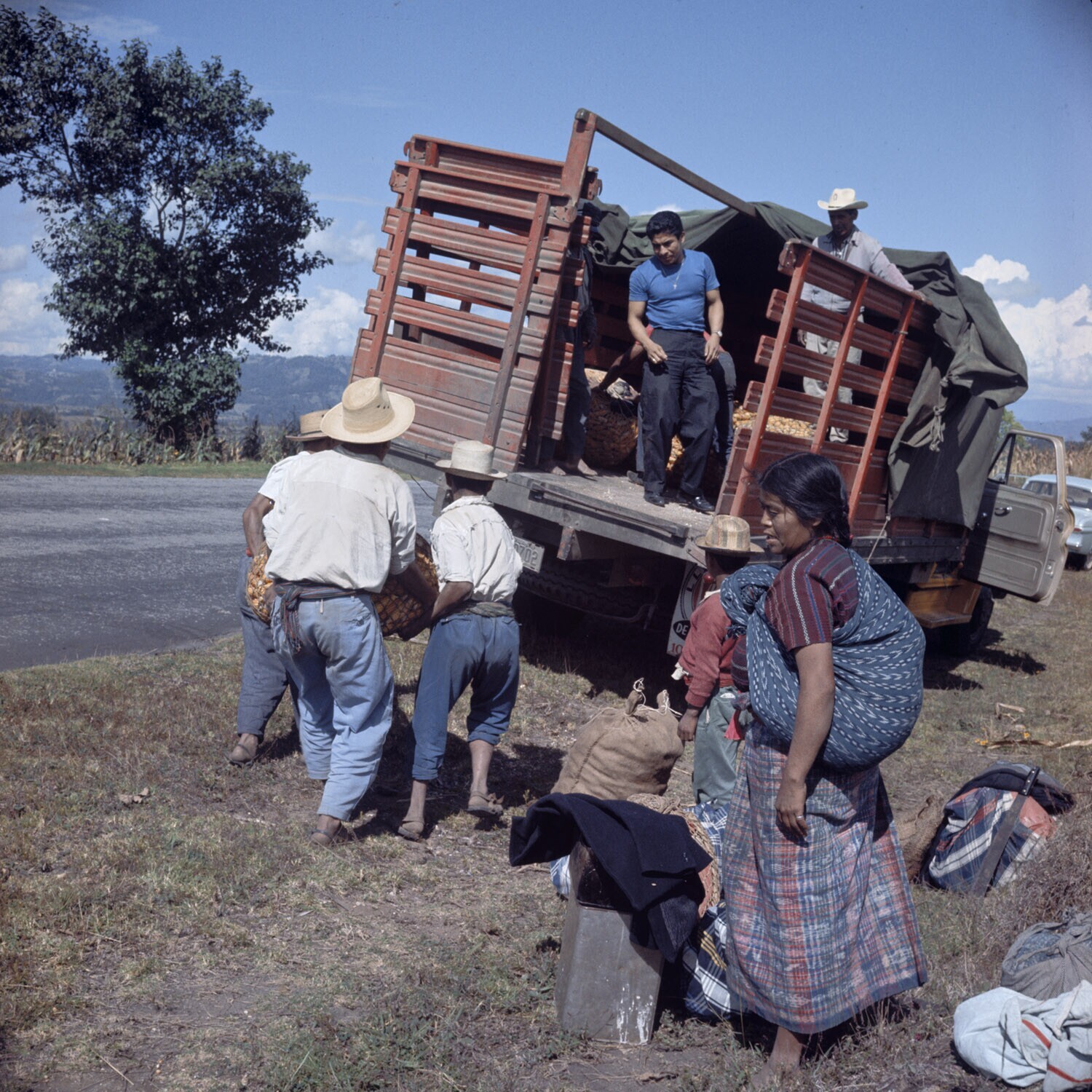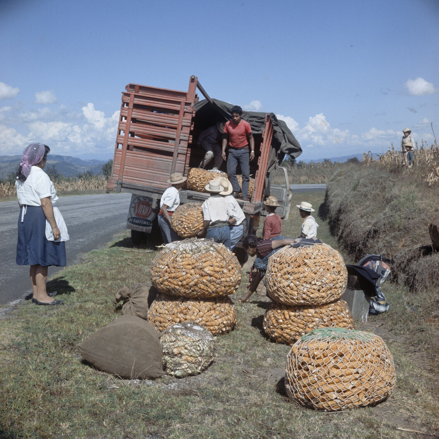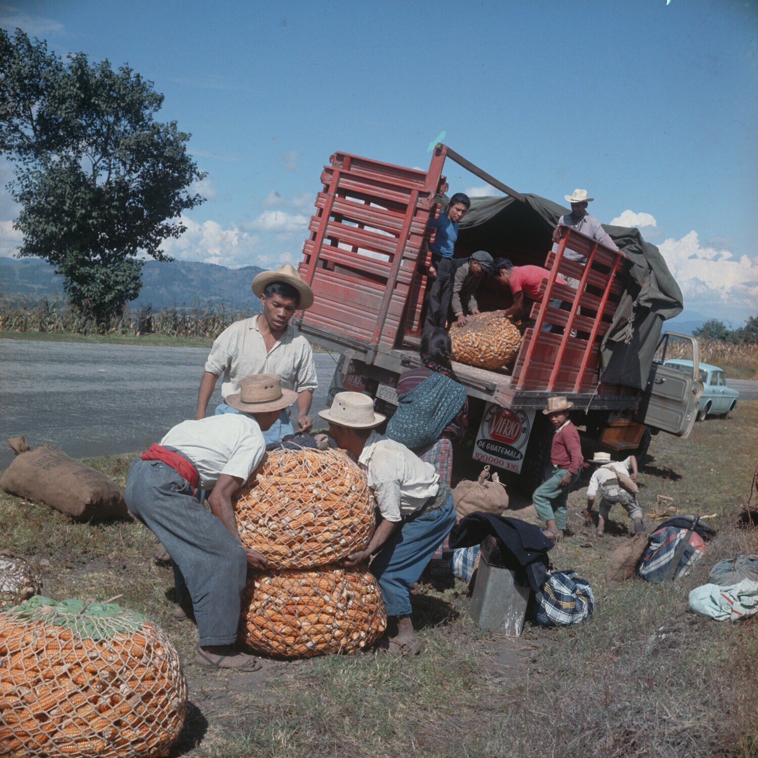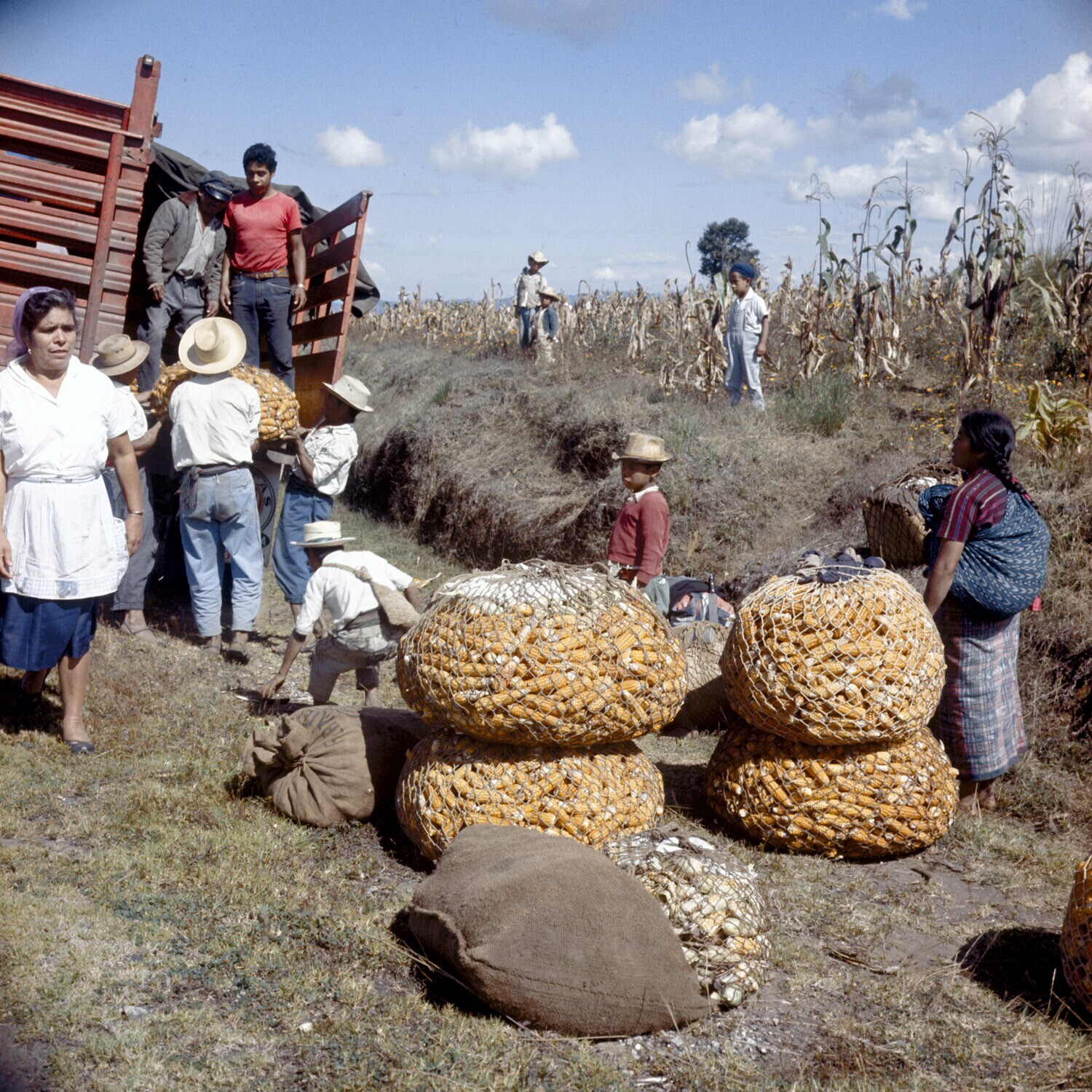 Boeren laden hun mais in een vrachtauto.