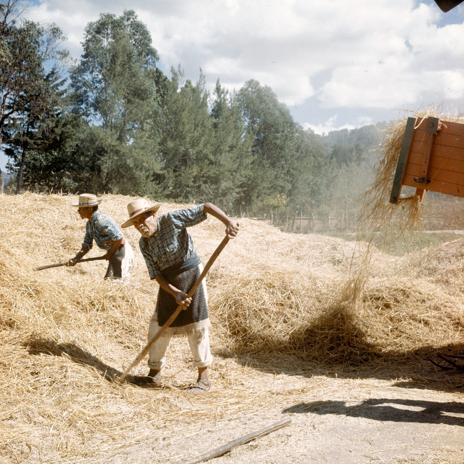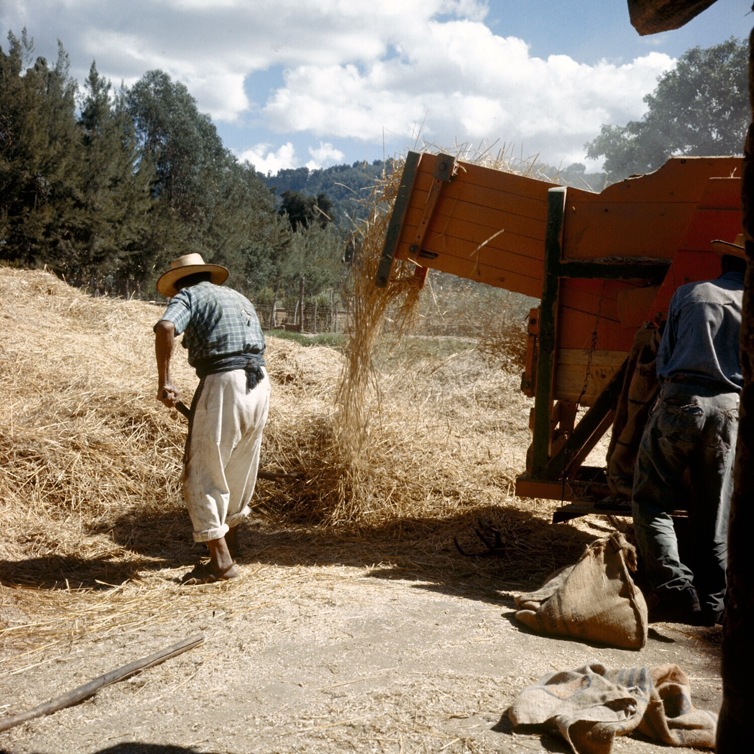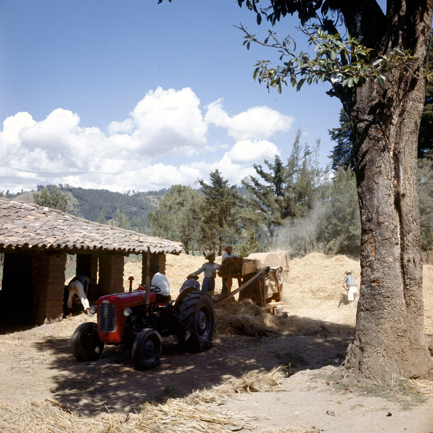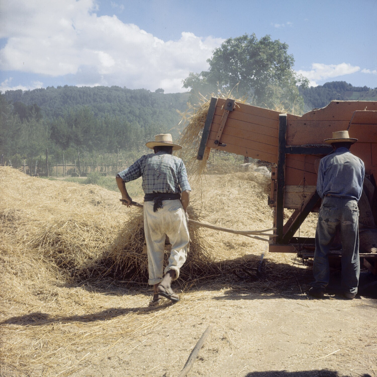 Boerenarbeiders bij het dorsen van tarwe.