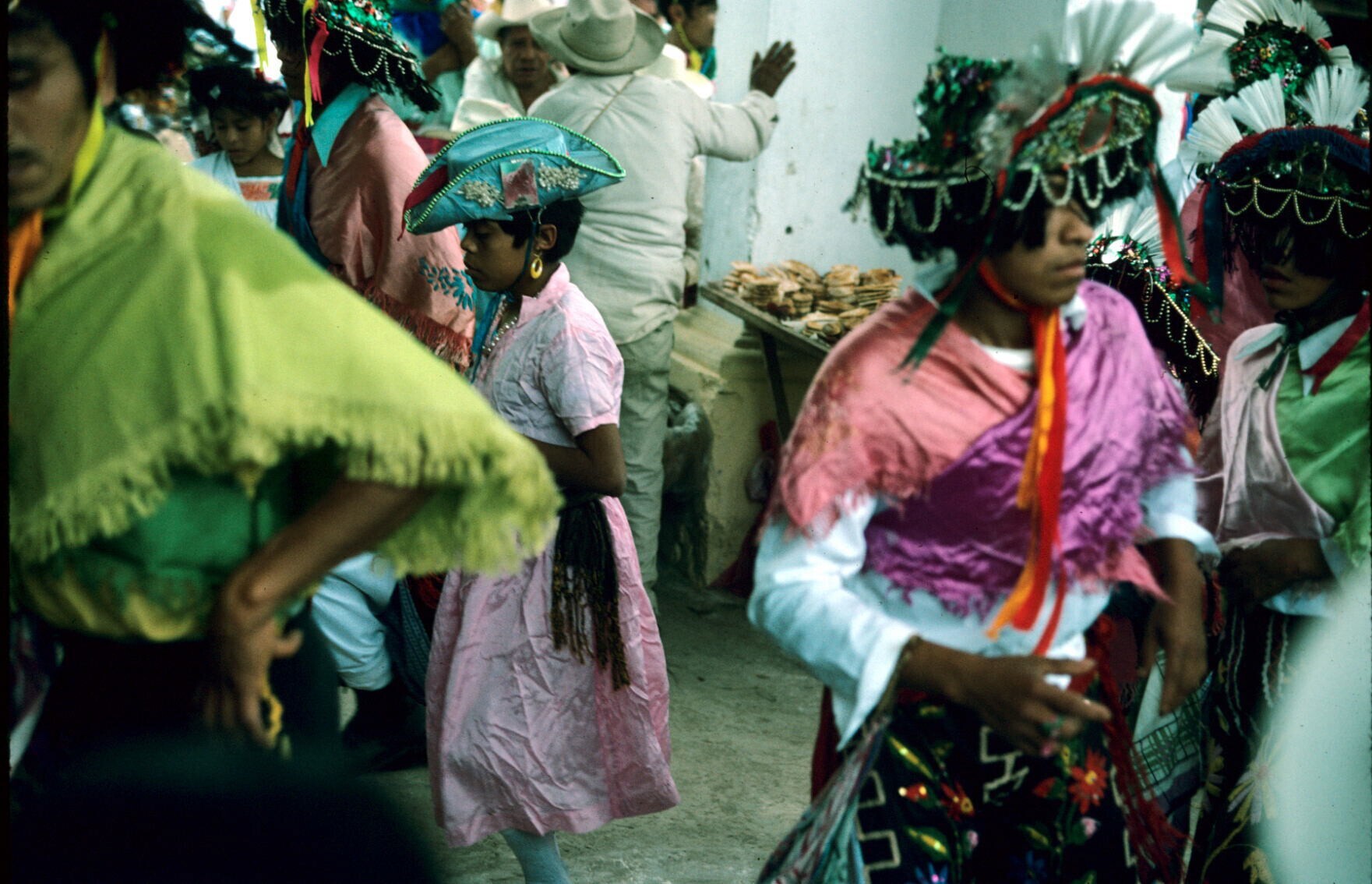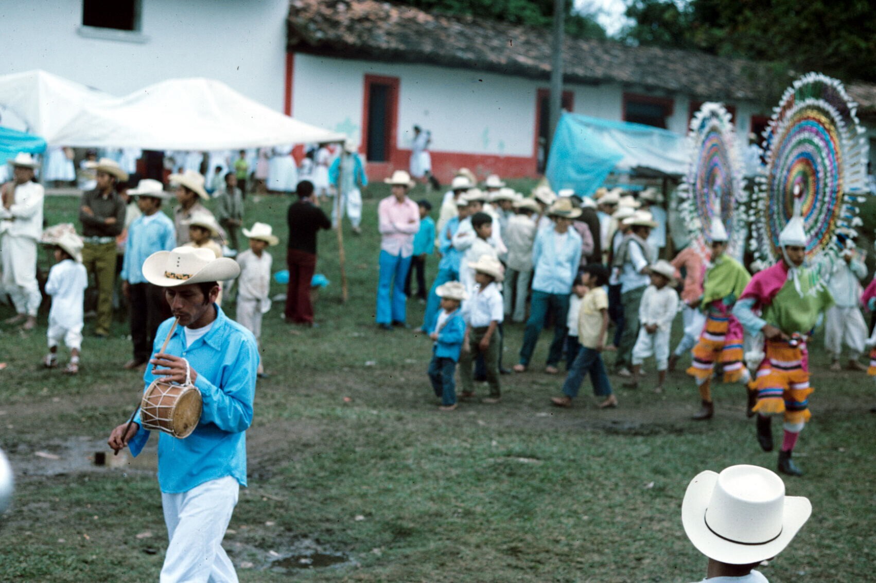 Quetzaldansers tijdens optreden; vooraan fluit/tromm...