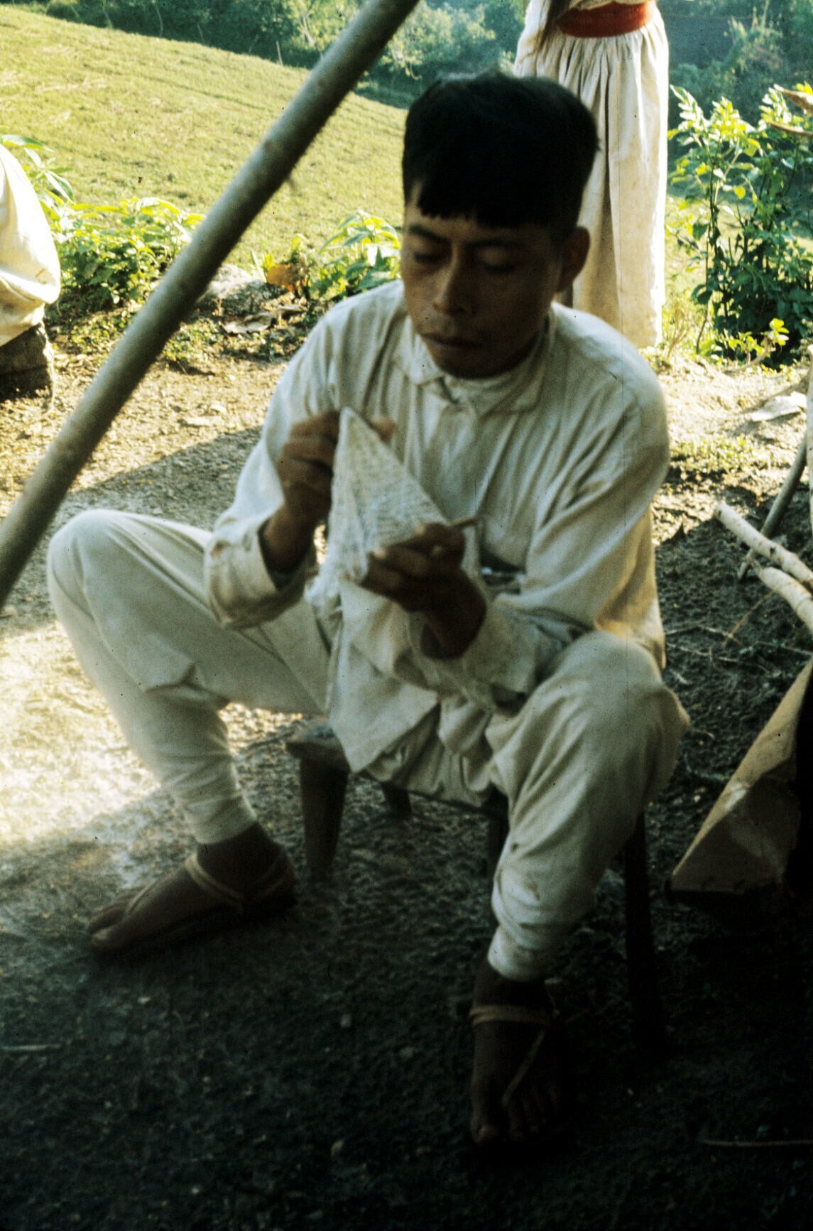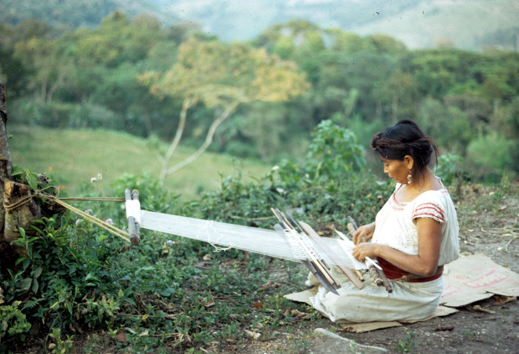 weefster Juana met heupweefgetouw, buitenshuis