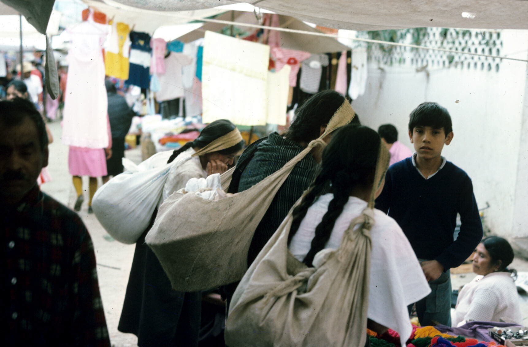 vrouwen op markt, lasten dragend met "mecapal" (draa...