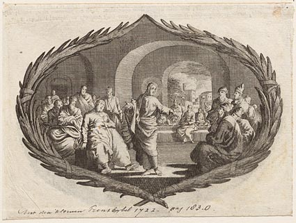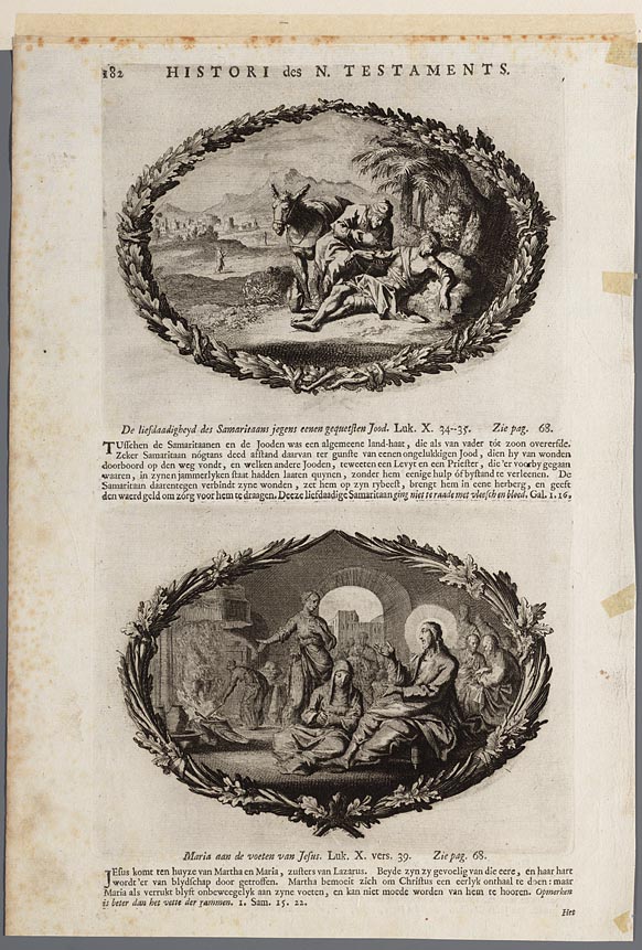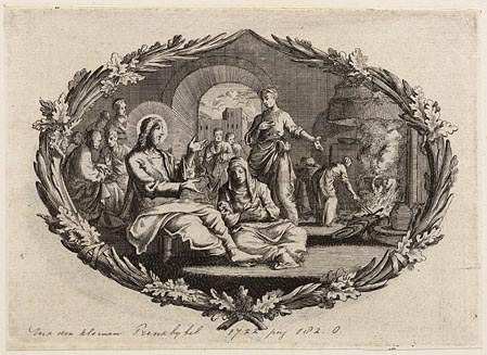 Jezus zit met Maria aan zijn voeten nabij een keuken...