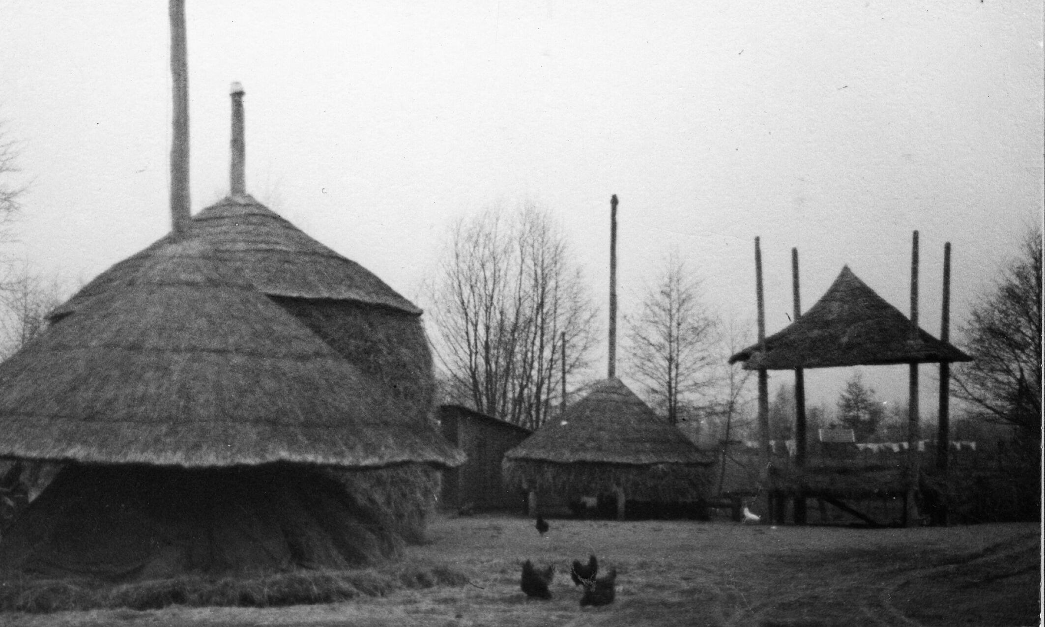 Erf met hooibergen, Almen, 1938 (zwart-wit foto)
