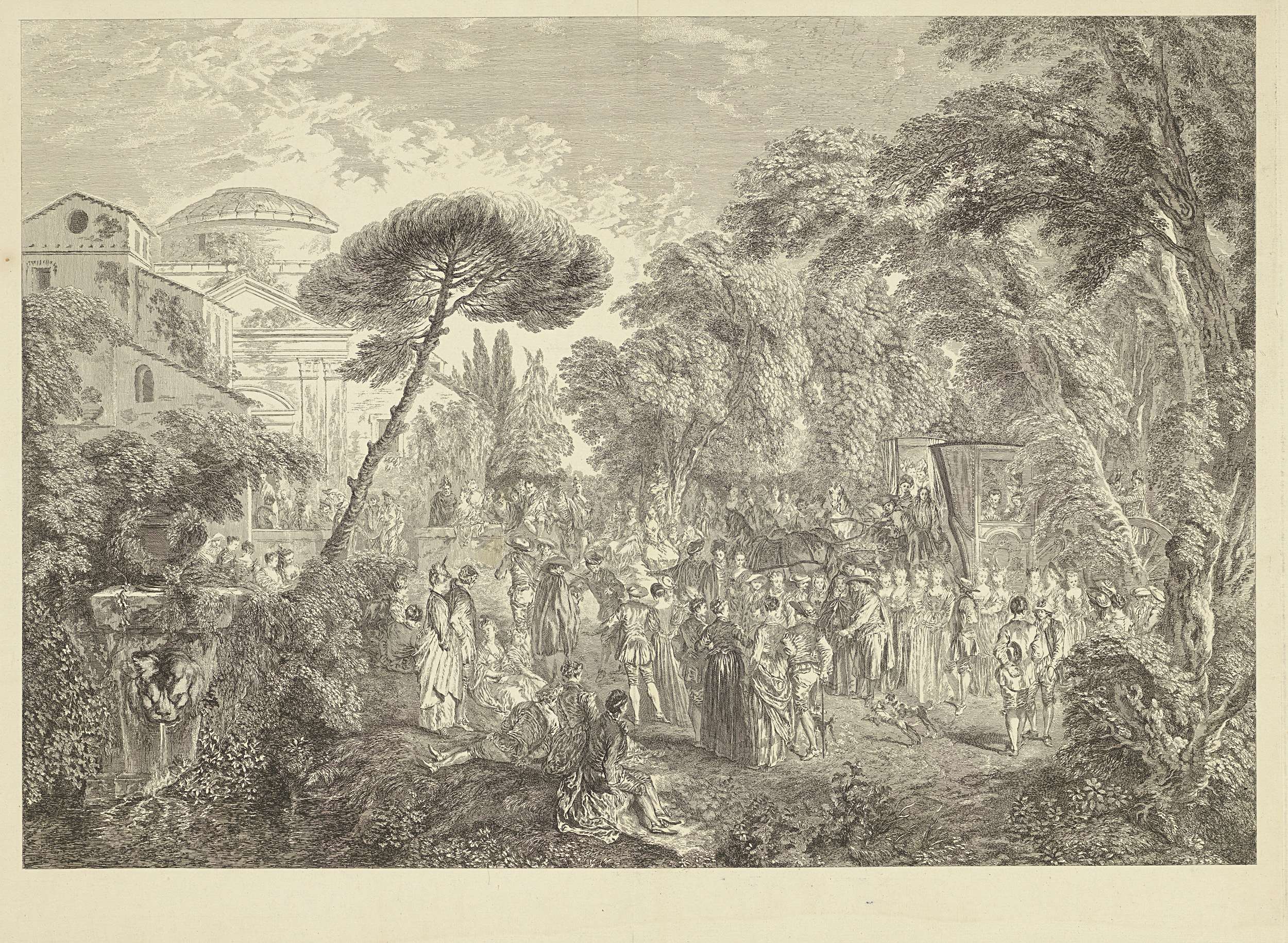 Landschap met twee mannen bij een fontein