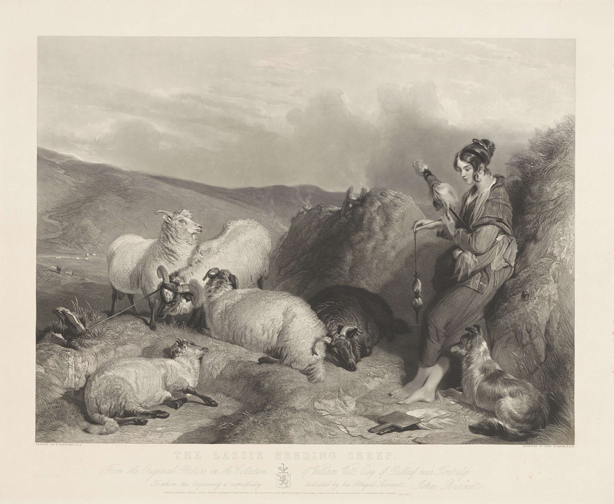 Herder met schapen en hond in een berglandschap