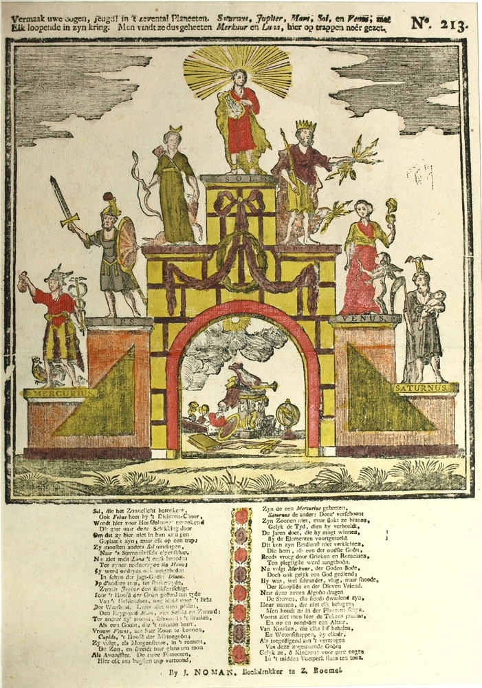 Centsprent met zeven planeten staande op een bordes ...
