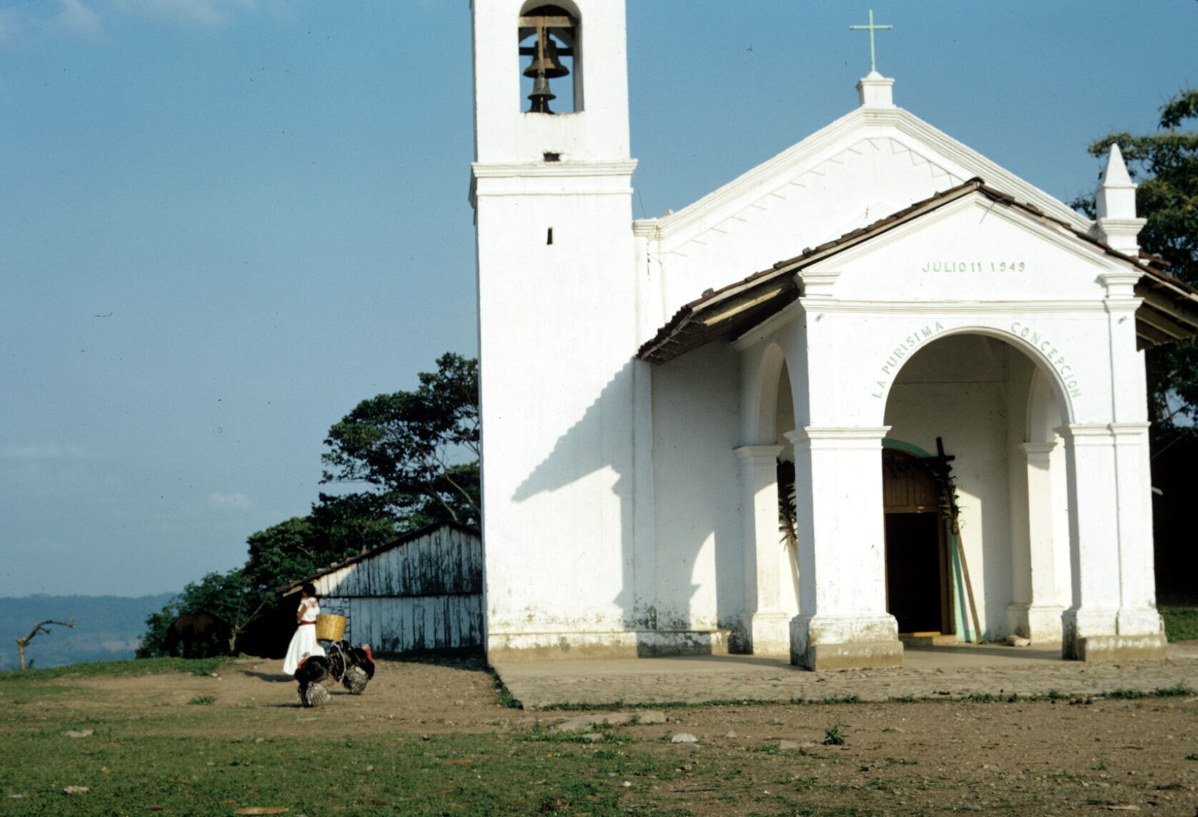 kerk bij helder weer, met ernaast vrouw en kalkoenen