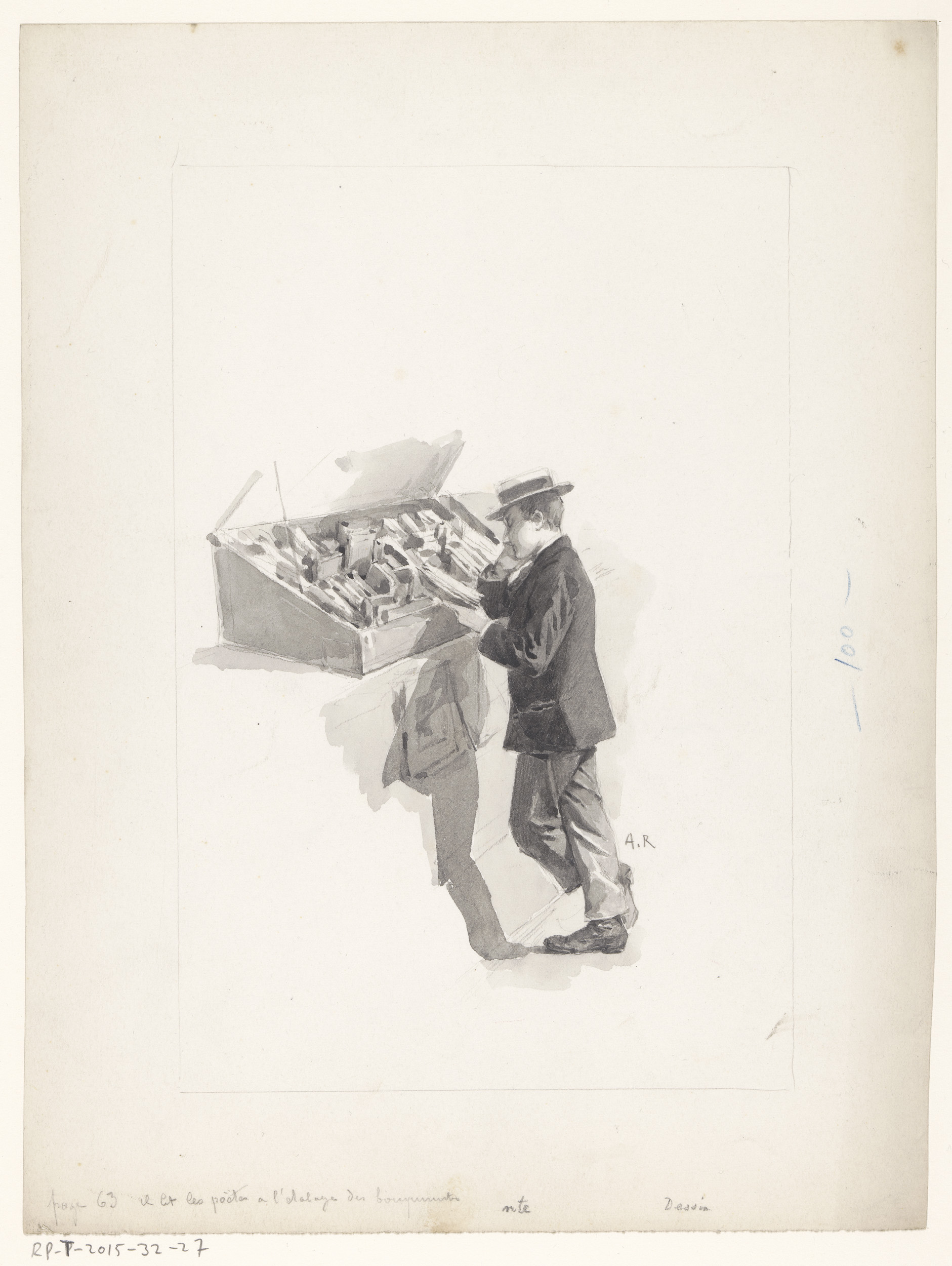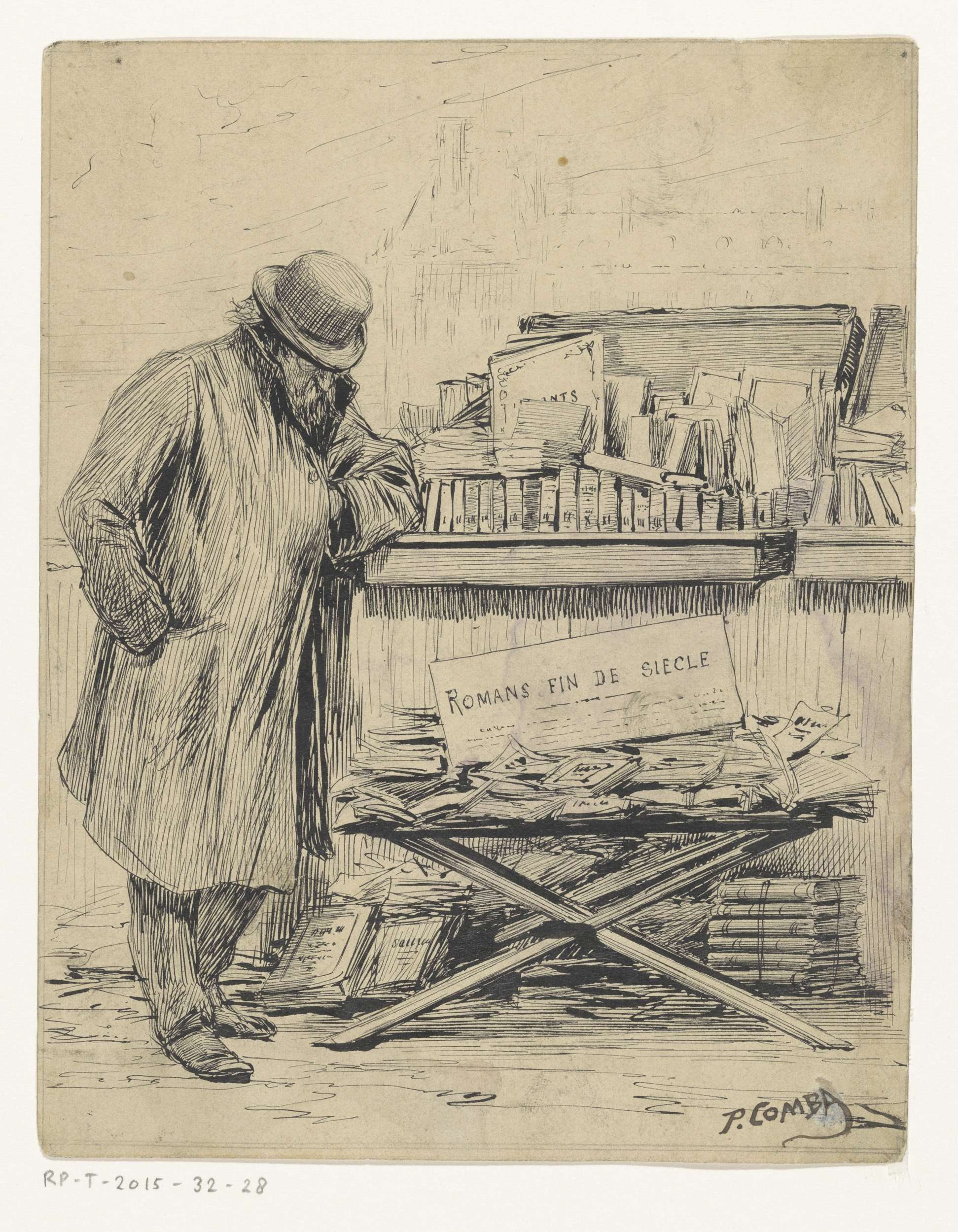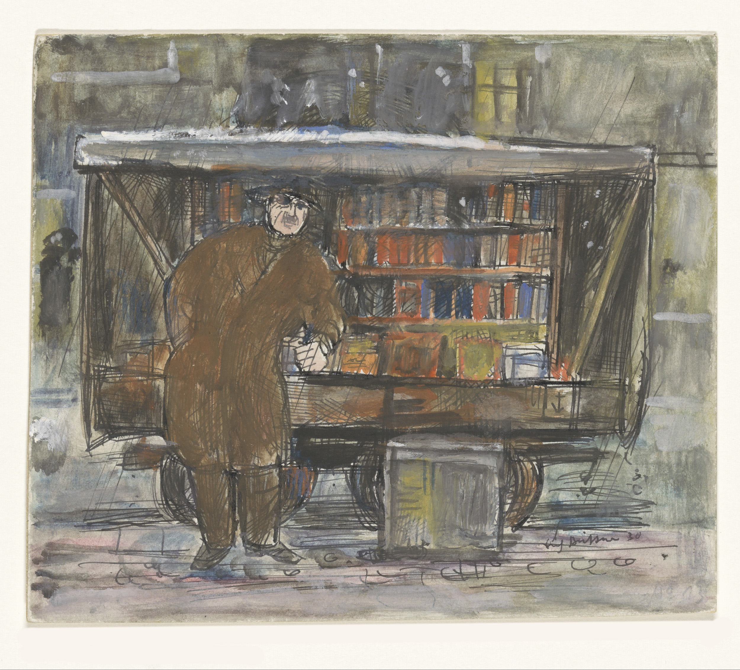Boekhandelaar voor zijn boekenkar