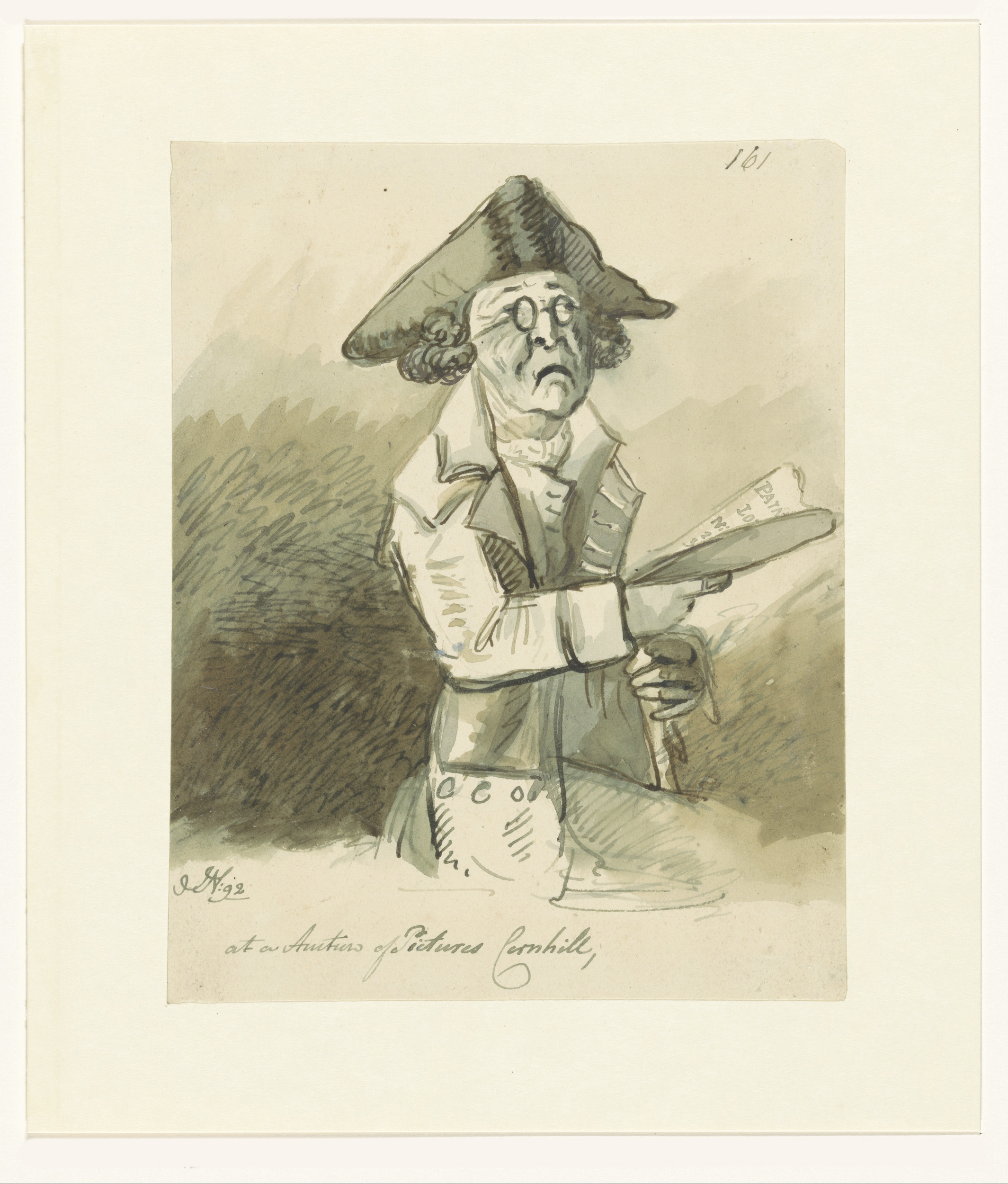Zittende man in 18de-eeuwse kleding bekijkt een prent