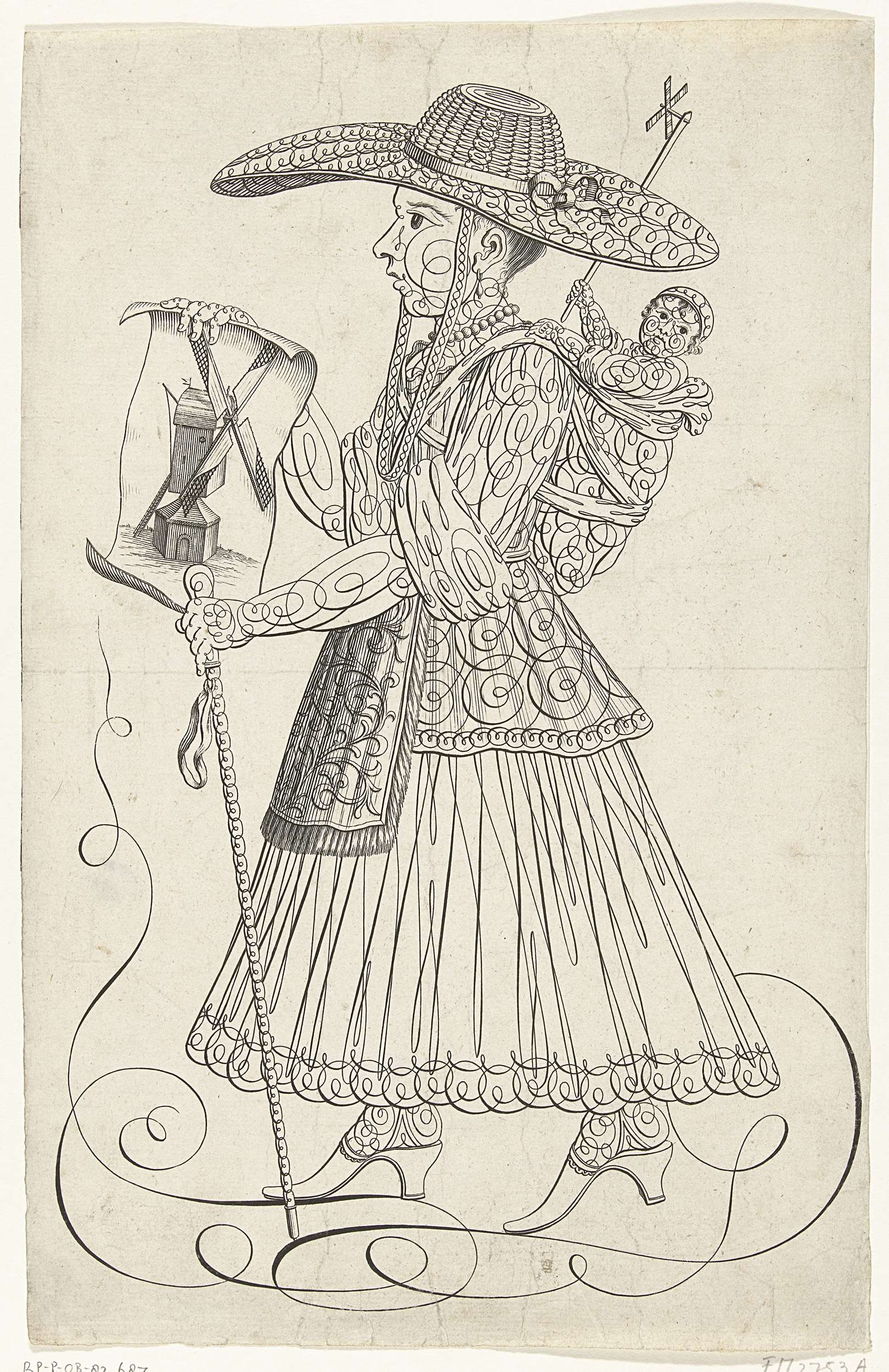 Kalligrafie van vrouw met kind en windmolens, ca. 1720