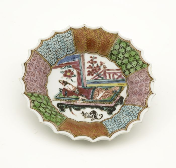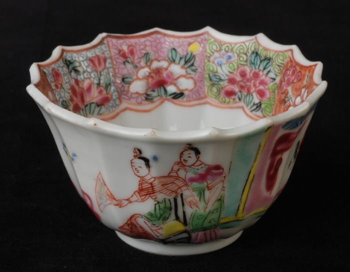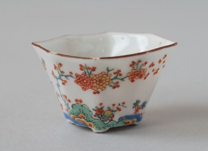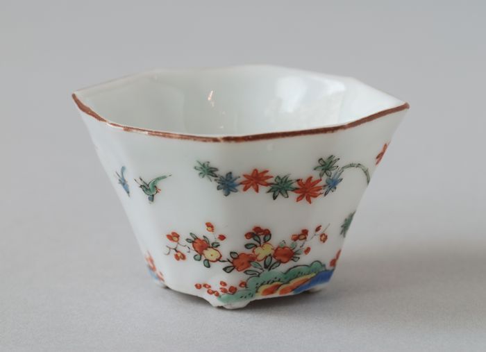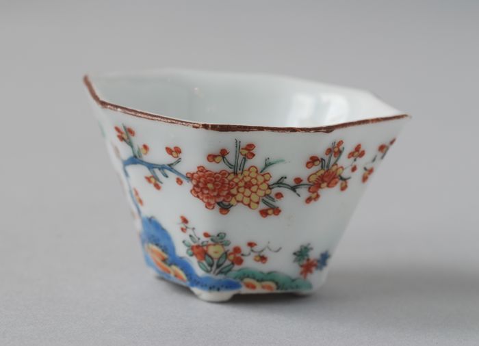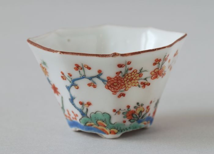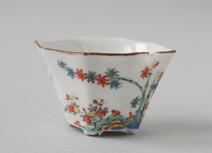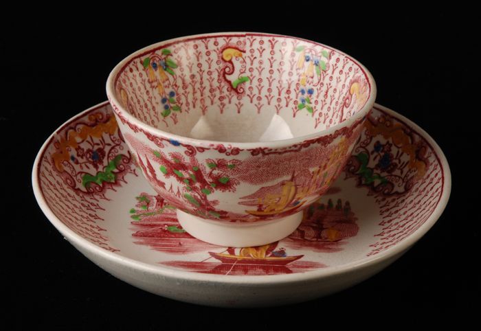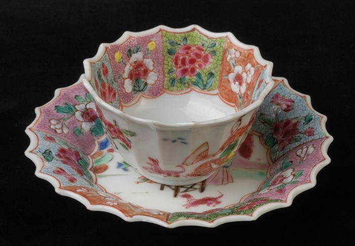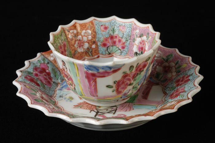 Kop en schotel met meerkleurige Aziatische bloemen e...