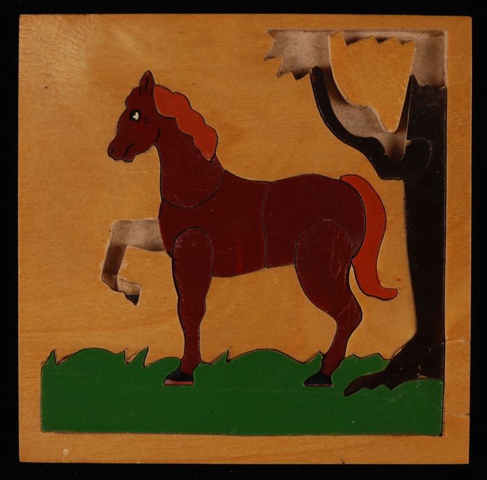 Kistje met zes puzzles met kleurige voorstellingen v...