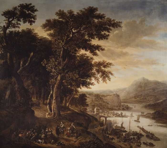 Kop en schotel met meerkleurig landschap en bloemdec...
