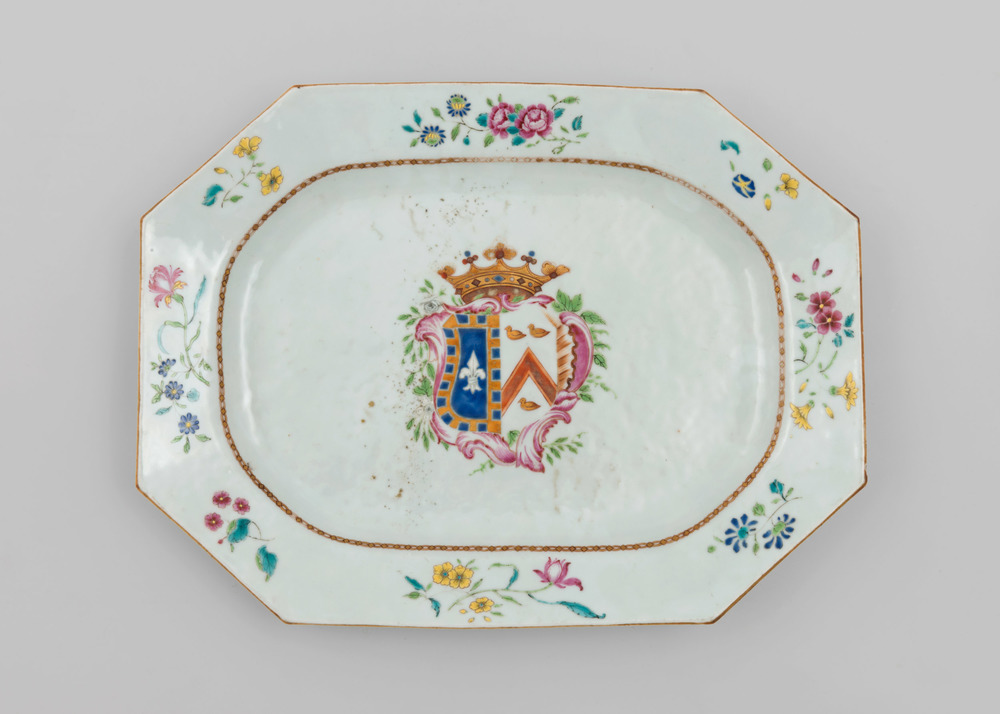 Porseleinen schotel met het familiewapen Crommelin