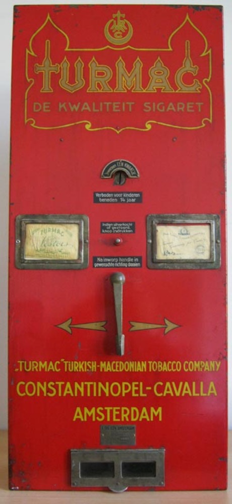 Sigarettenautomaat van ijzer en glazen venstertjes v...