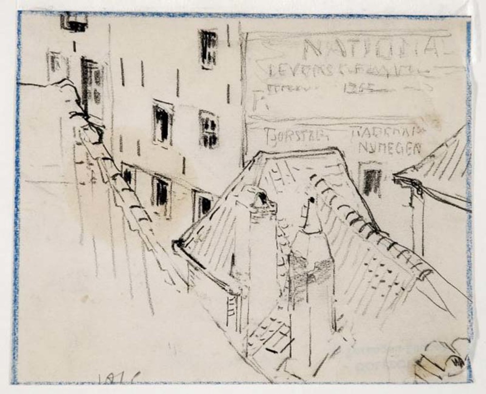 Gezicht vanaf het Valkhof op huizen aan de Steenstraat