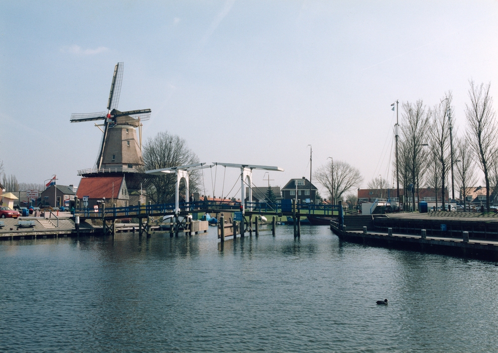 Zicht op voetgangersbrug en molen De Hoop vanaf de V...