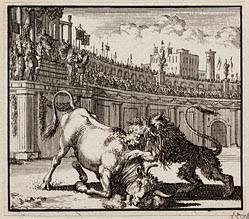 Kampstrijd te Londen tussen een dog en een jonge leeuw