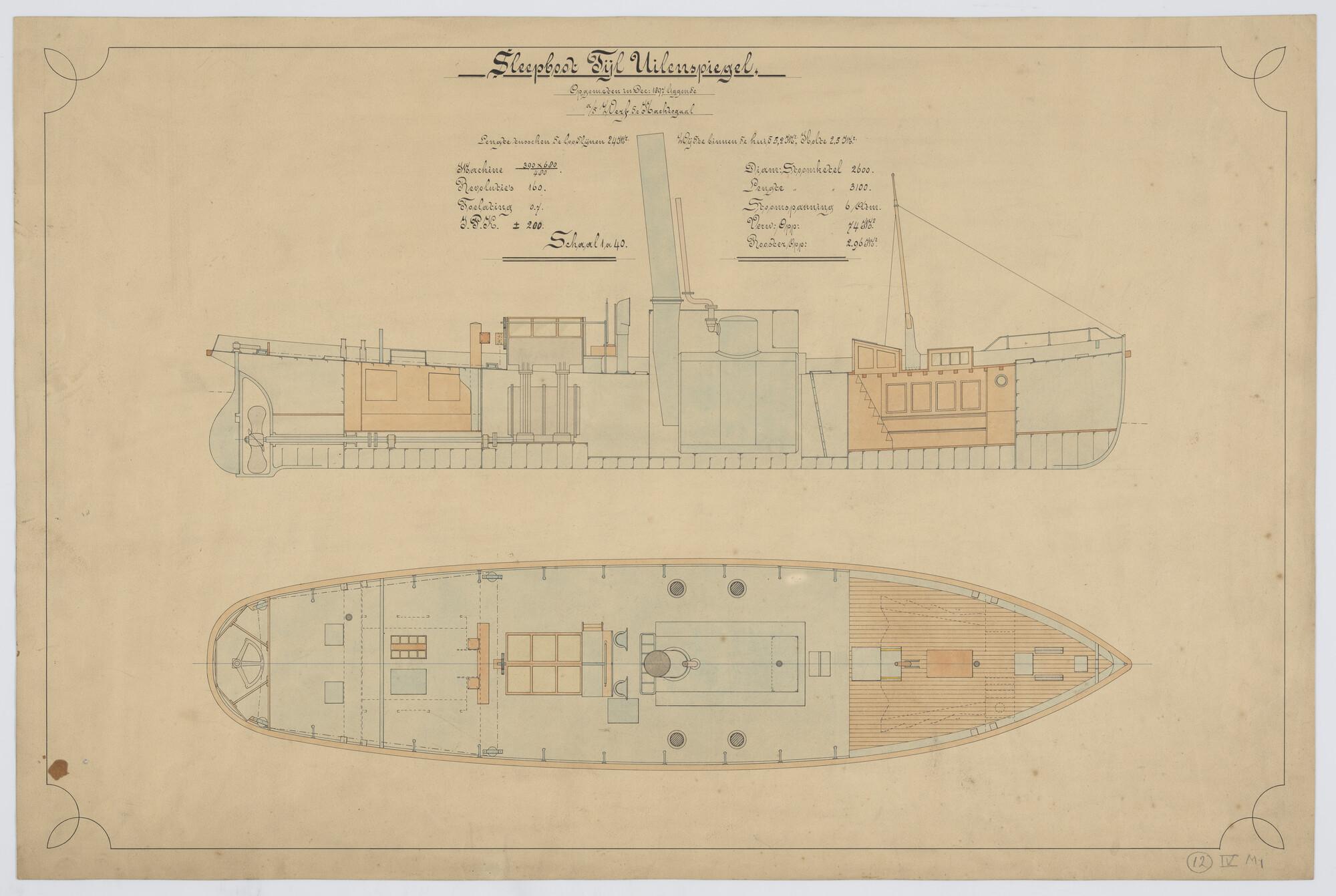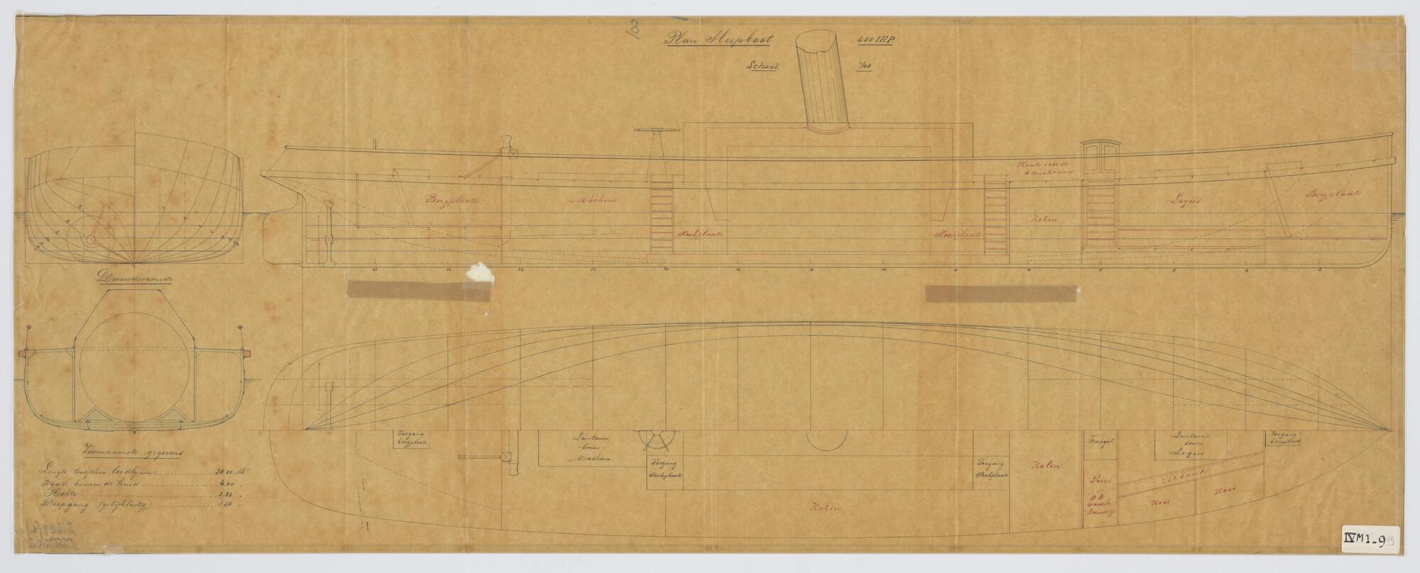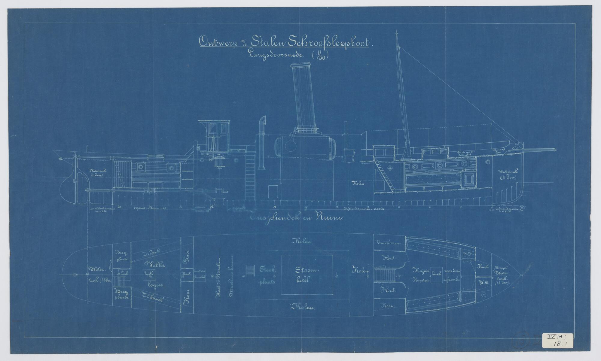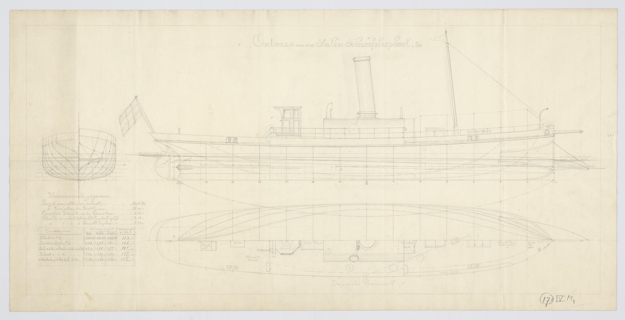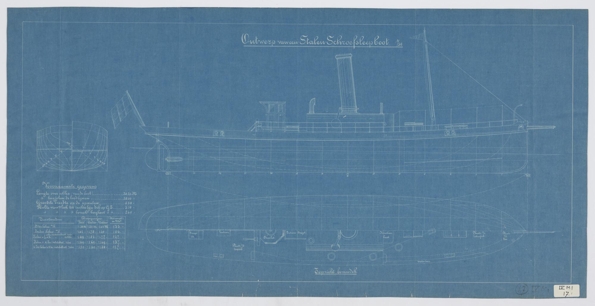 Verticale langsdoorsnede en bovenaanzicht sleepboot ...