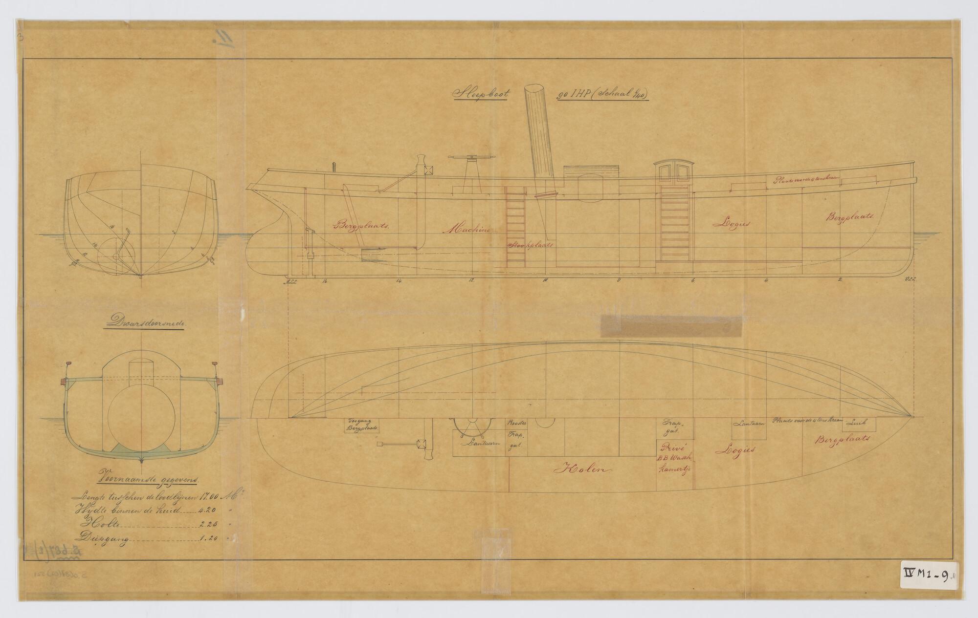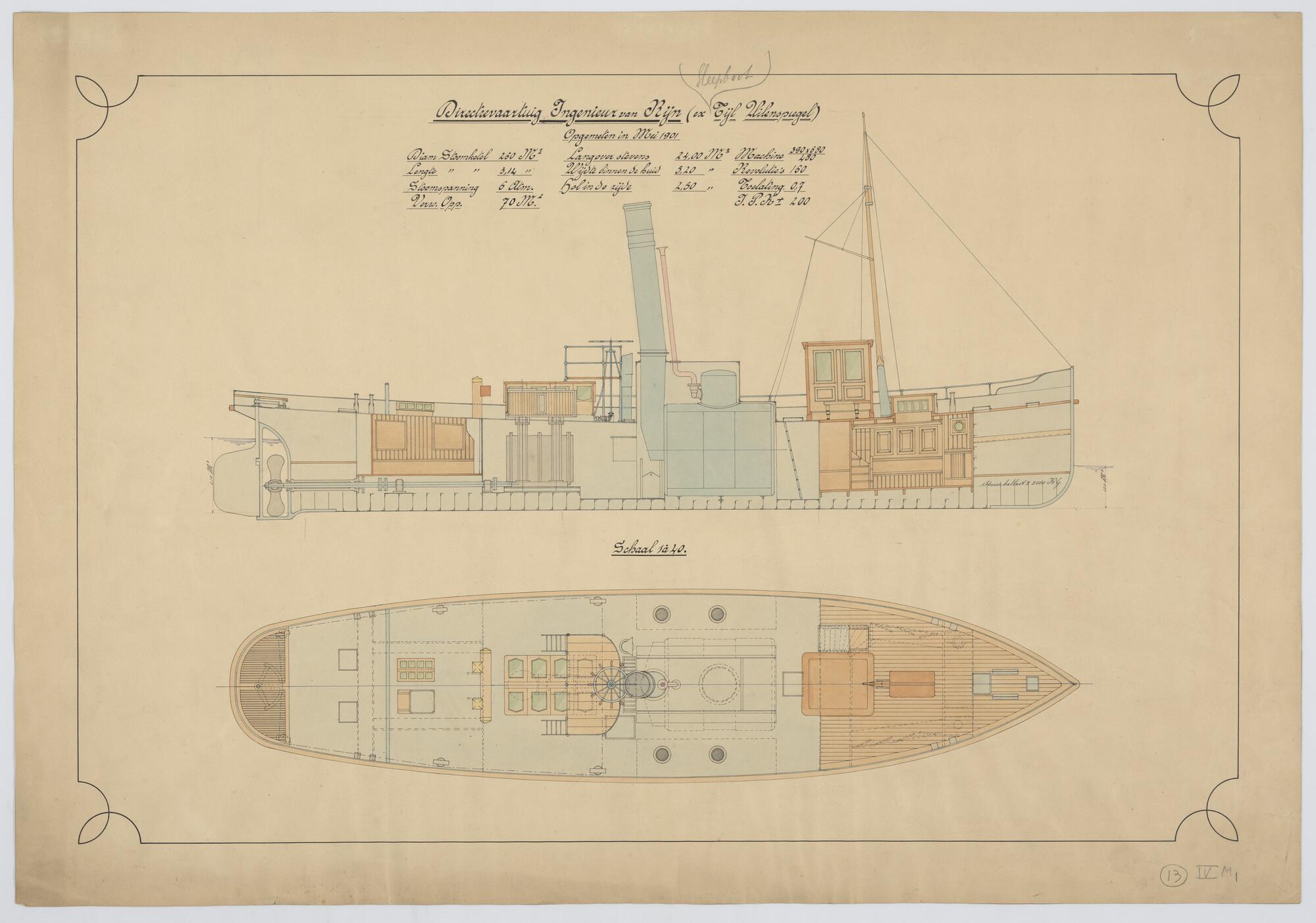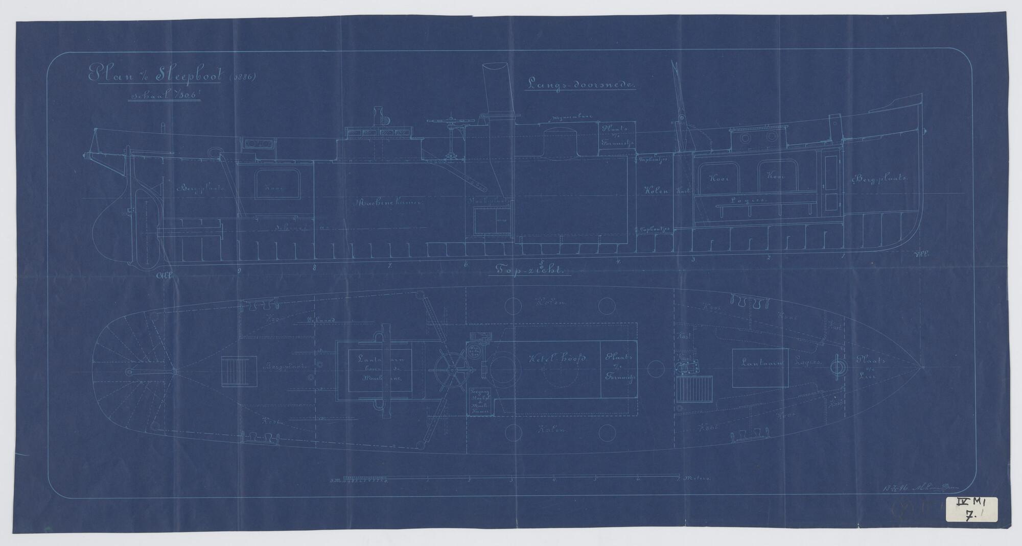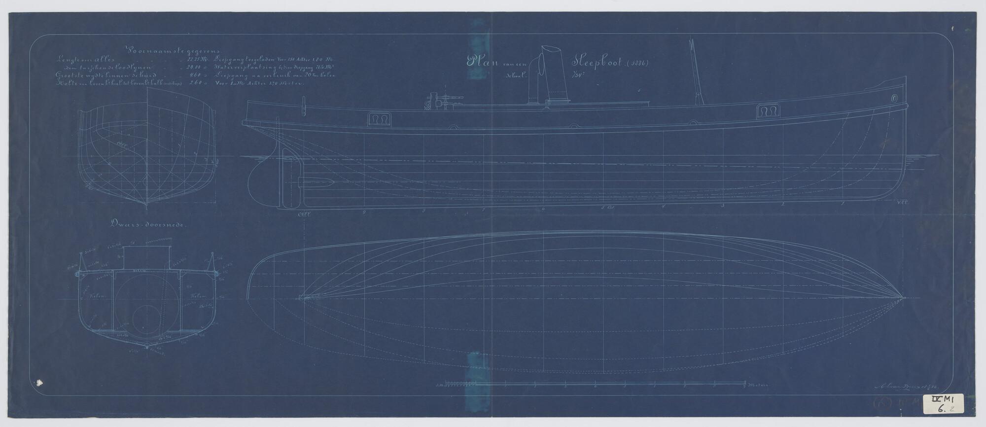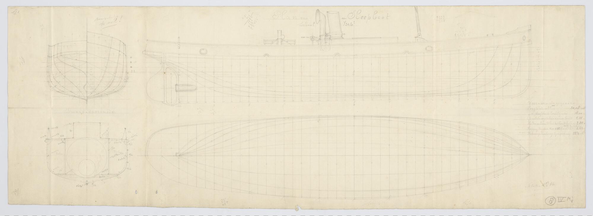 Verticale langsdoorsnede en bovenaanzicht sleepboot ...