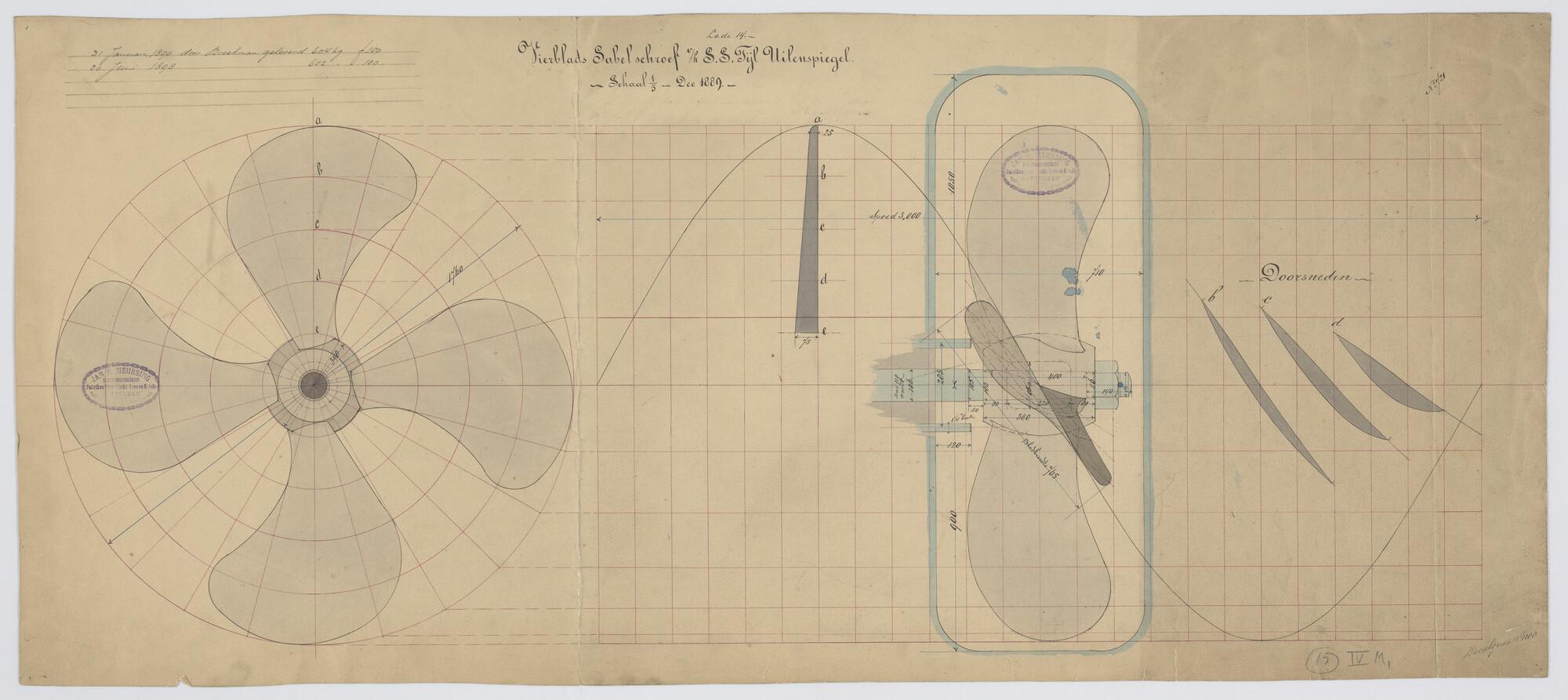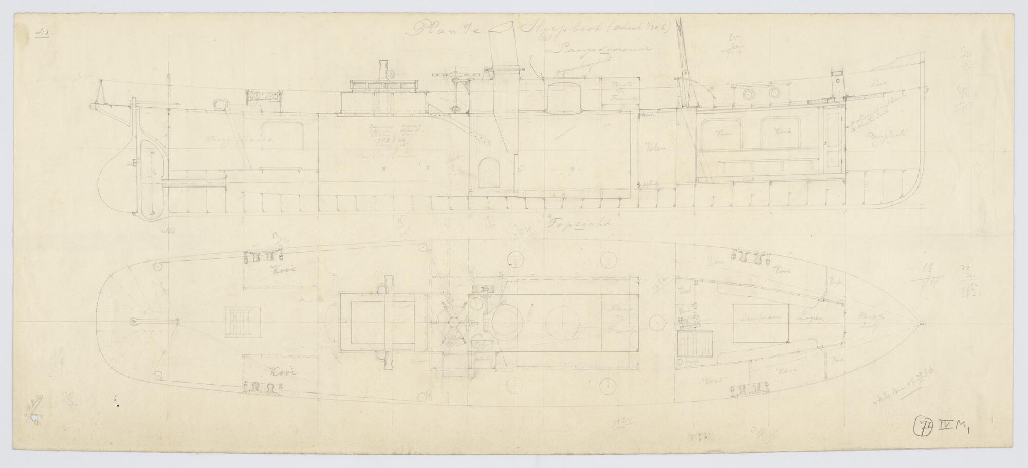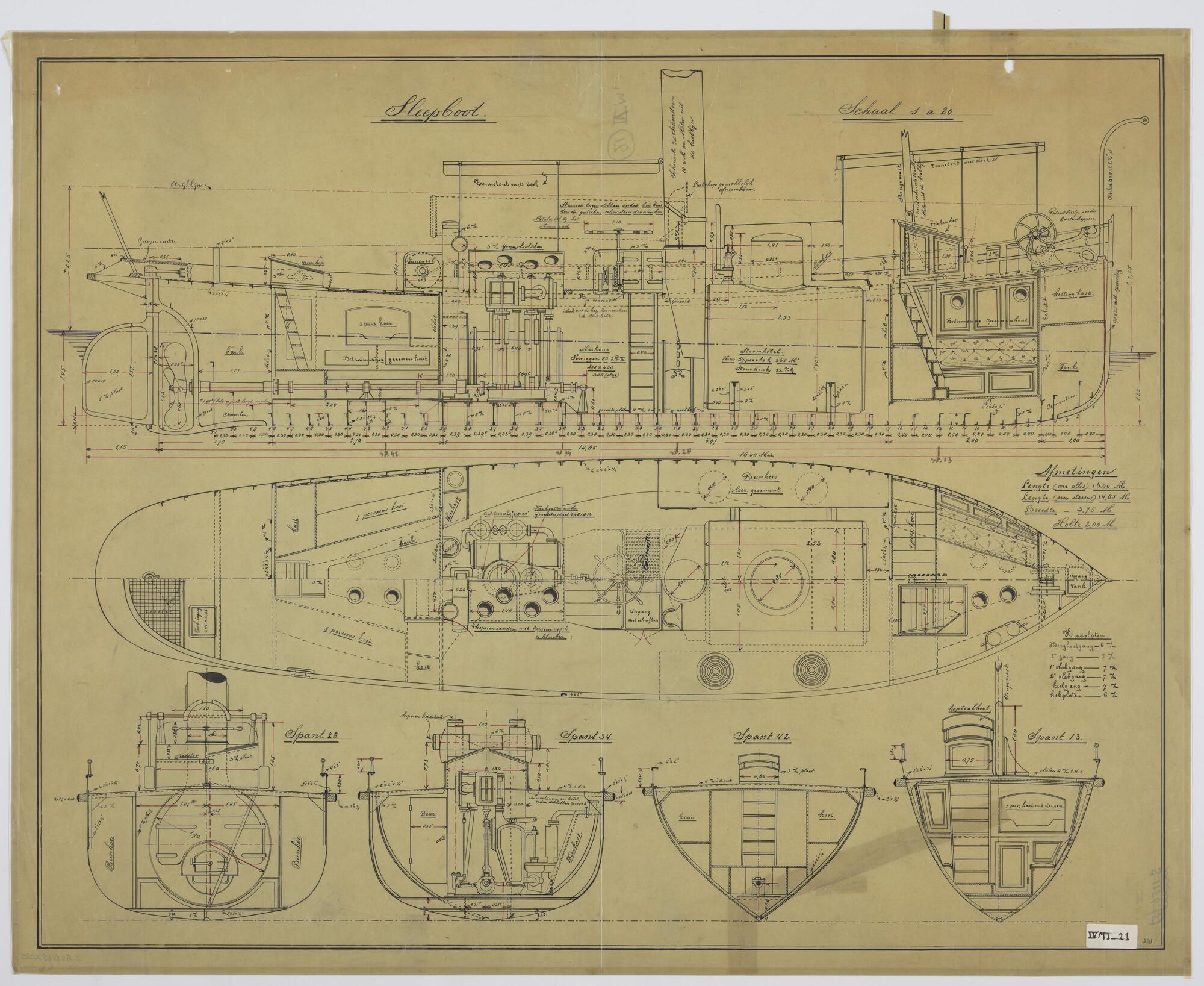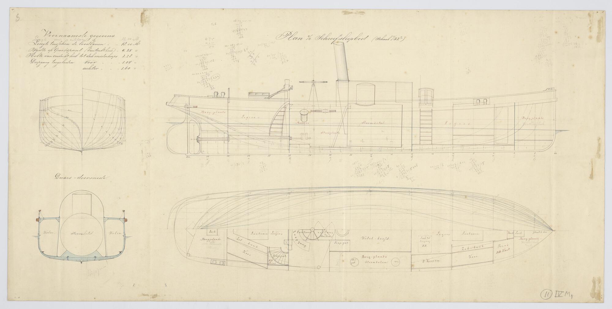 Verticale langsdoorsnede, bovenaanzicht, spantenraam...