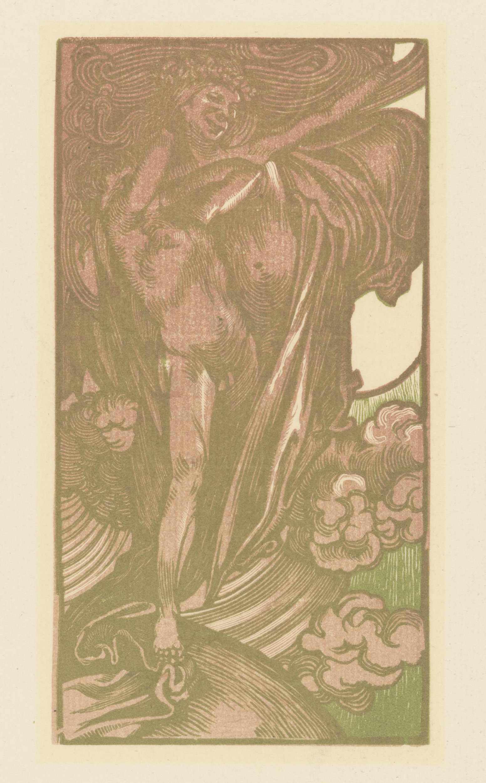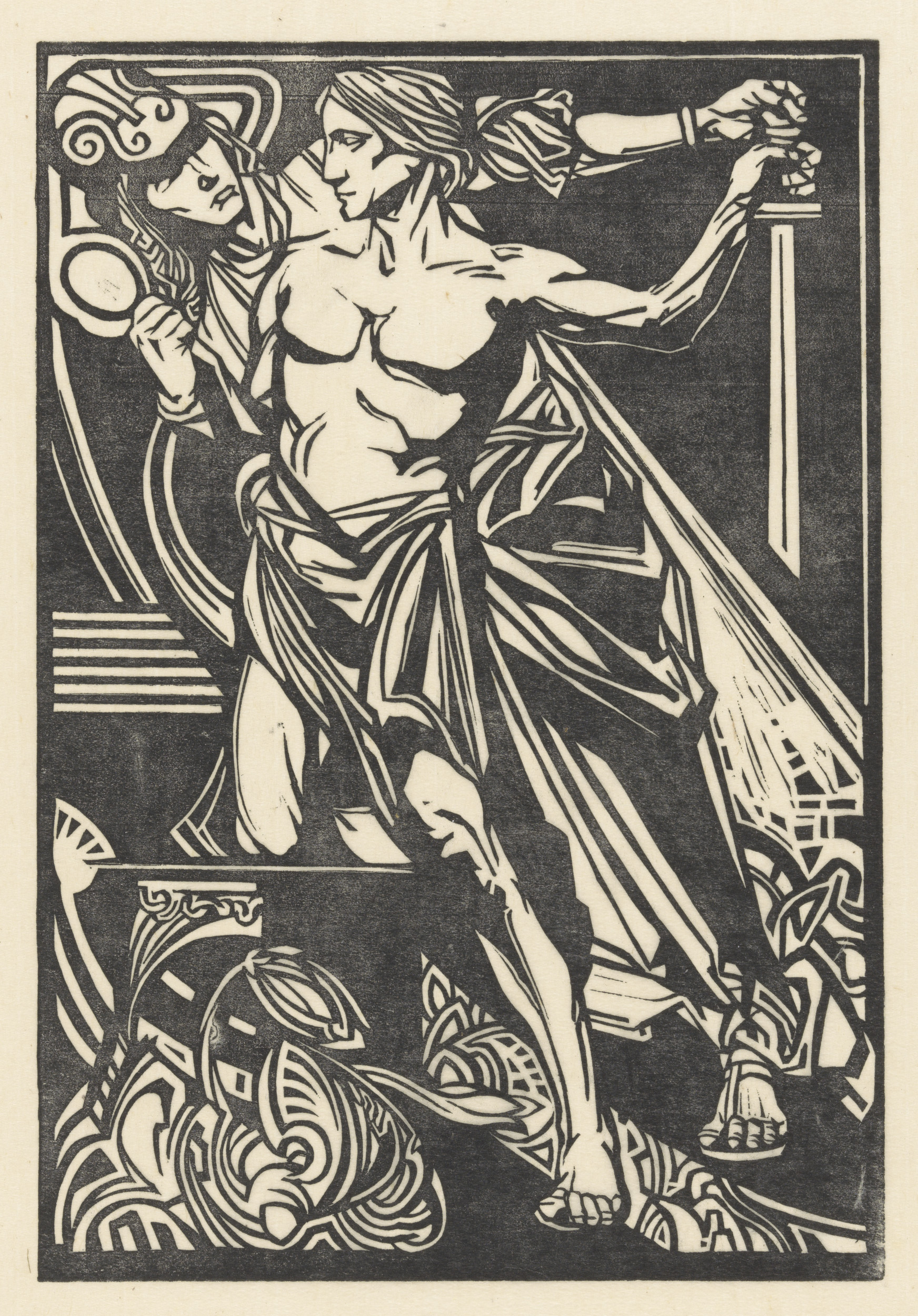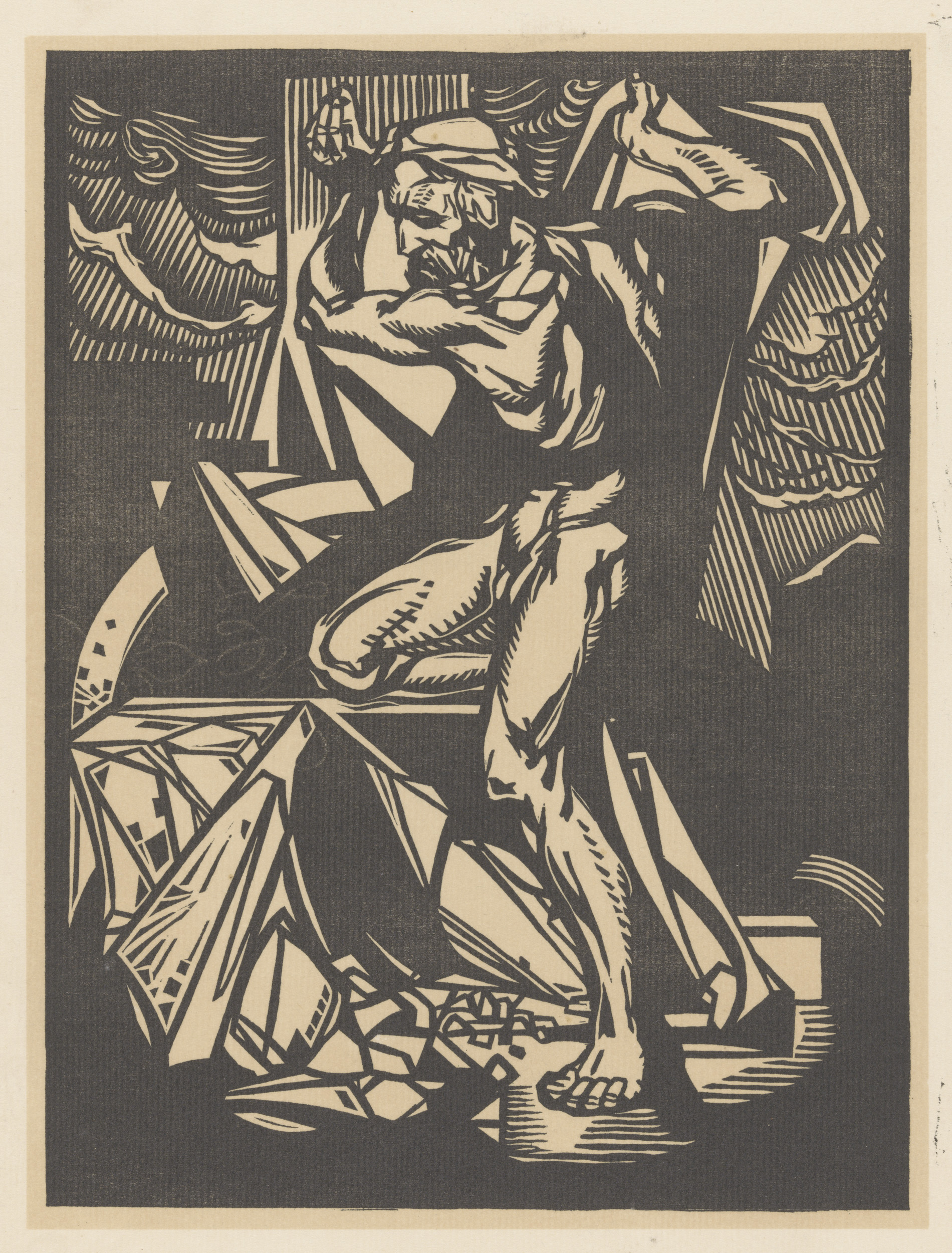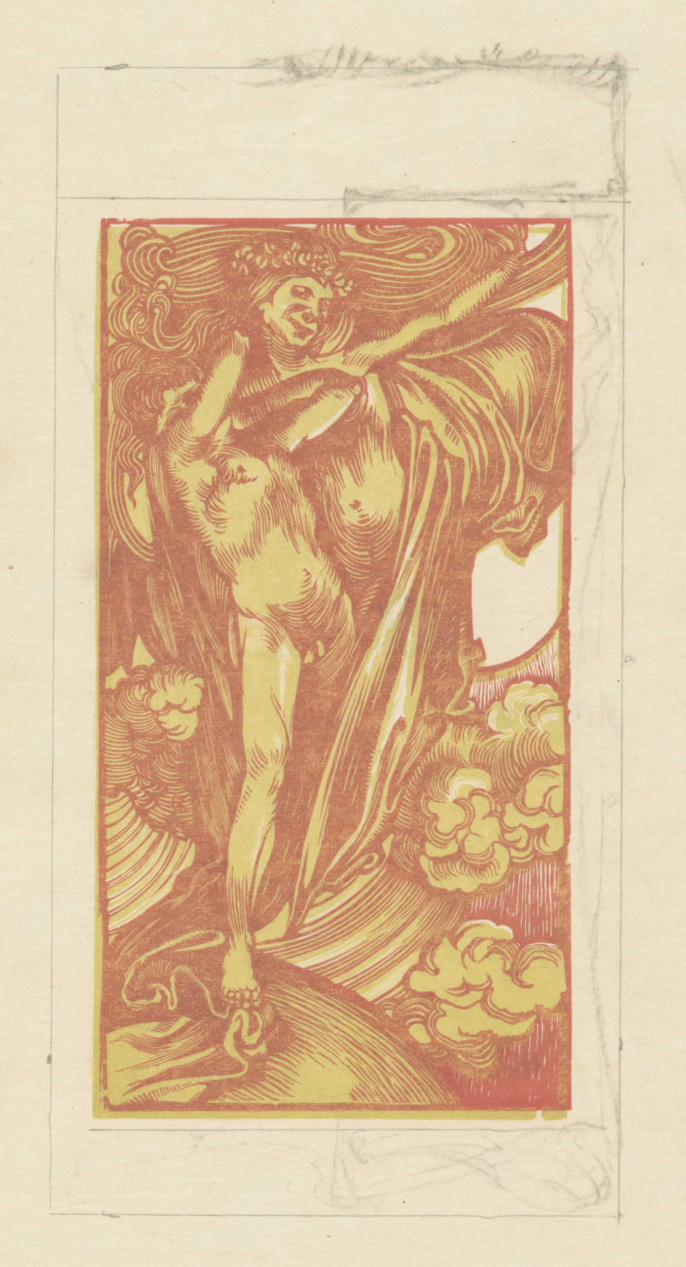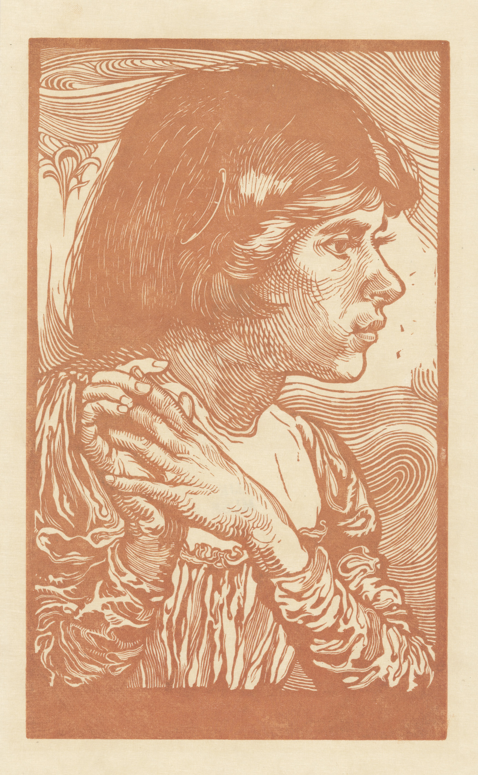 Vrouw met vier gebalde vuisten en driehoekig aureool