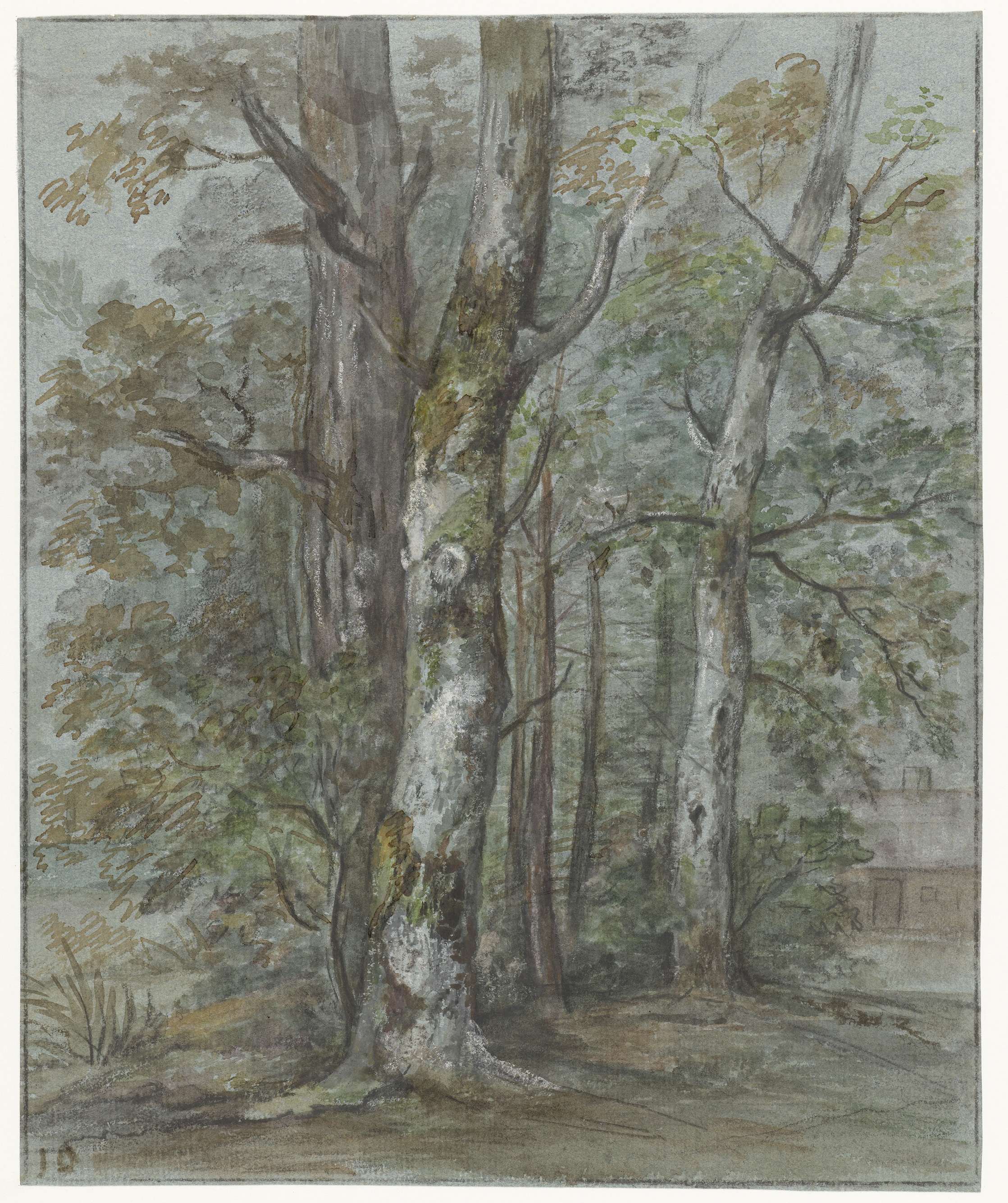 Heuvelachtig landschap met zware bomen en menselijke...