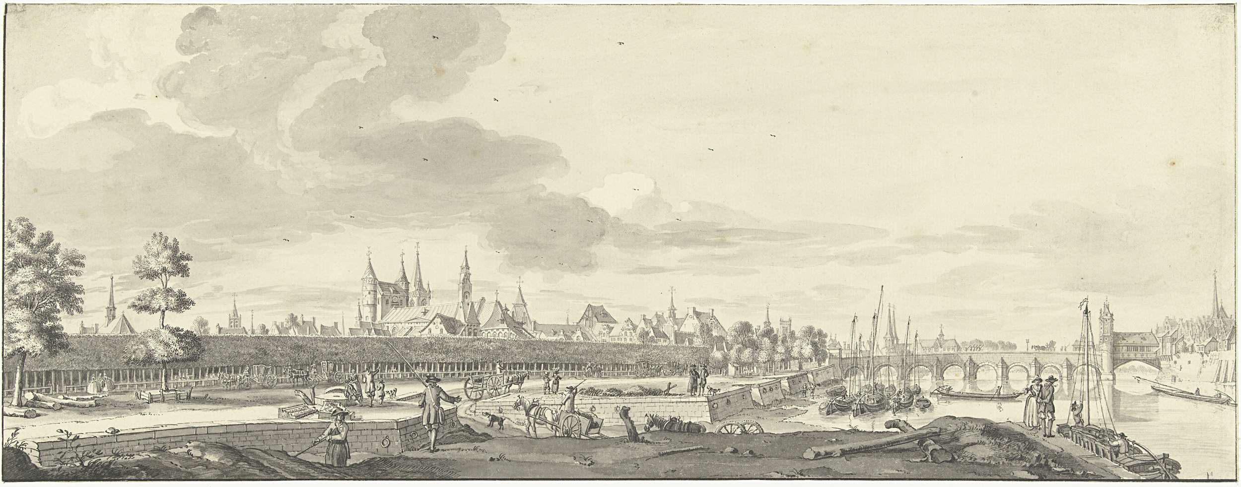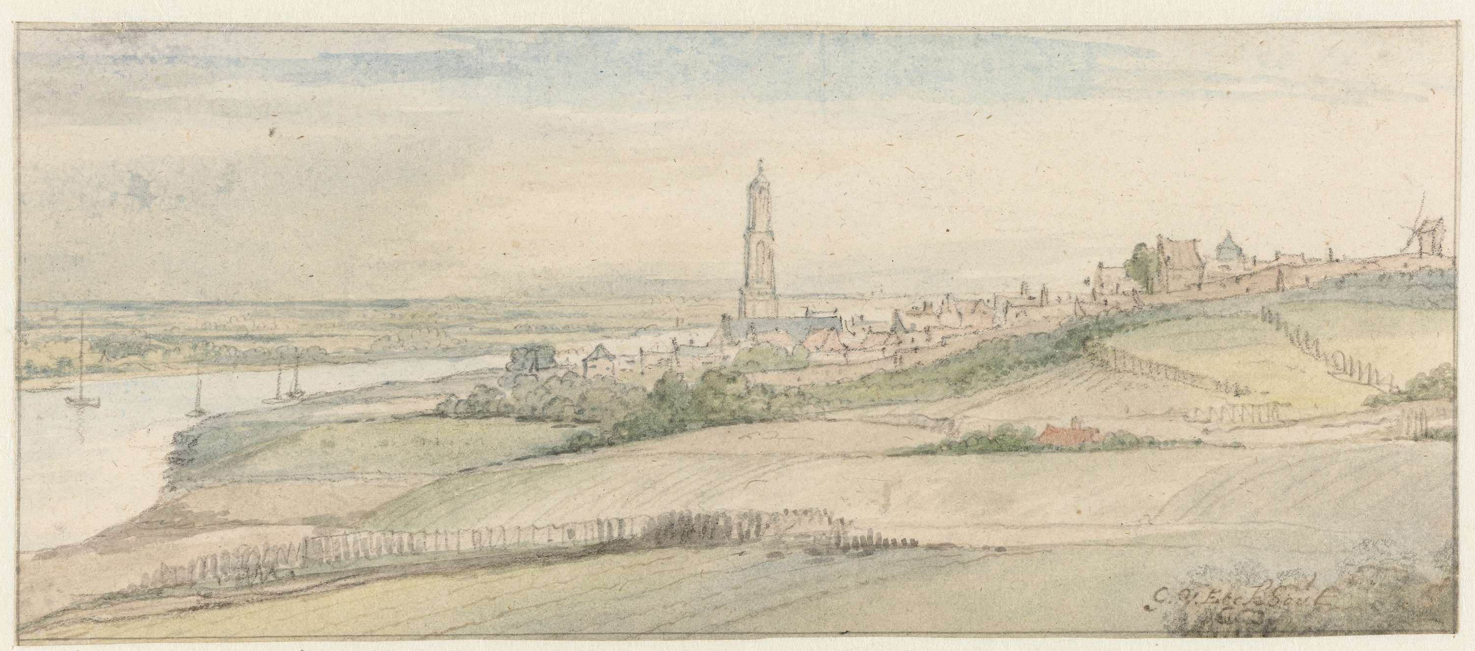 Gezicht op stadswal en stadspoort van Vianen