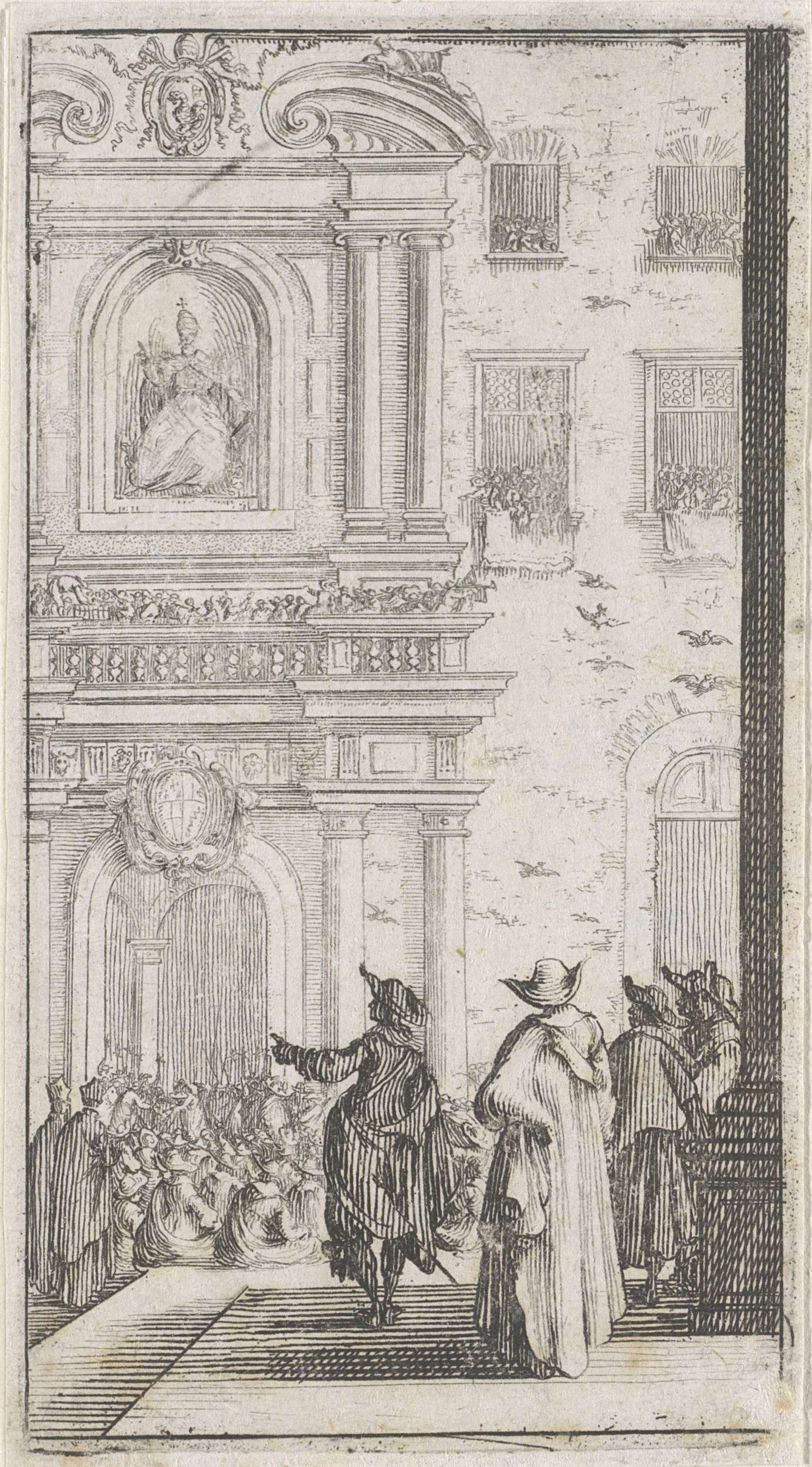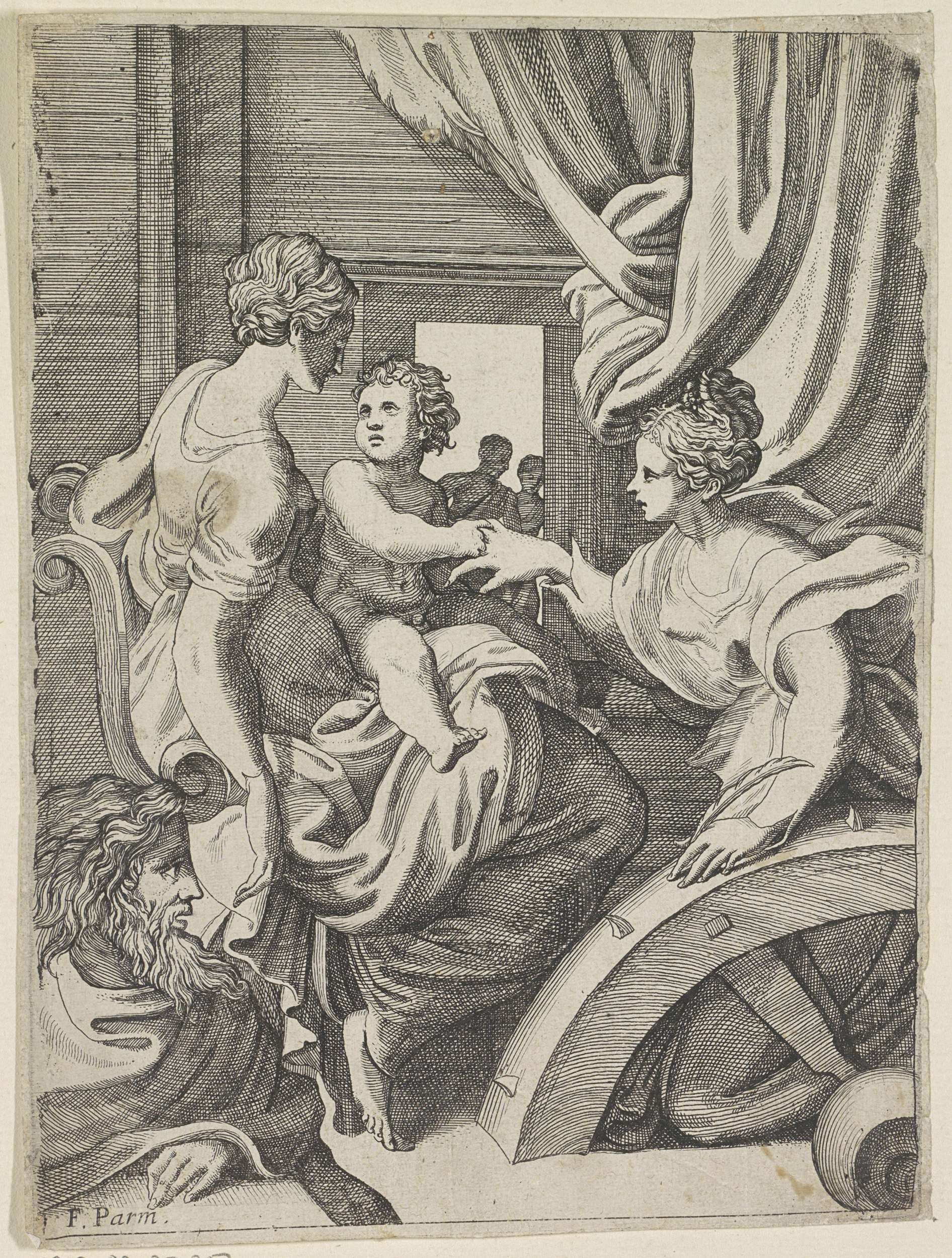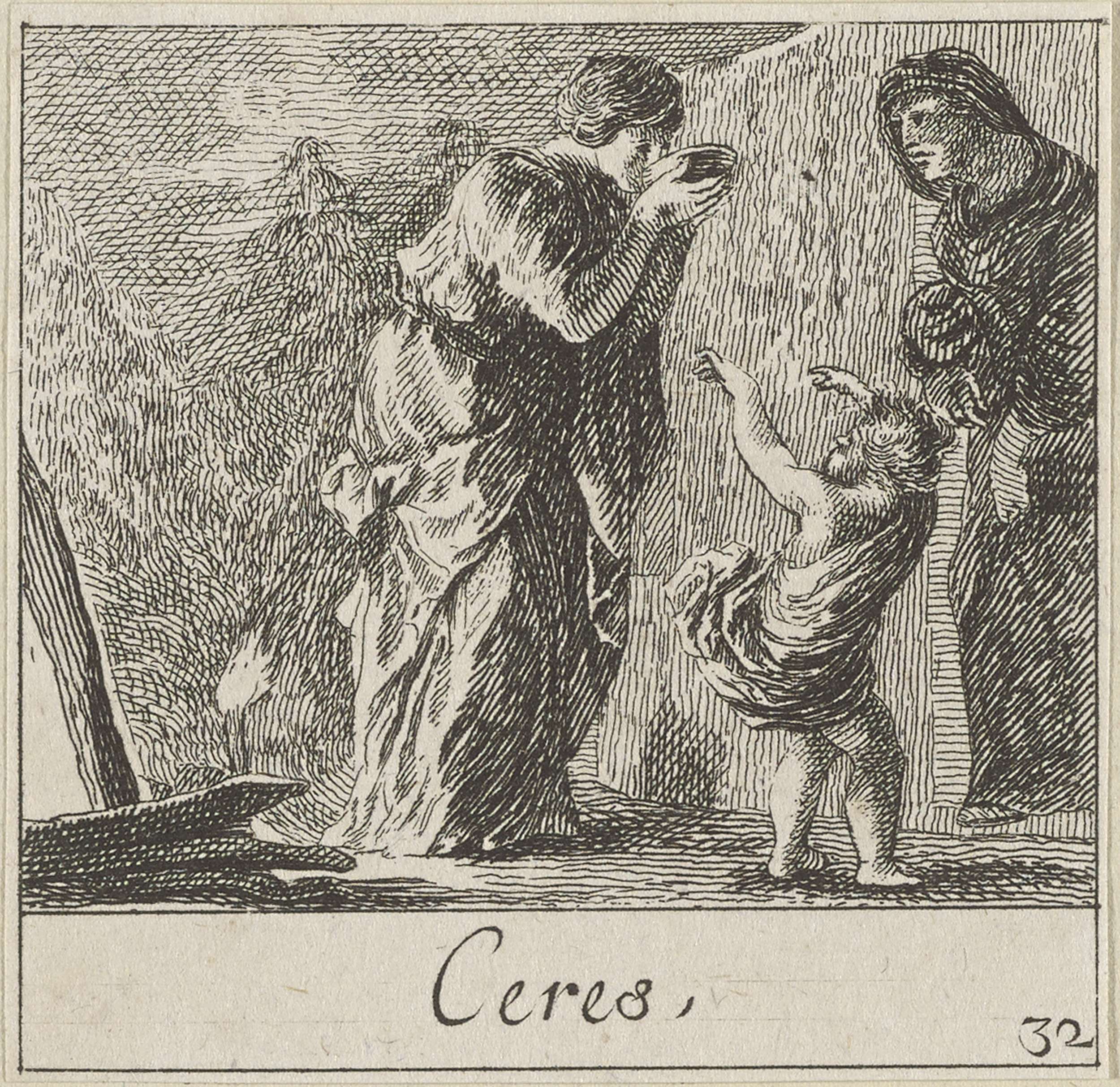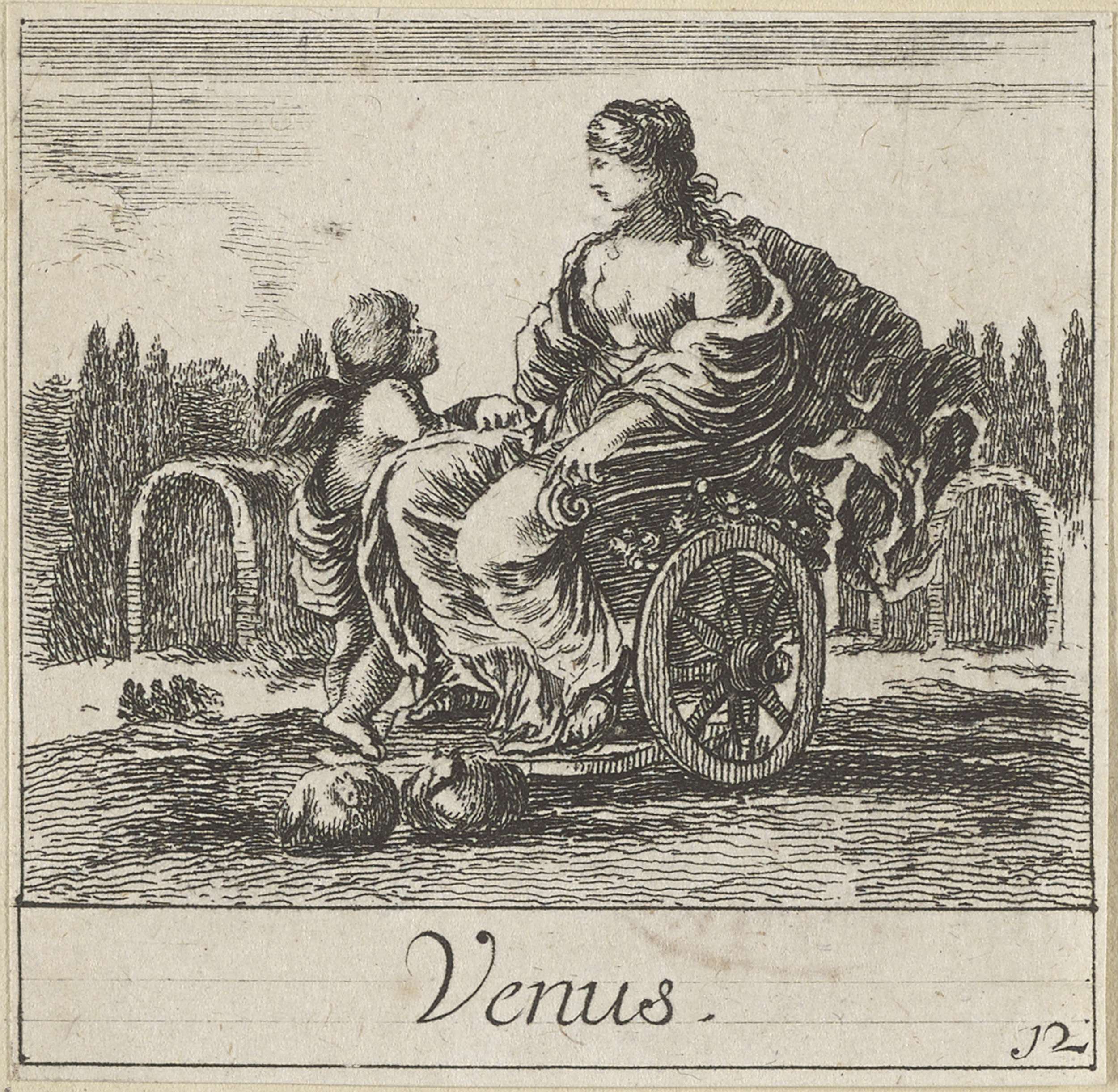 Vignet met zittende vrouw met sleutels, scepter, boe...