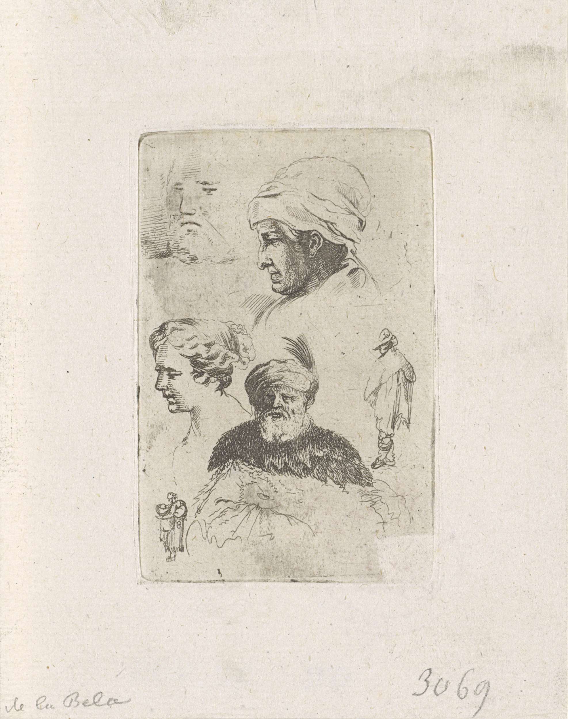 Vier studies van hoofden en twee staande figuren