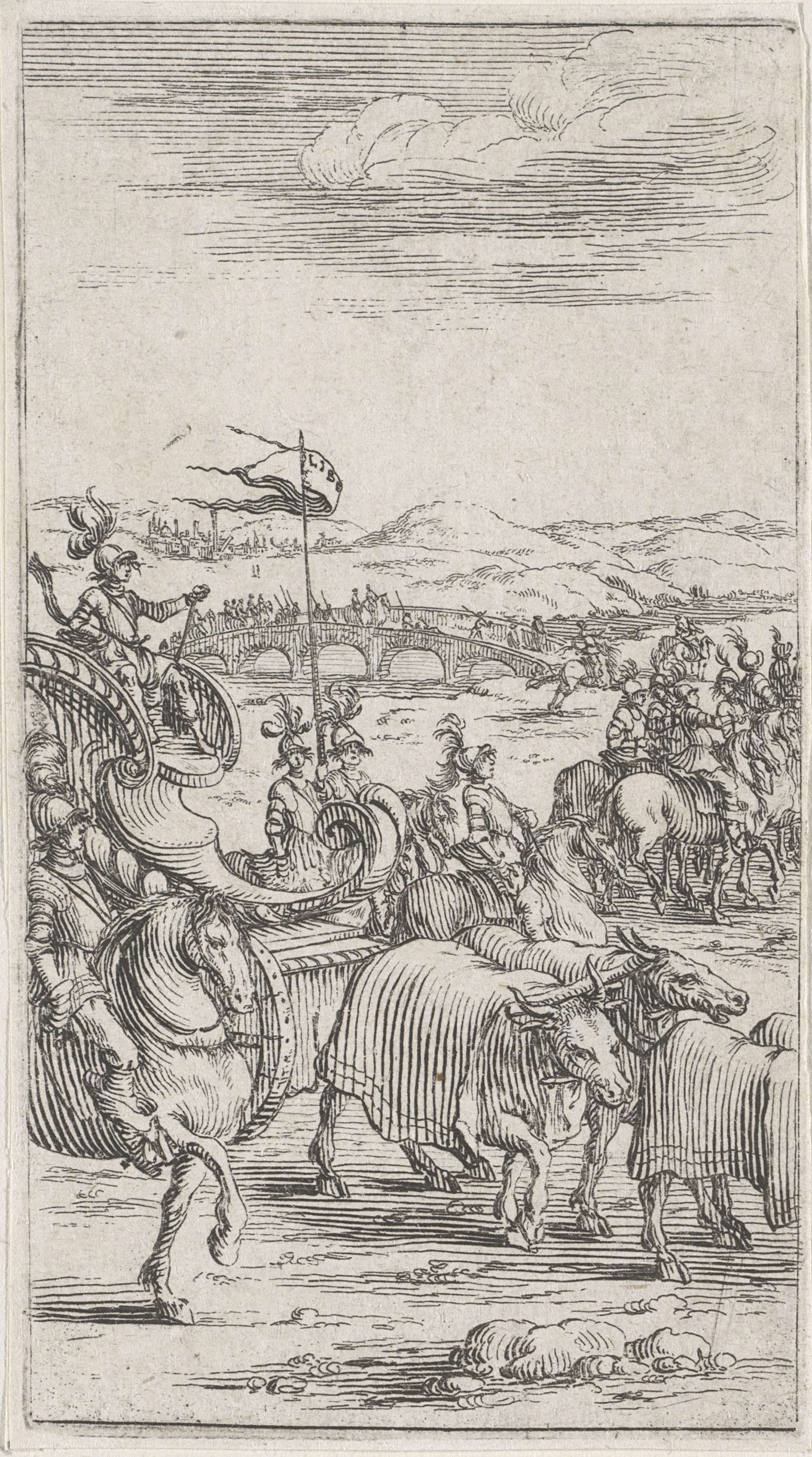 Landschap met soldaten en een kar voortgetrokken doo...