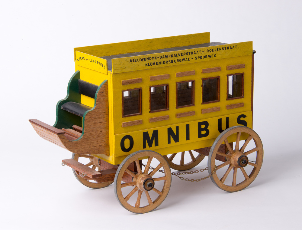 Paardenomnibus, miniatuur van hout en ijzer, vervaar...