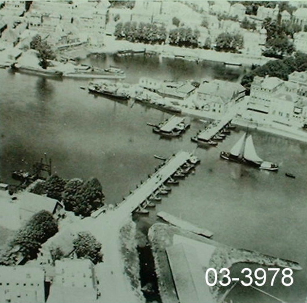 Zwart-wit luchtfoto van het dorp Lobith. ca. 1960-1990.