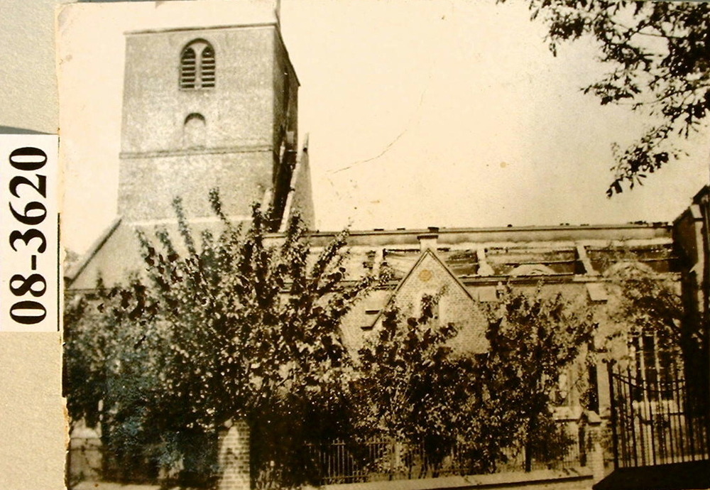 Opname van de in 1943 verwoeste stads parochiekerk v...