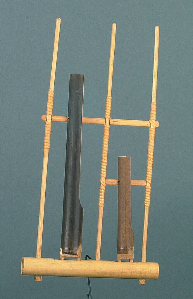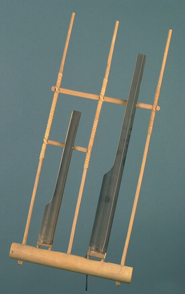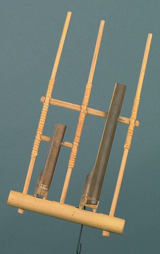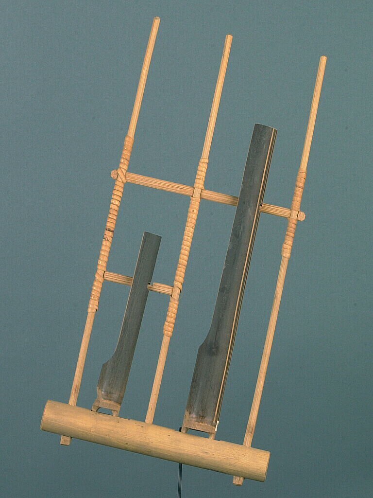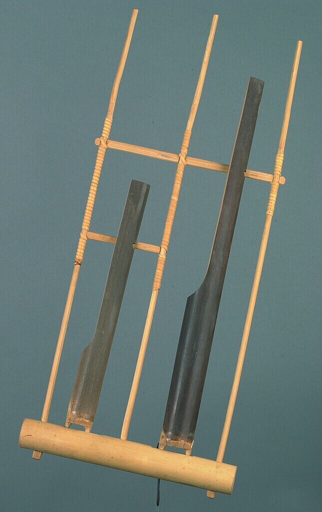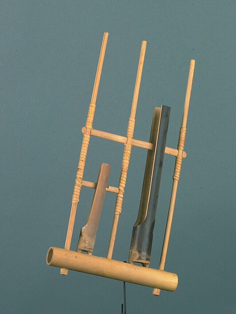 Bamboe juk van een pikolan (a) aan (de uiteinden twe...