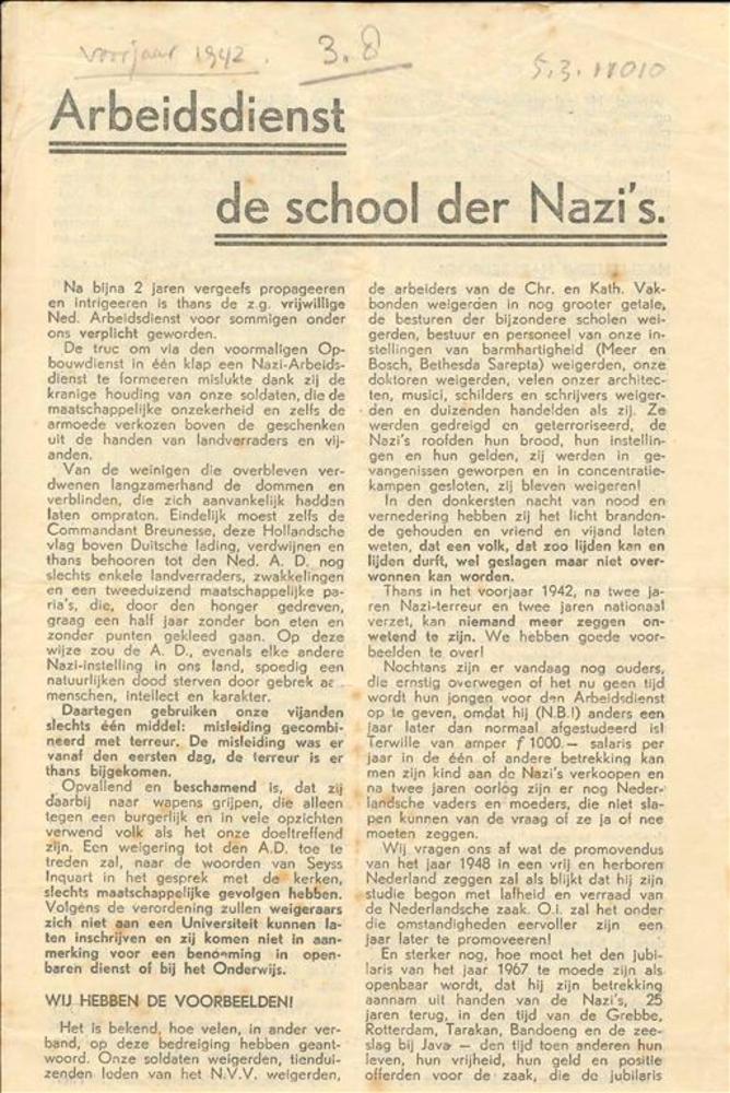 Pamflet: "Arbeidsdienst, de school der Nazi's".
