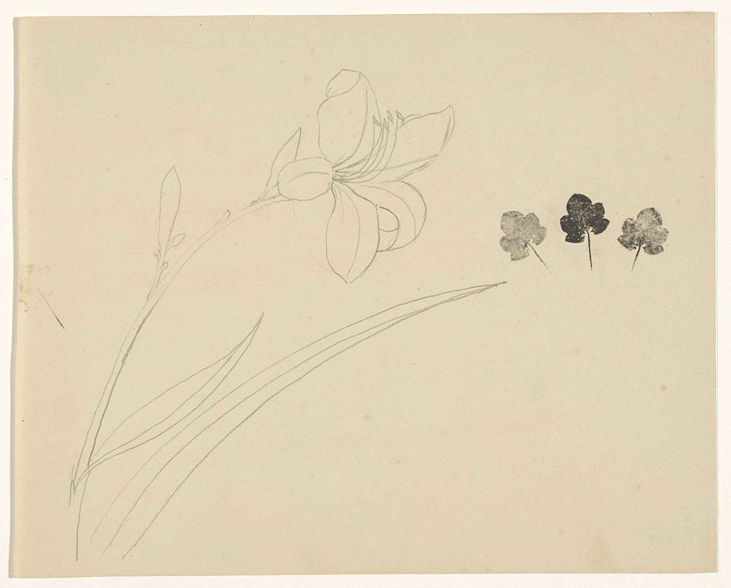 Een lelie en drie afdrukken van een blad