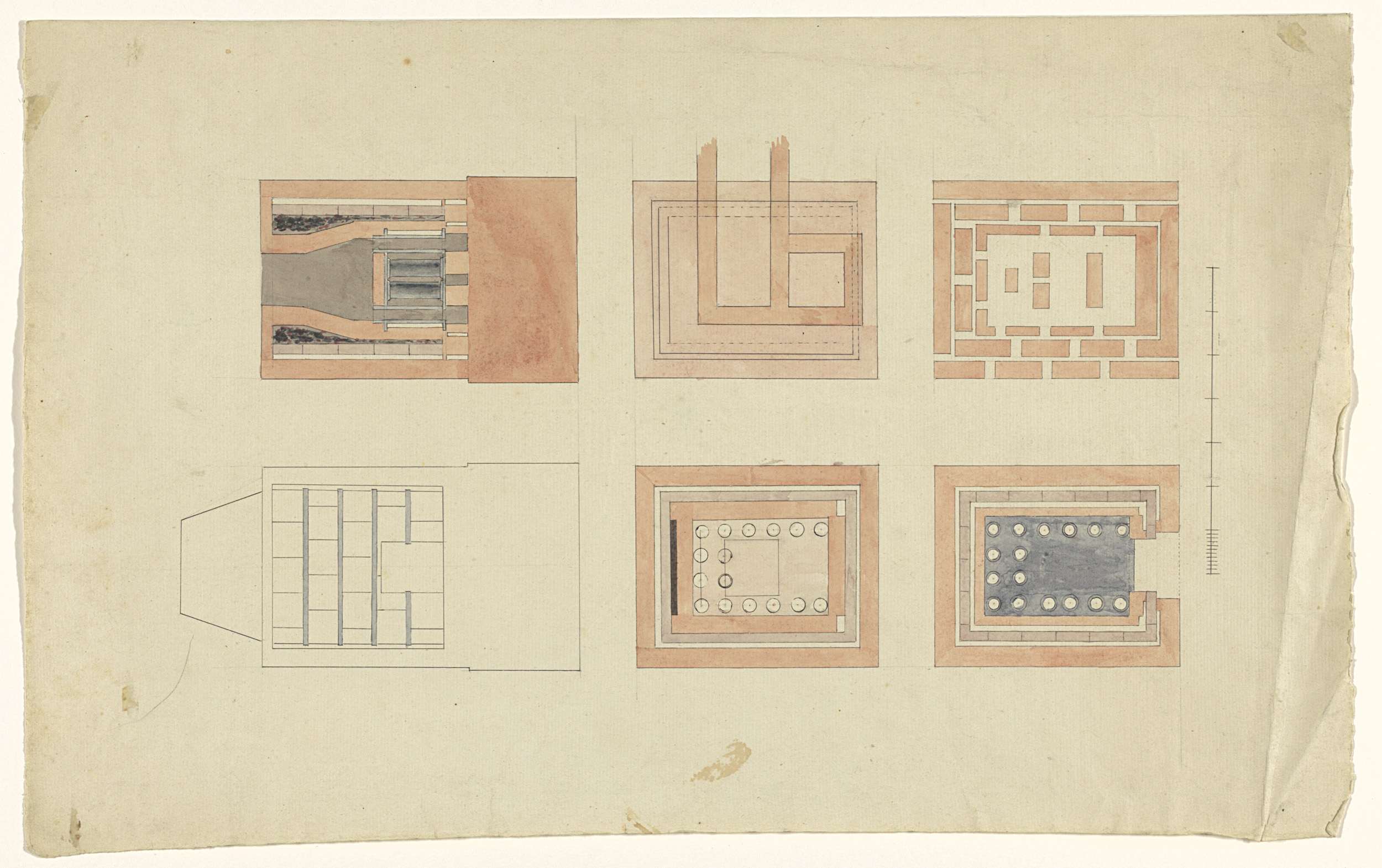 Aanzicht, doorsnedes en plattegronden van een oven