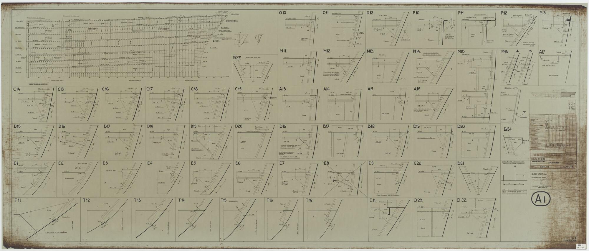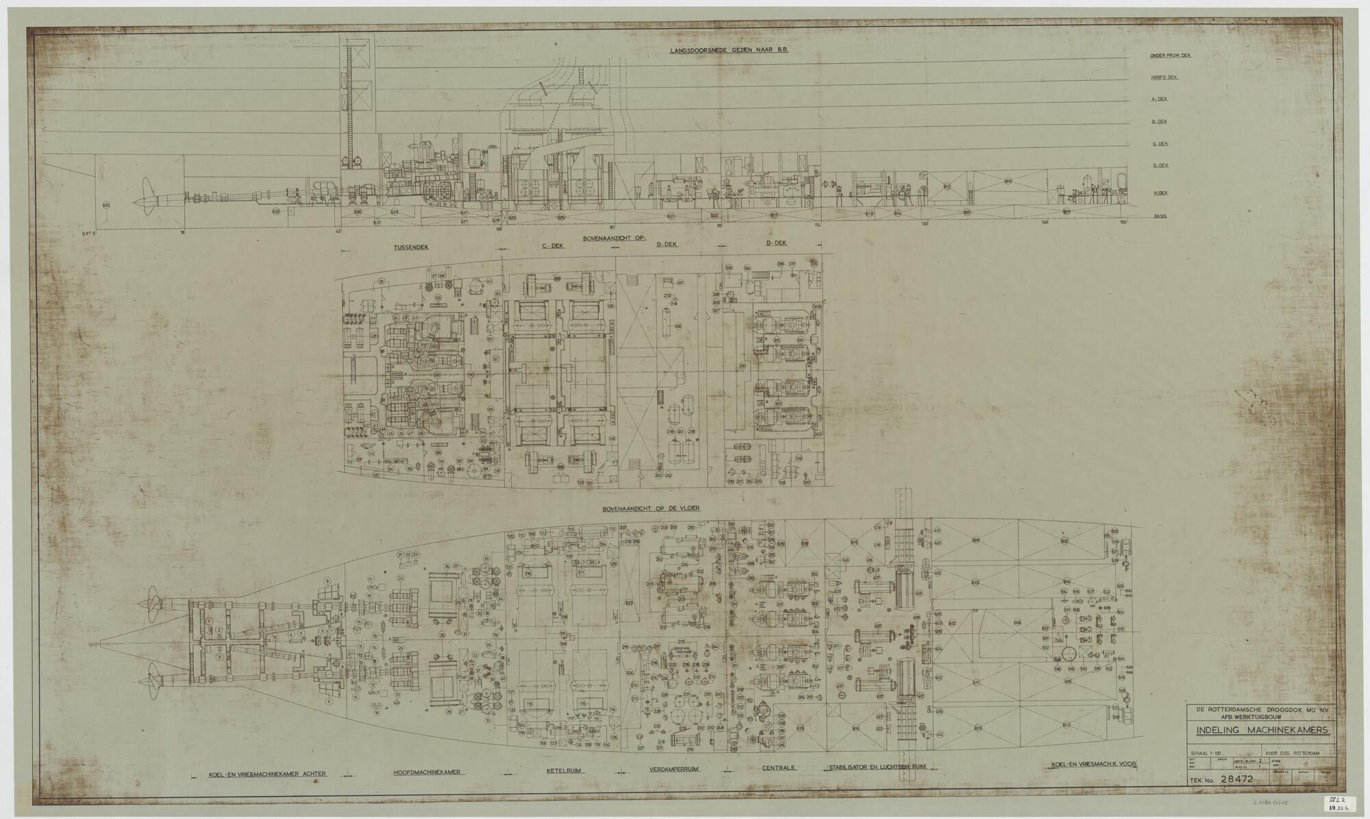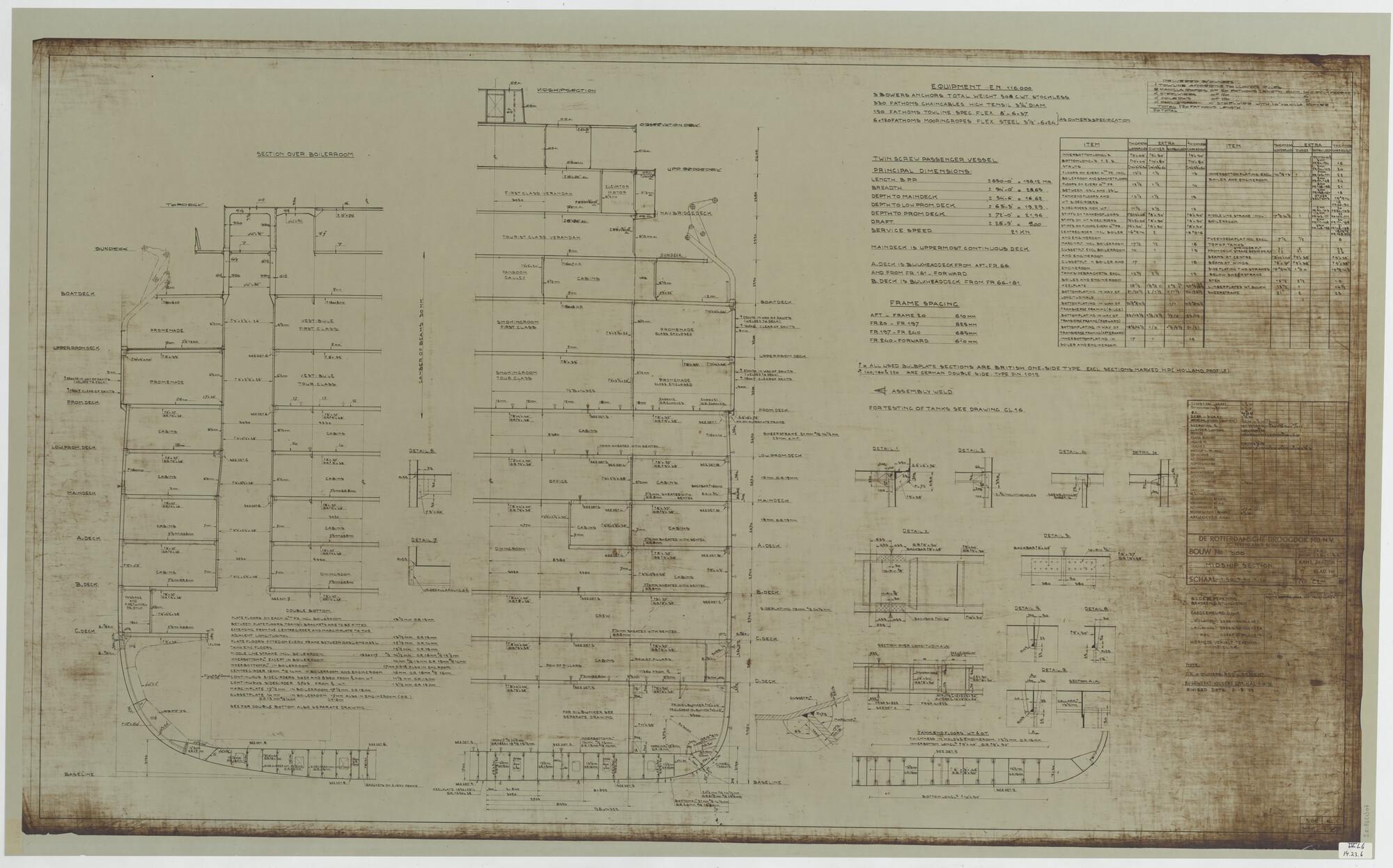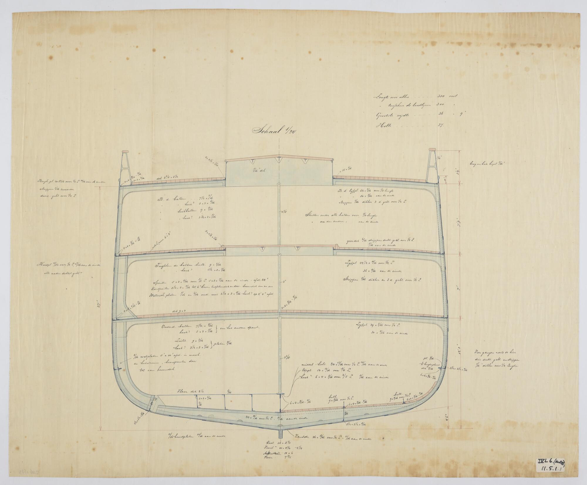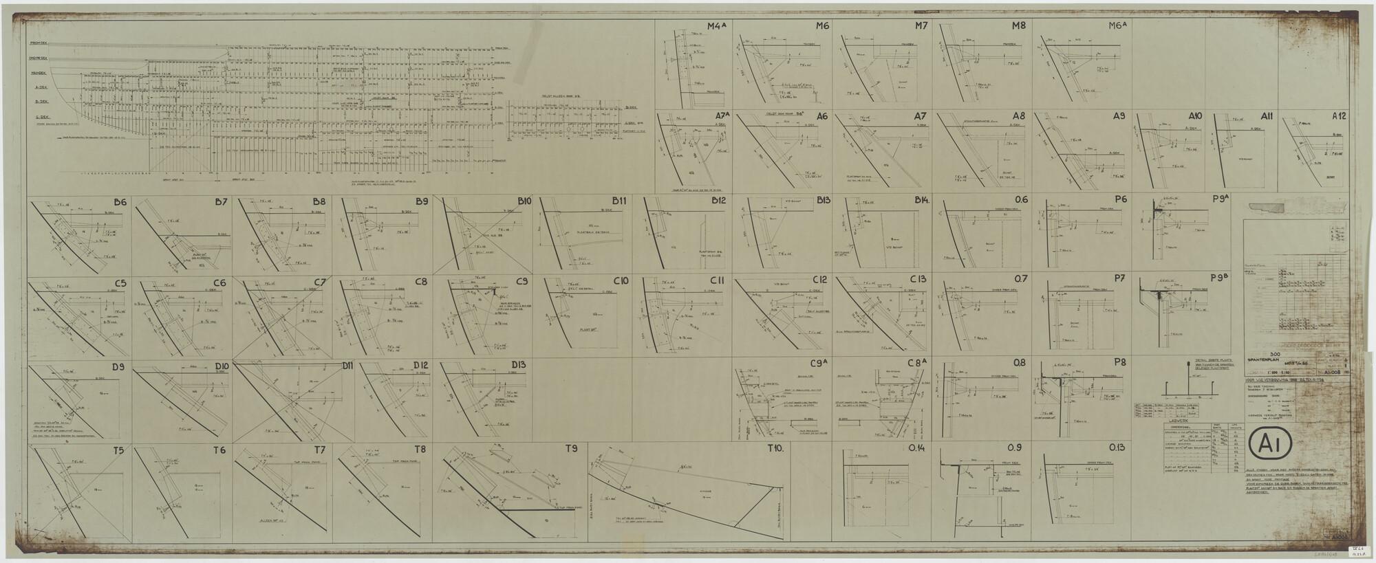 Verticale langsdoorsnede, bovenaanzicht, spantenraam...