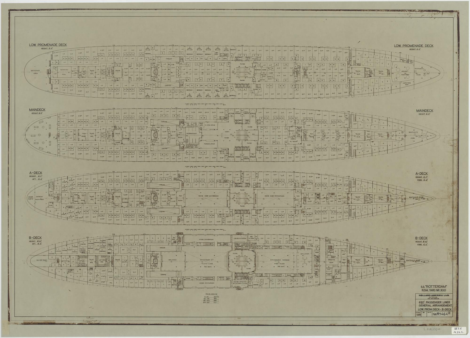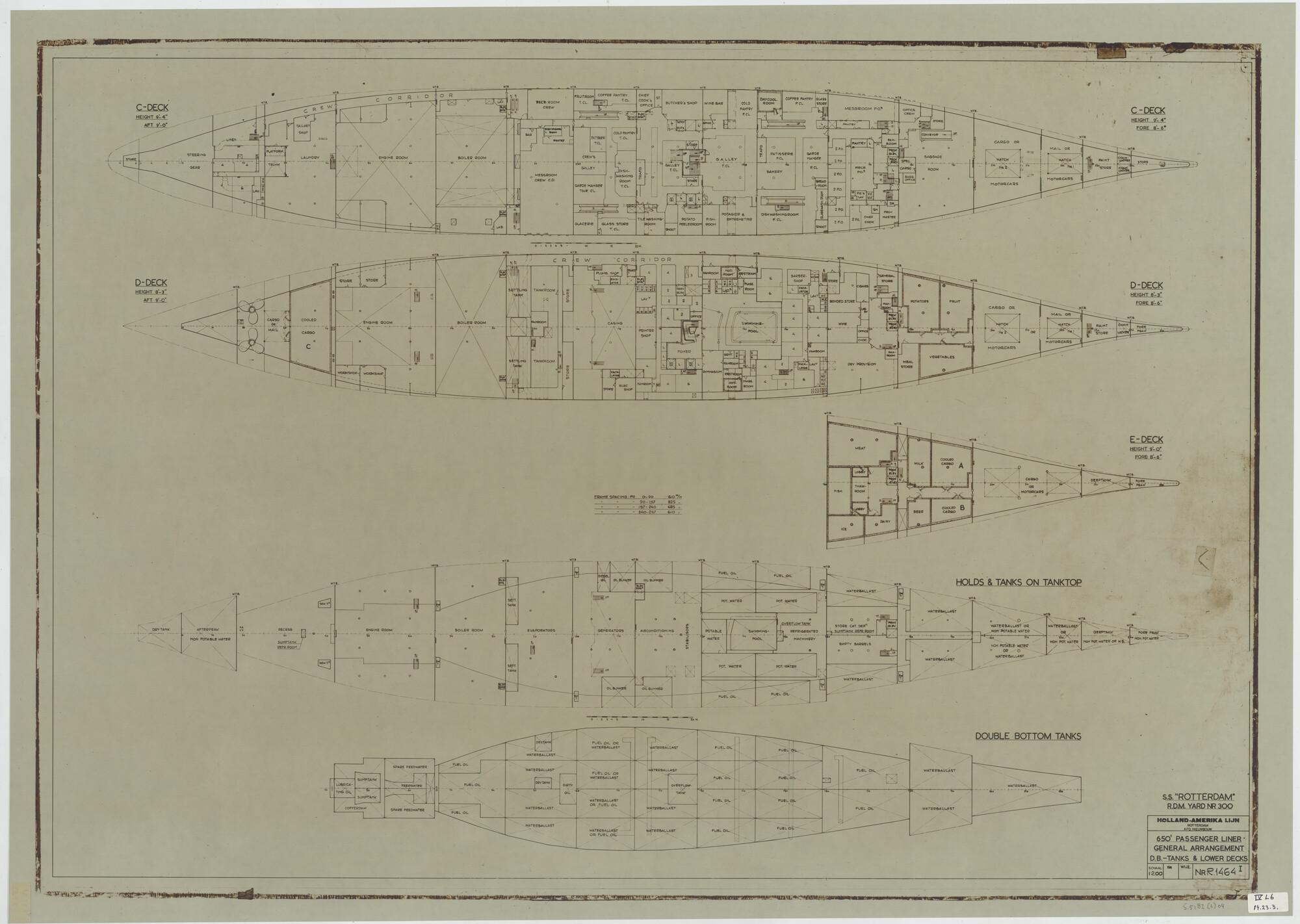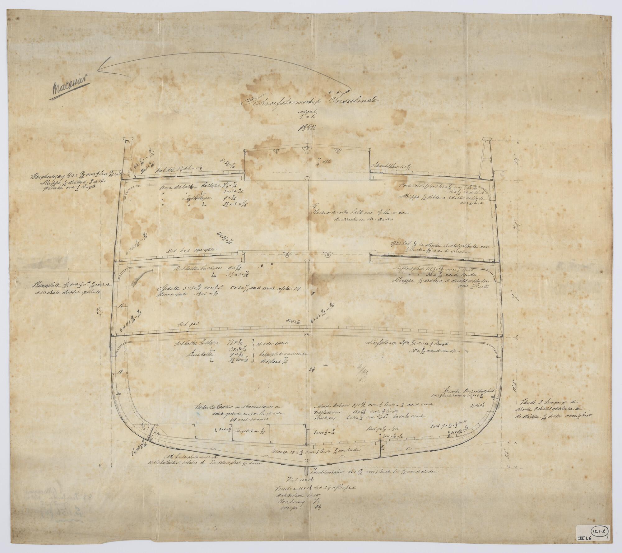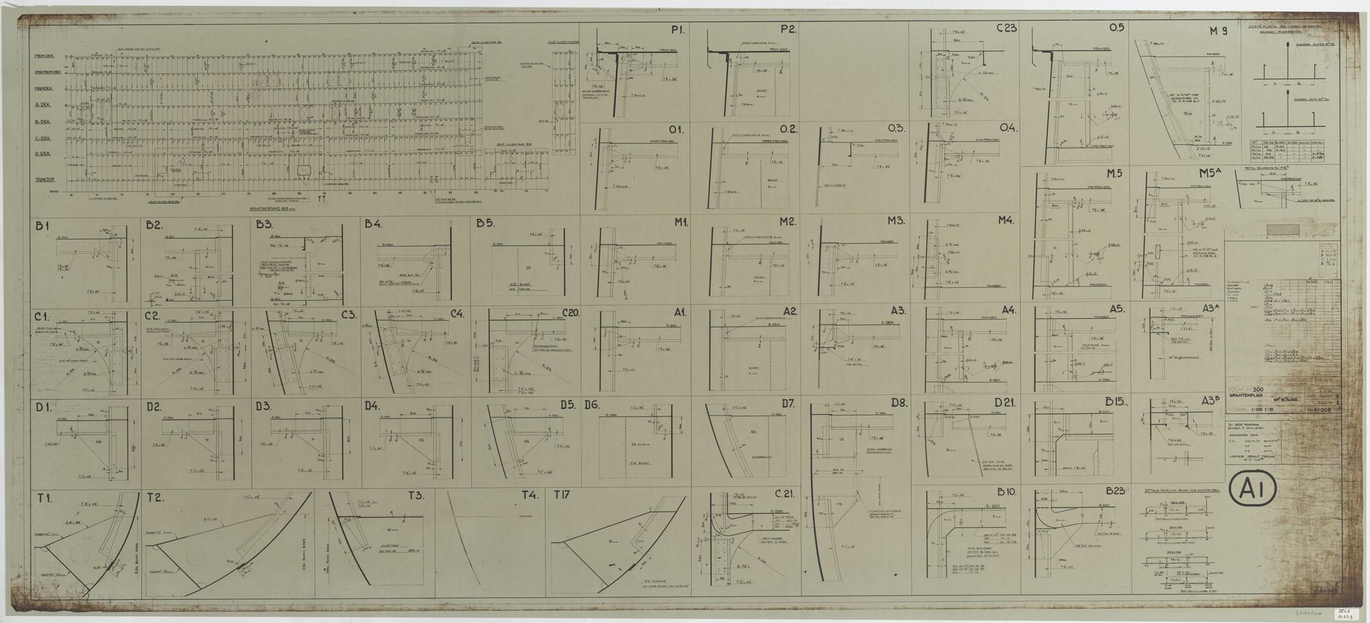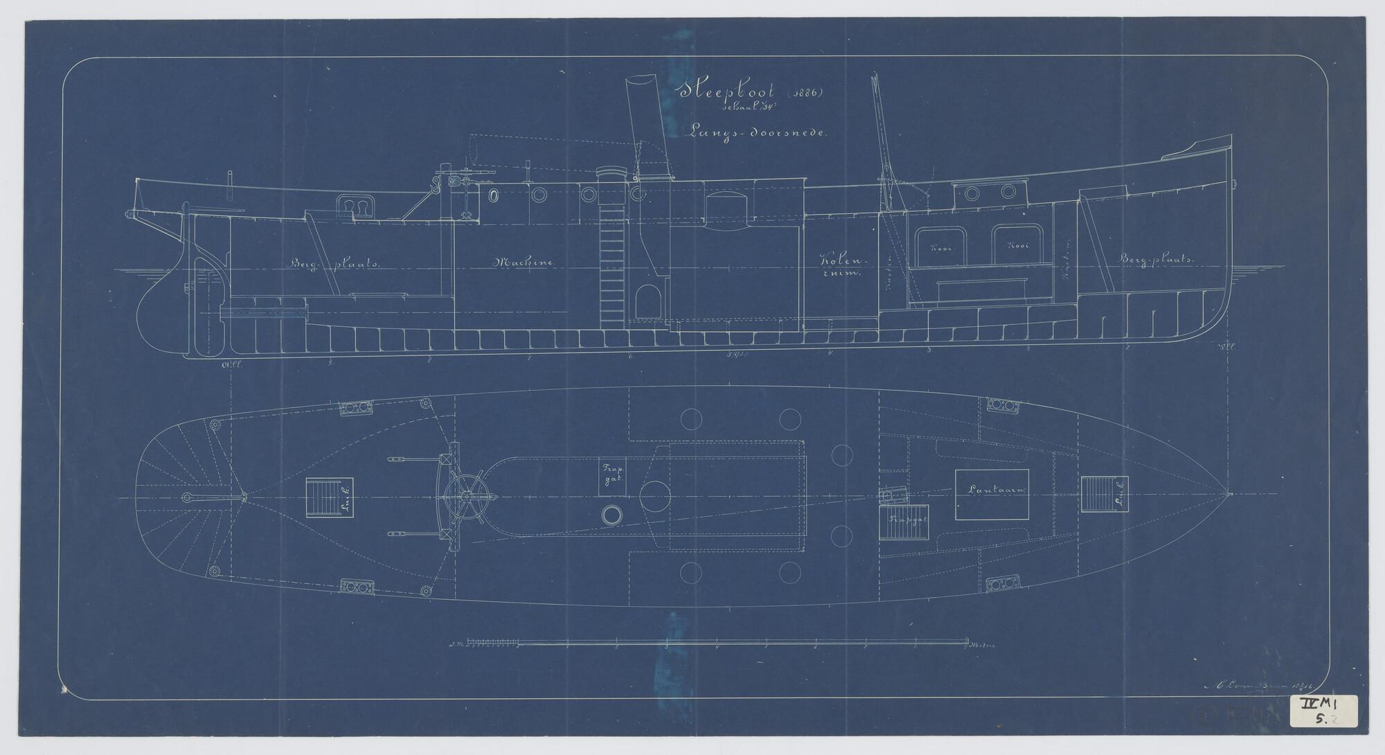 Verticale langsdoorsnede, bovenaanzicht, spantenraam...
